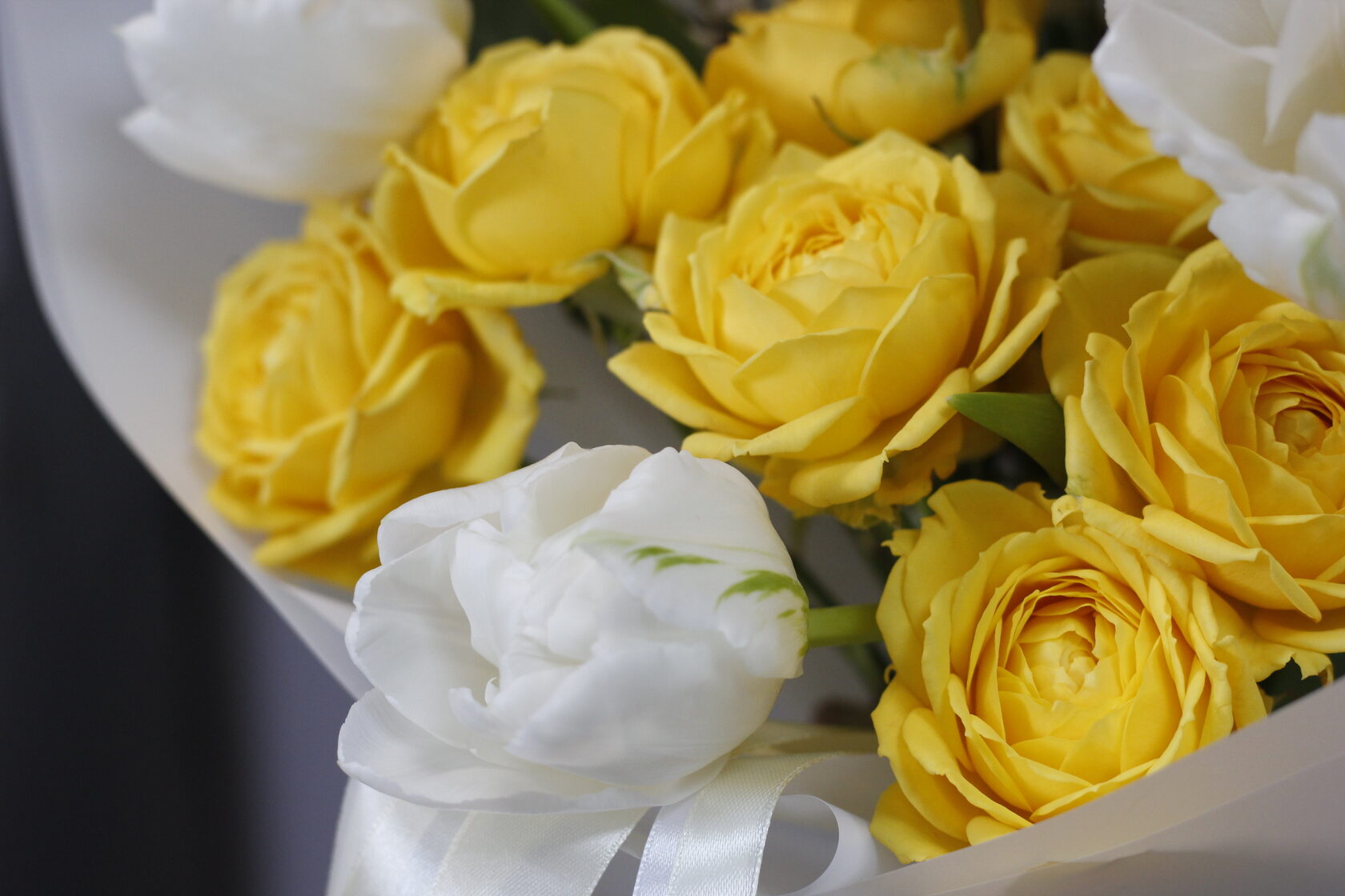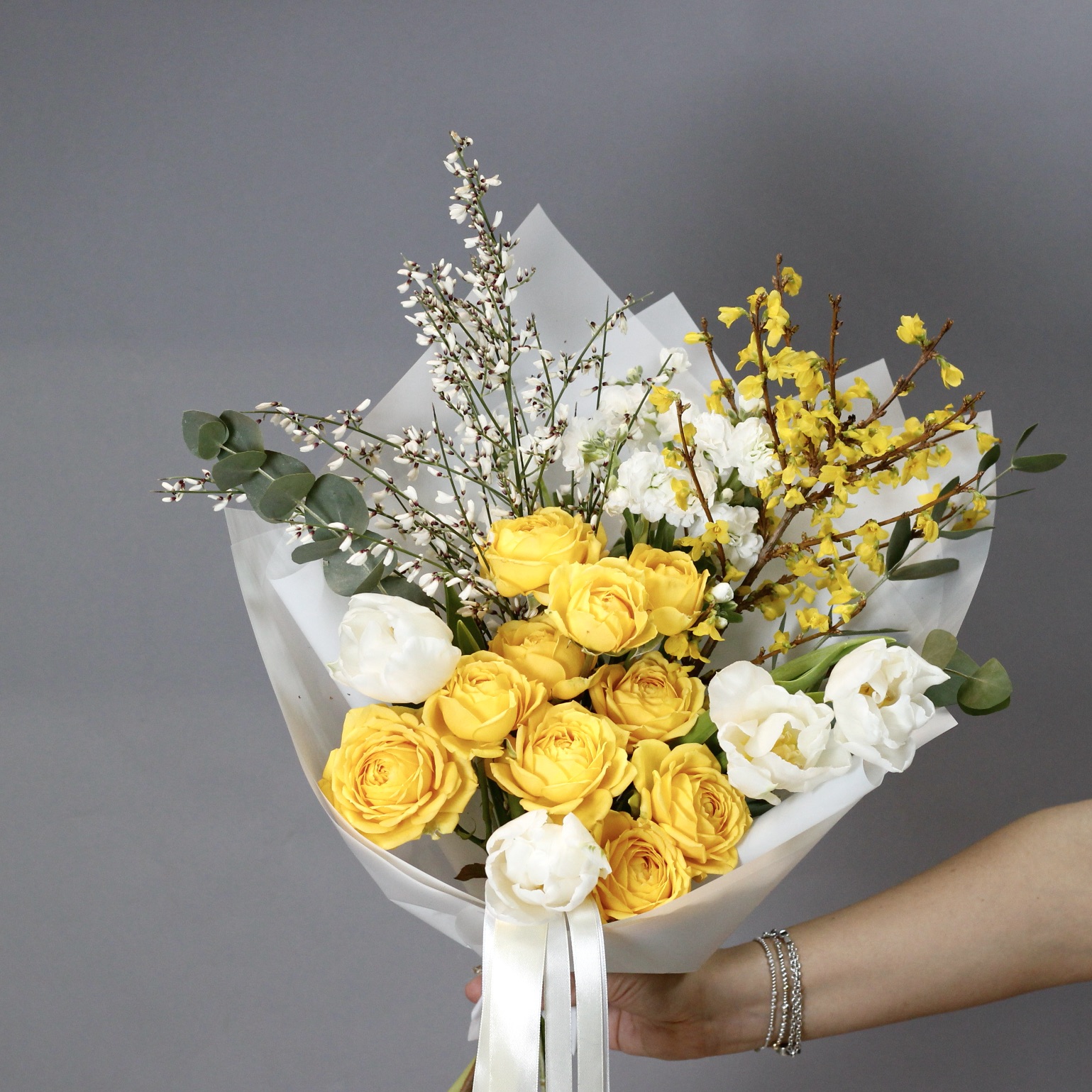 В составе: лимонные пионовидные розы, маттиола, цветущая форзиция, тюльпаны, гениста, эвкалипт