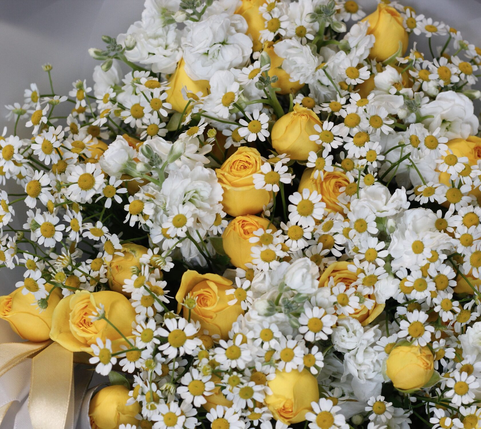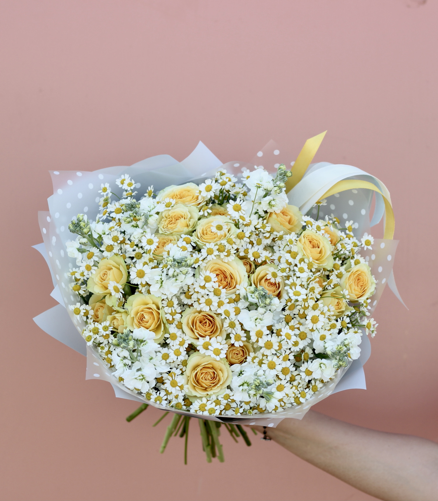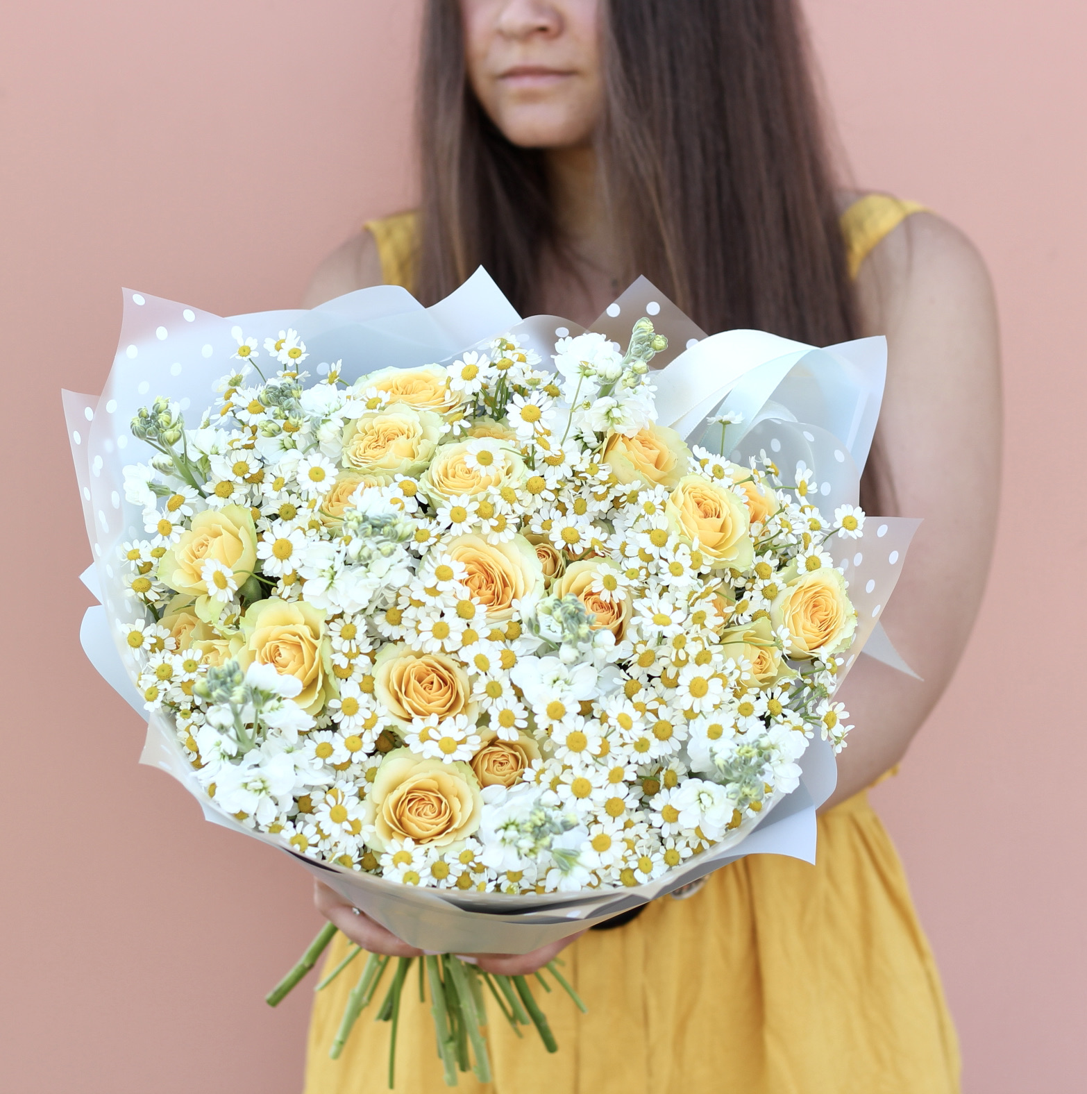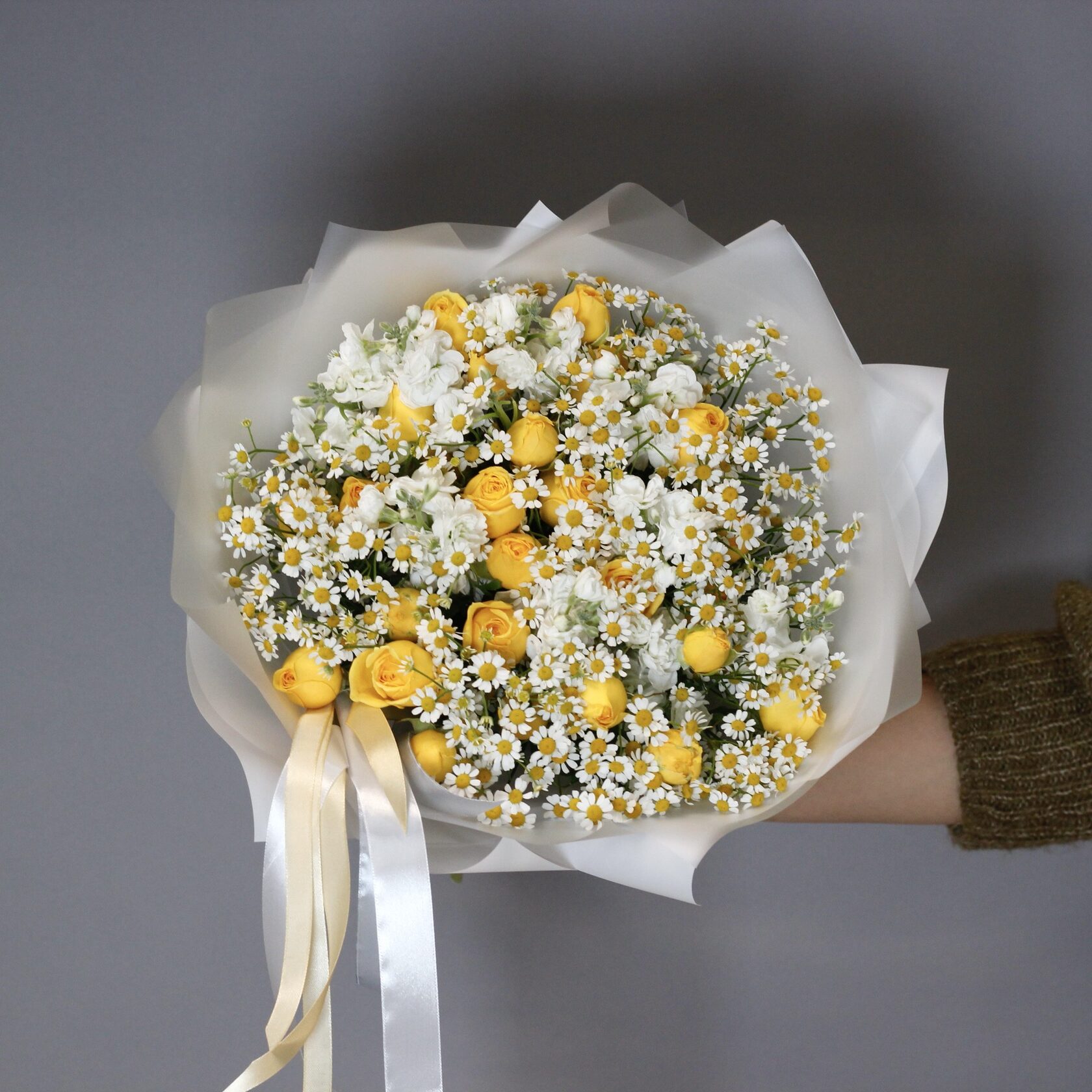 В составе актуальные летние цветы: кустовые лимонные розы, маттиола, ромашки