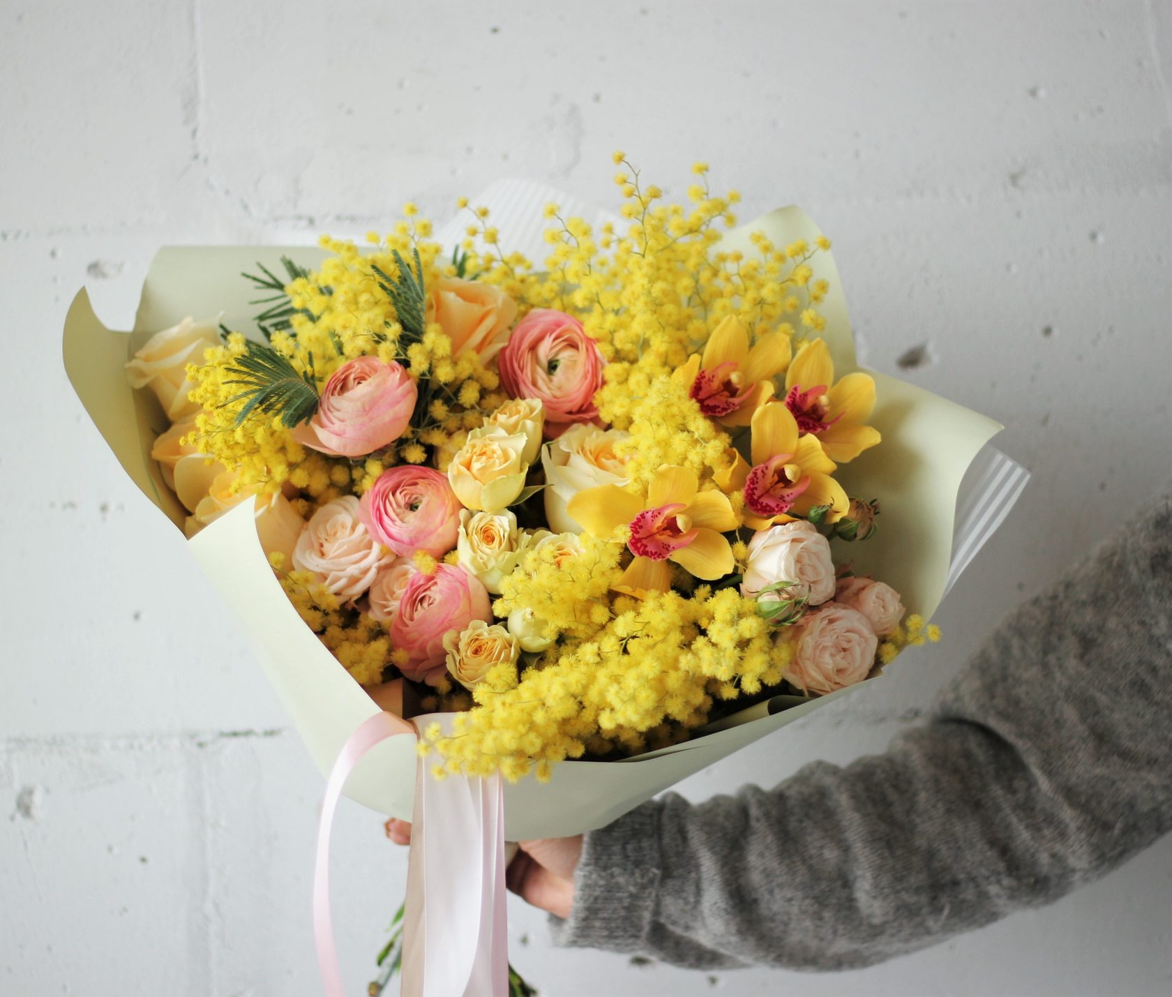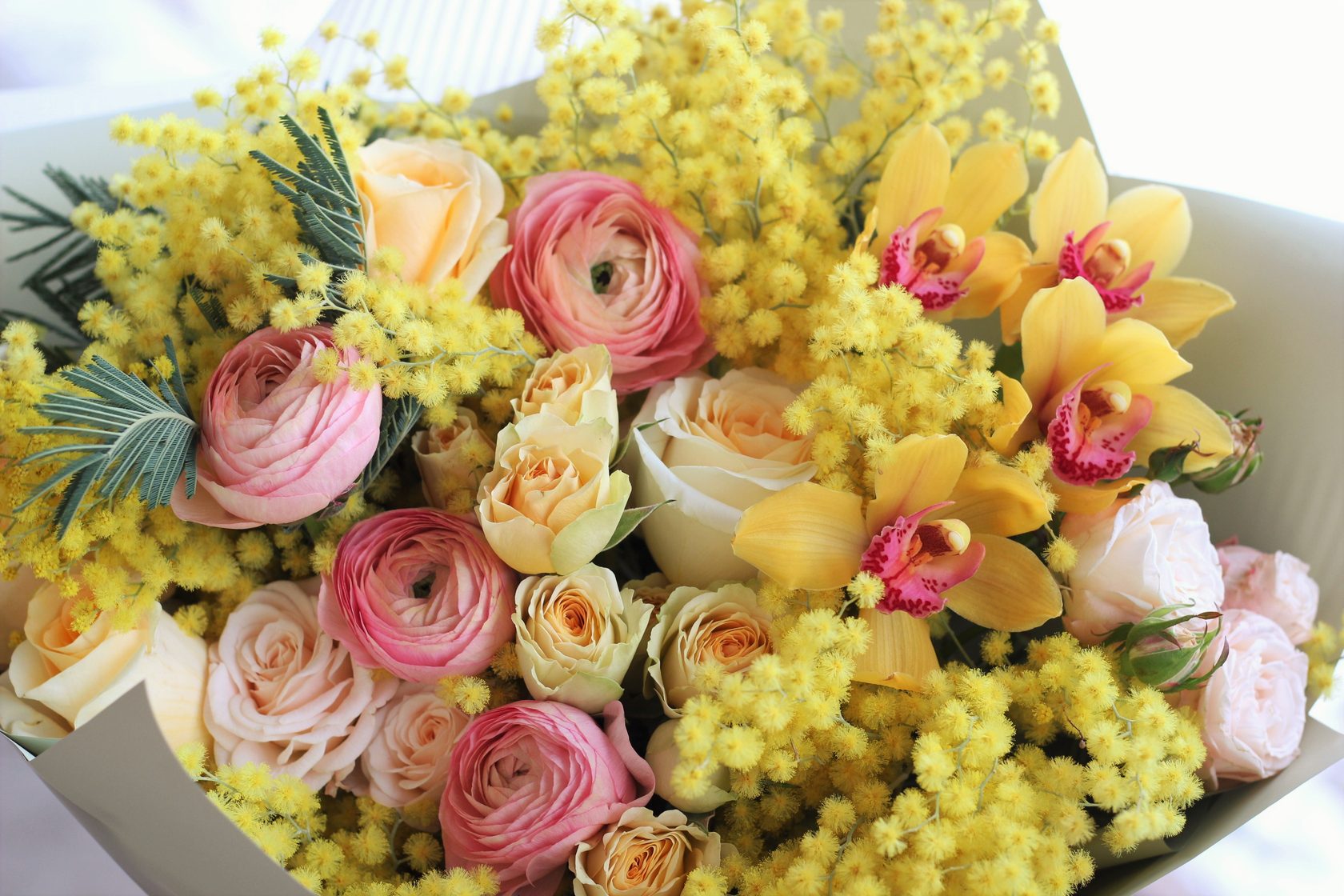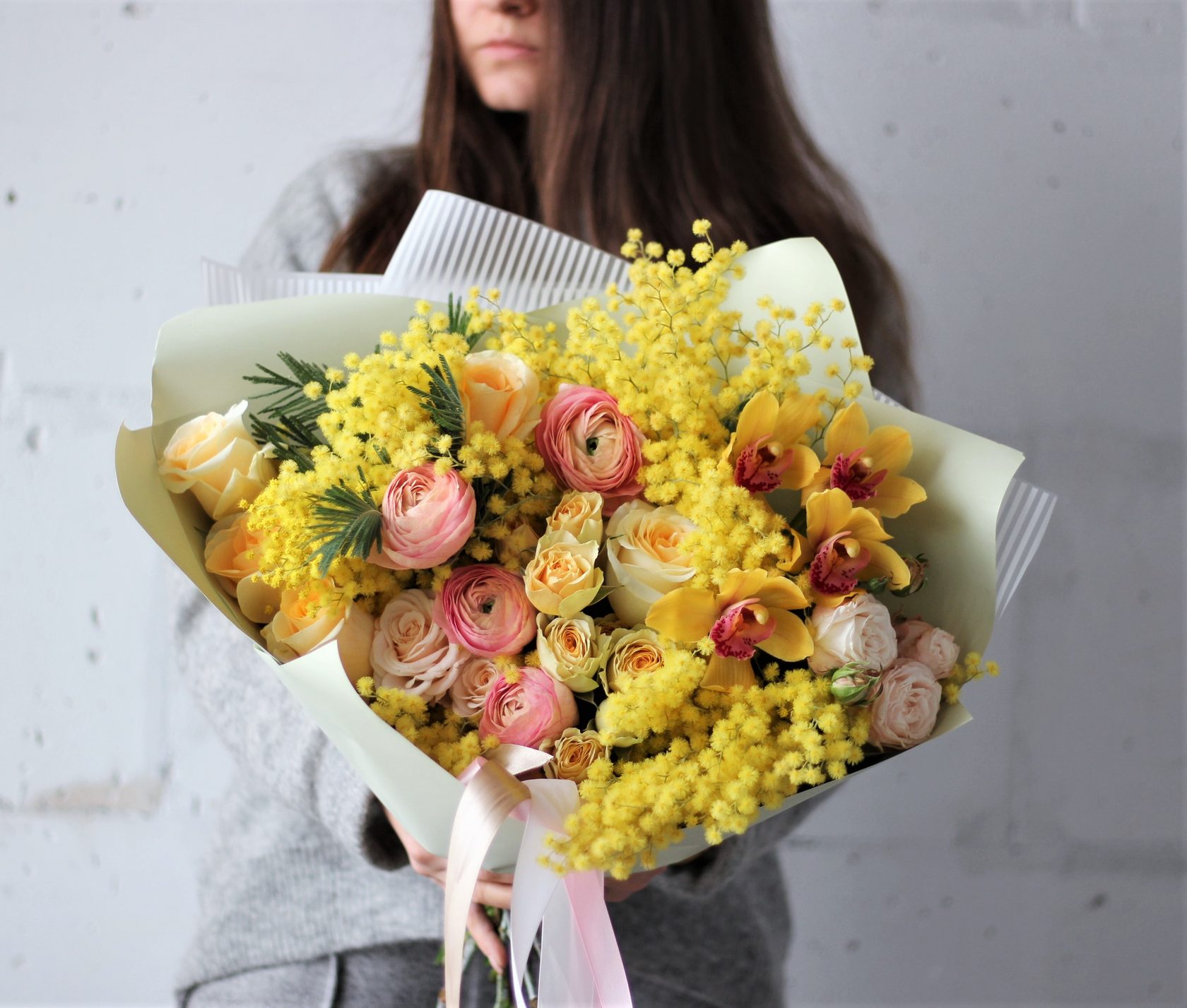 В составе: ароматная итальянская мимоза, ранункулюсы, орхидеи, пионовидные розы