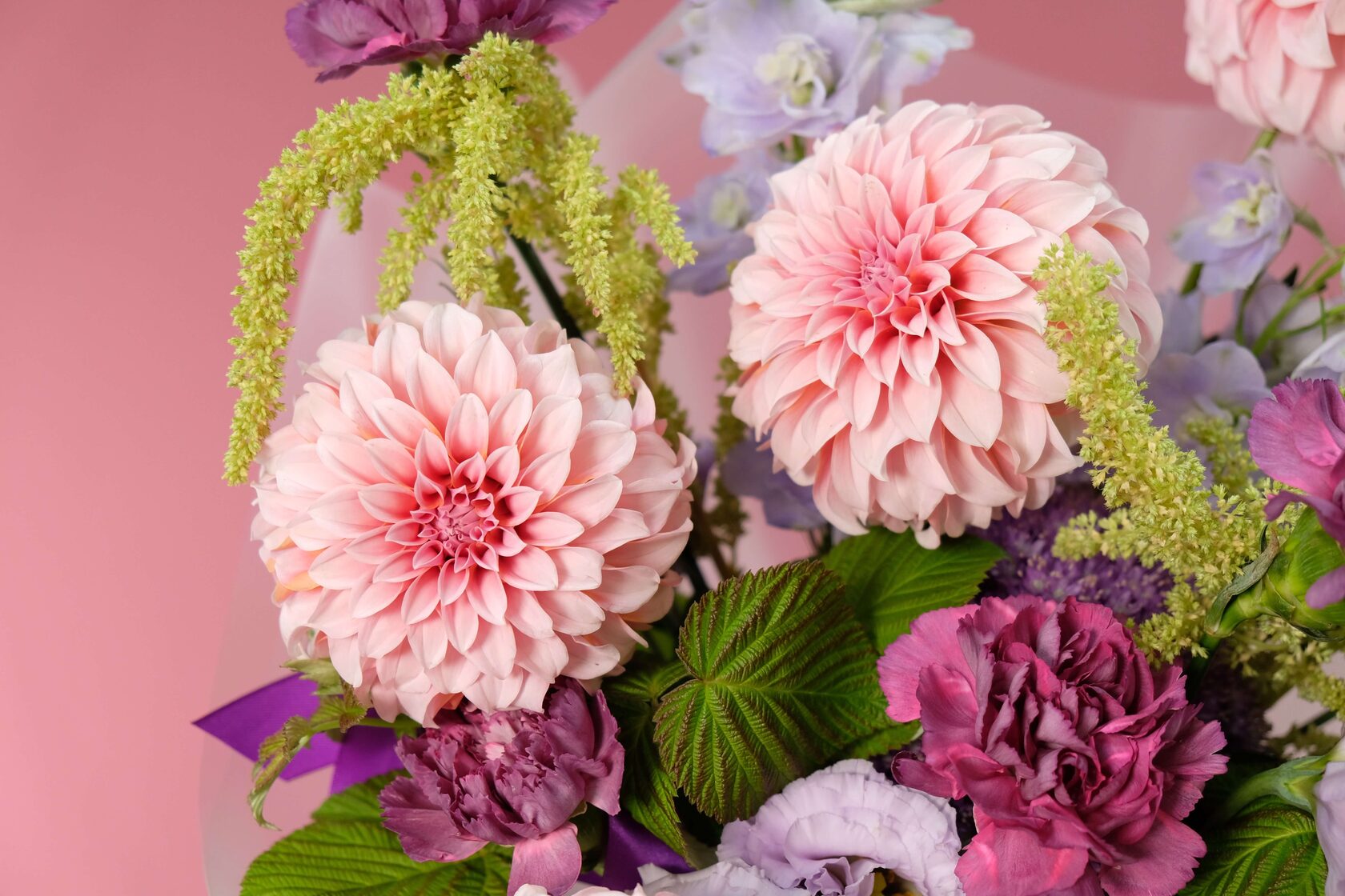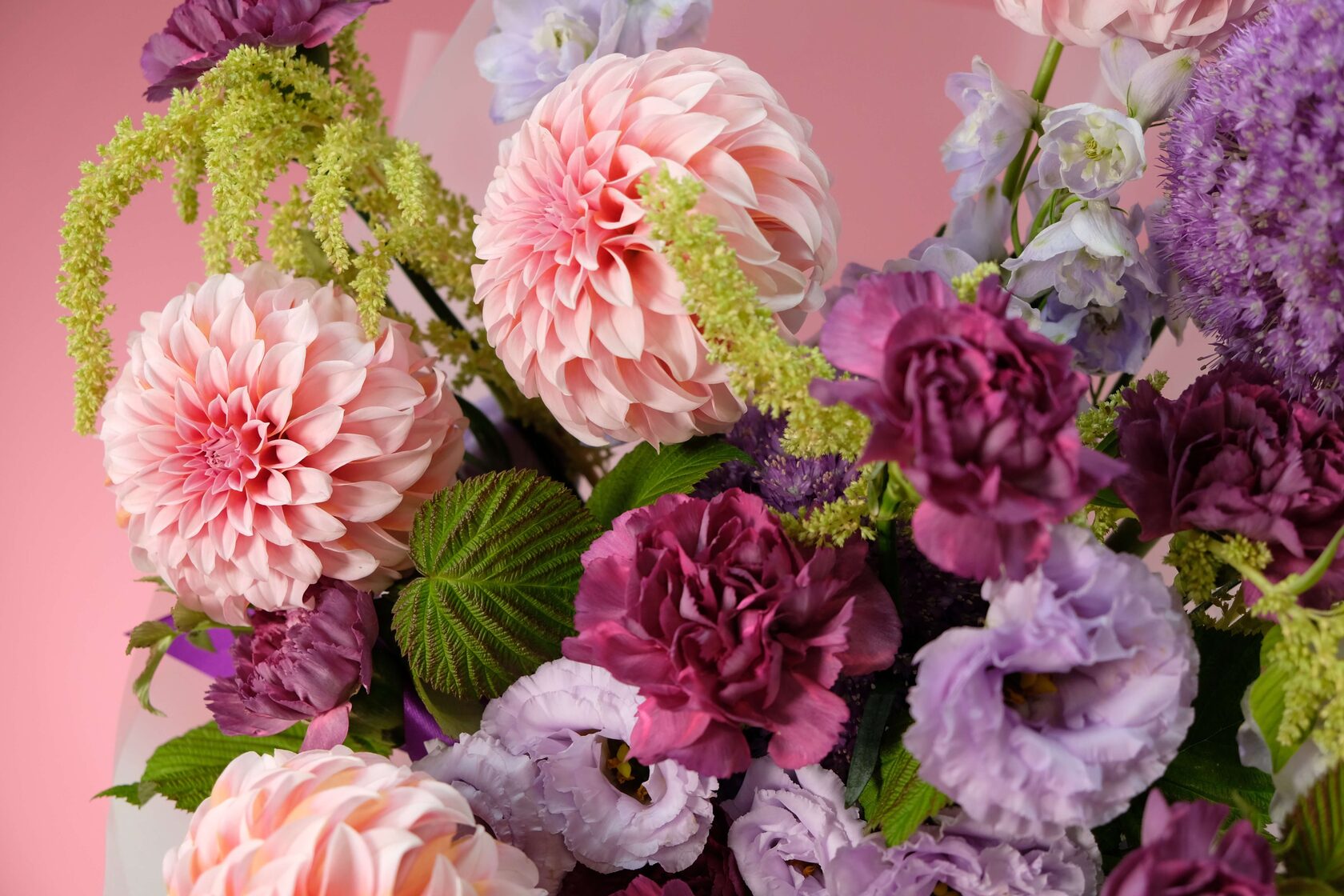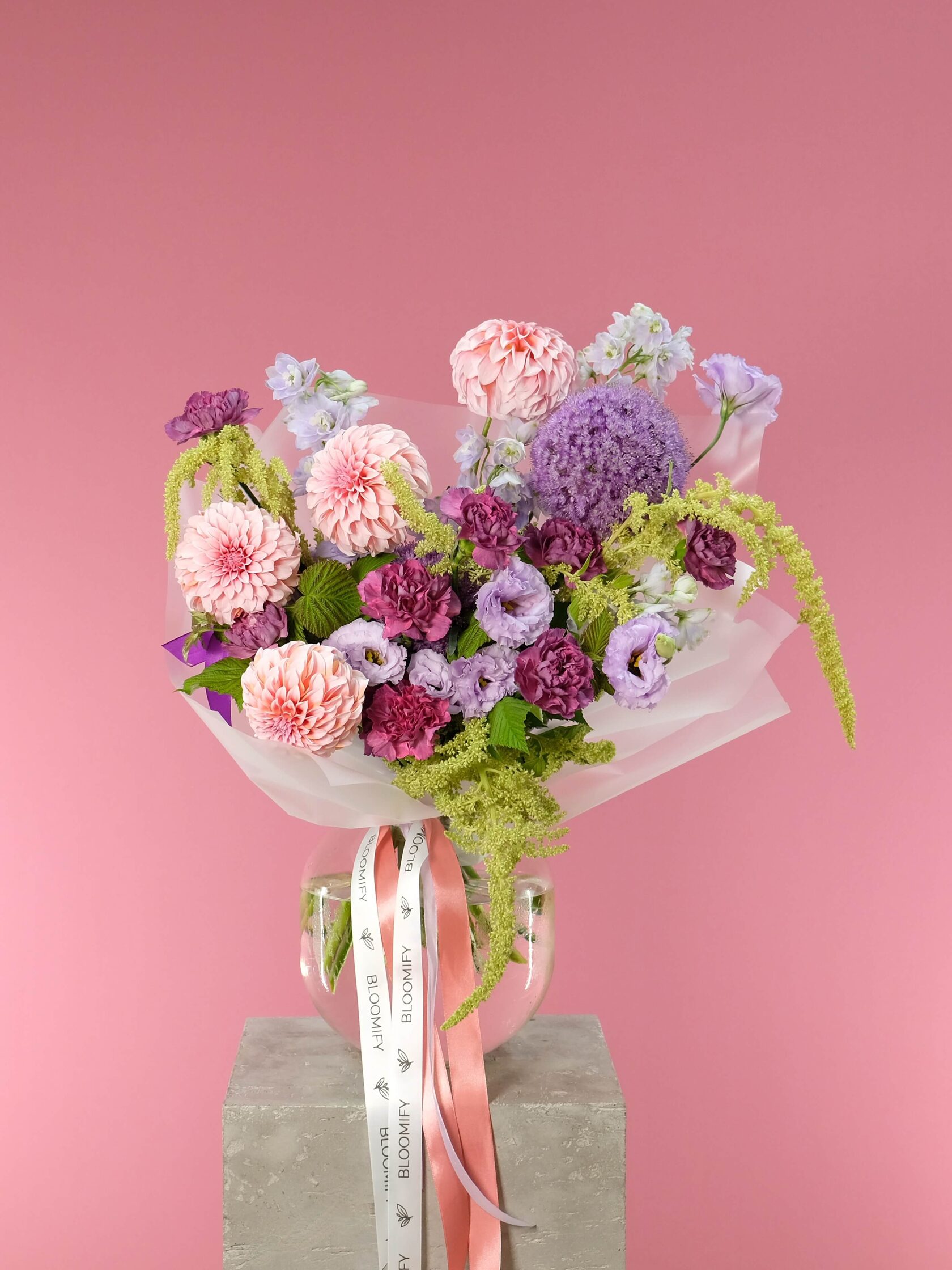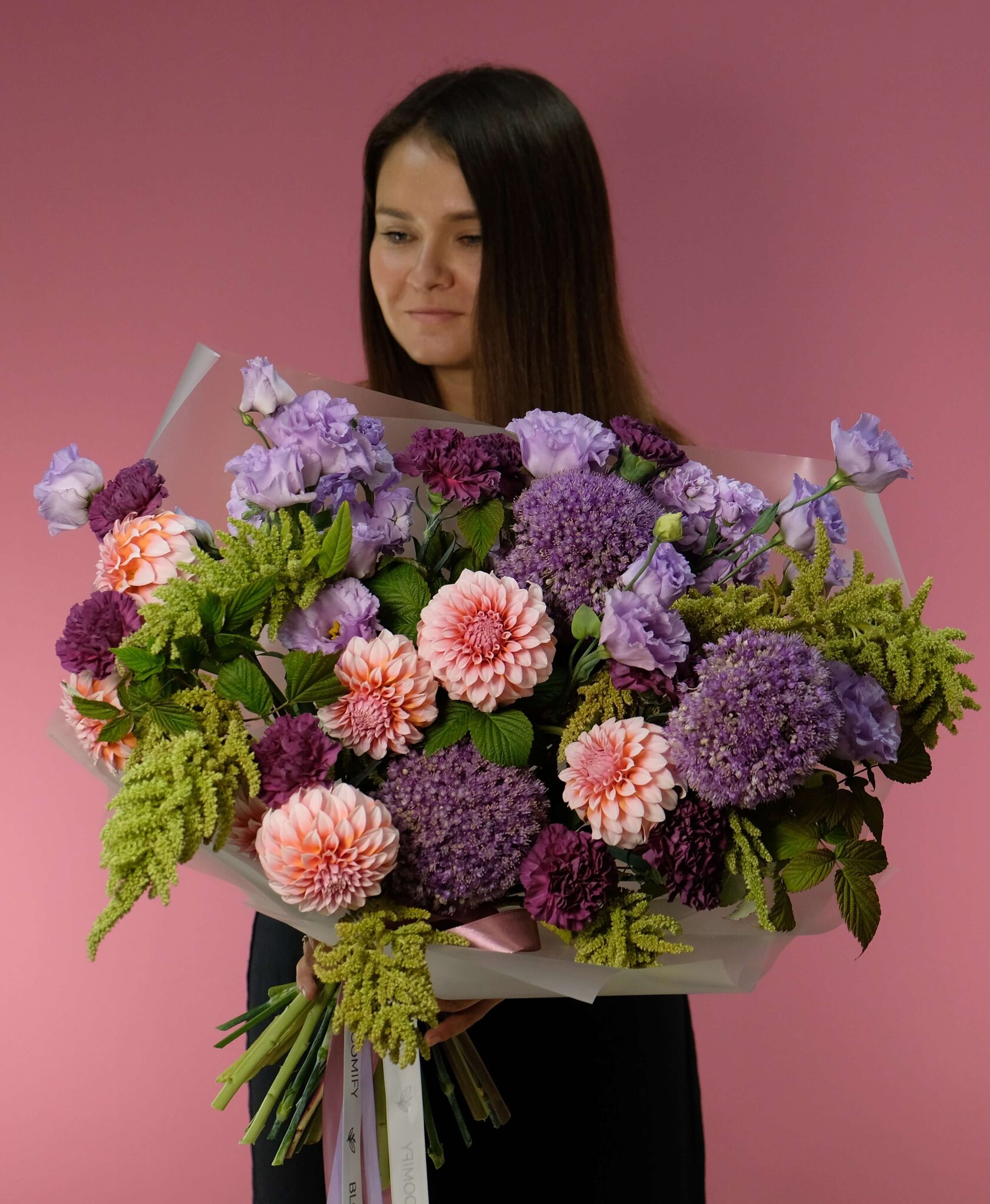 В составе: сортовые георгины, аллиум, дельфиниум, эустома, диантусы, амарант, листья малины.