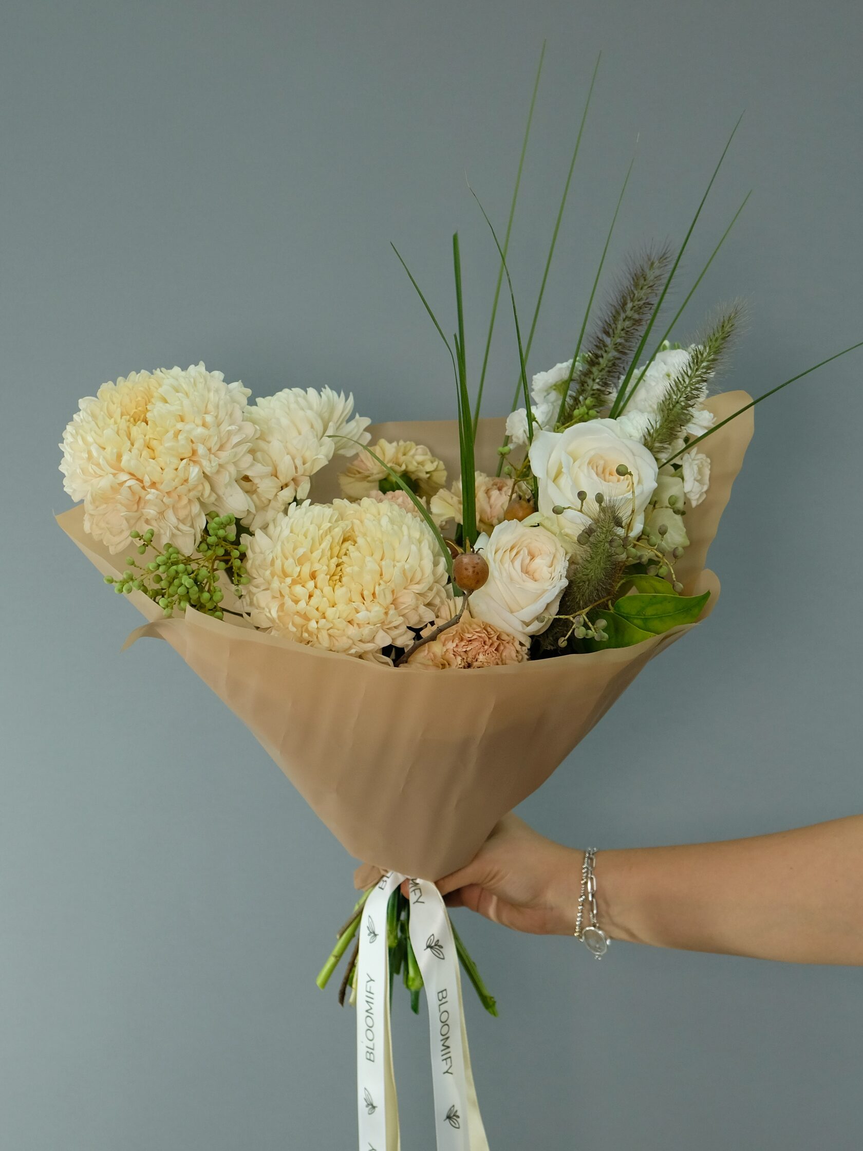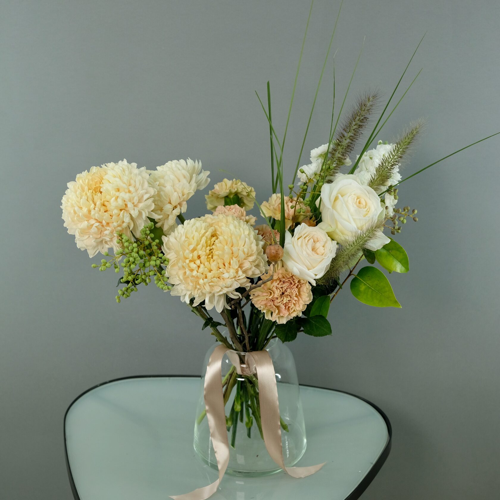 Авторский раскидистый букет в спокойной пастельной гамме.