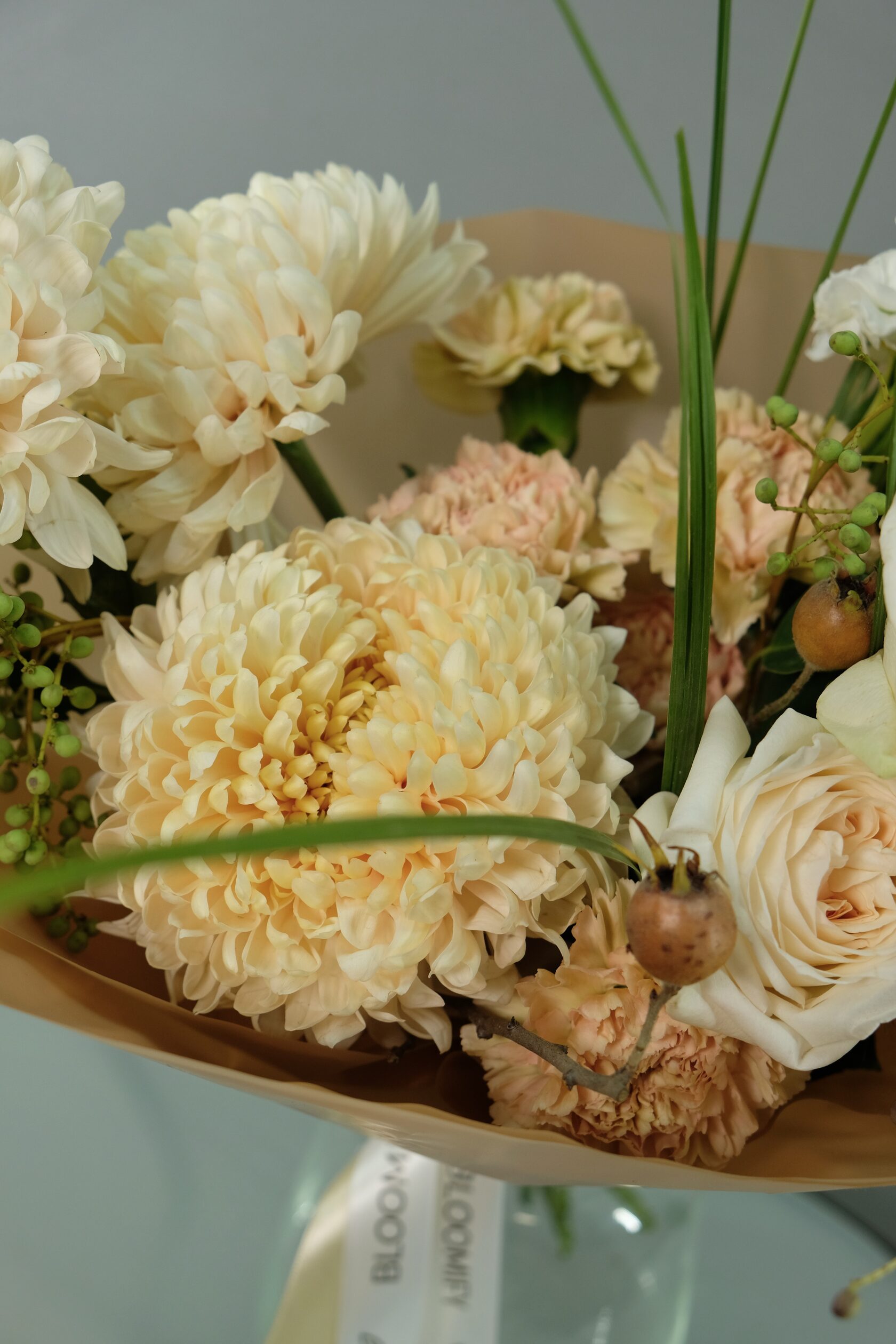 В составе: пионовидные розы Охара, сортовые хризантемы, маттиола, декоративная зелень.