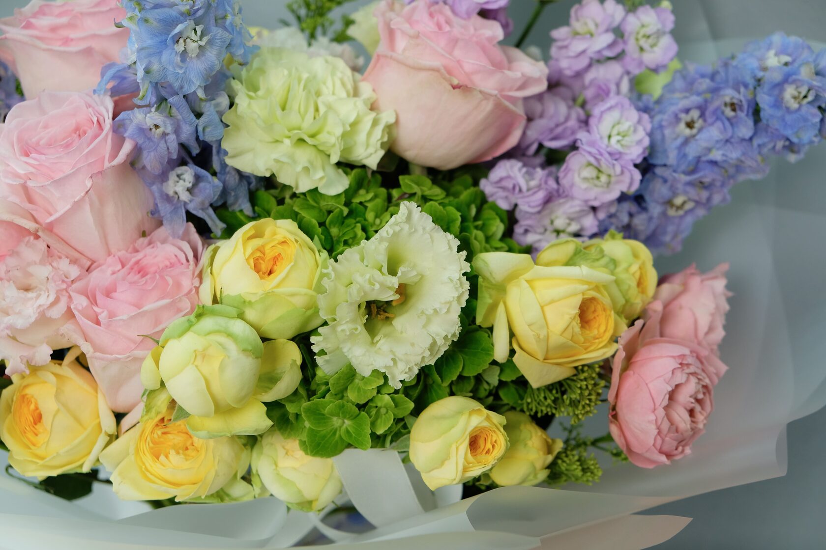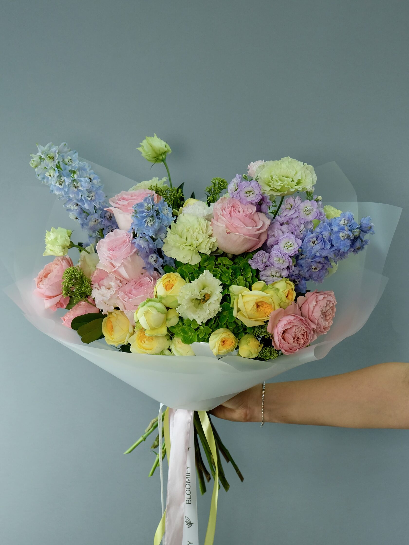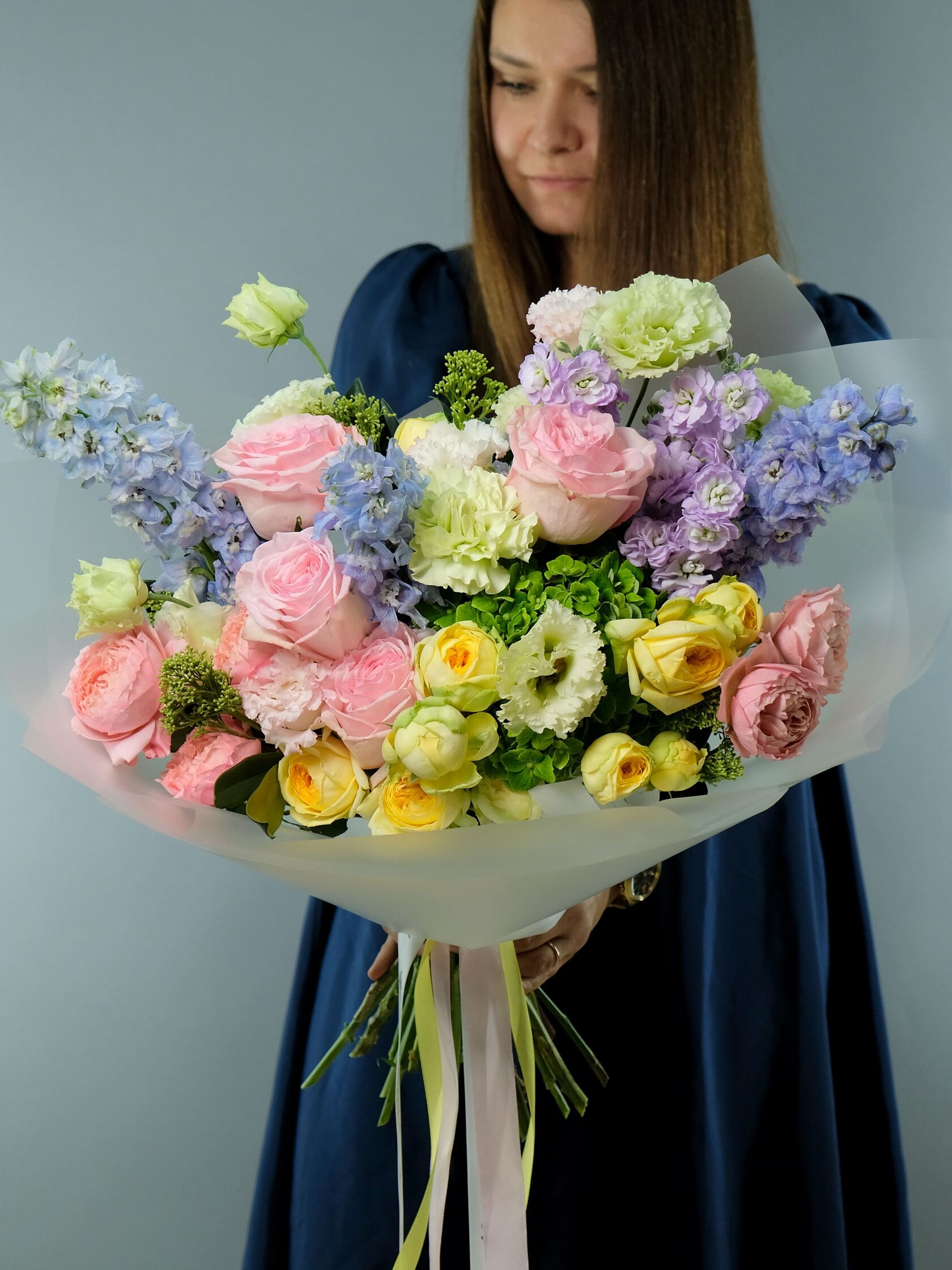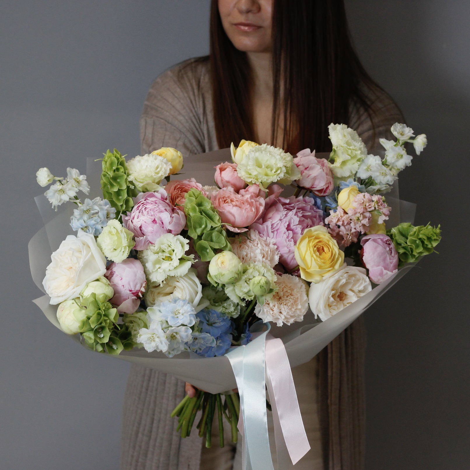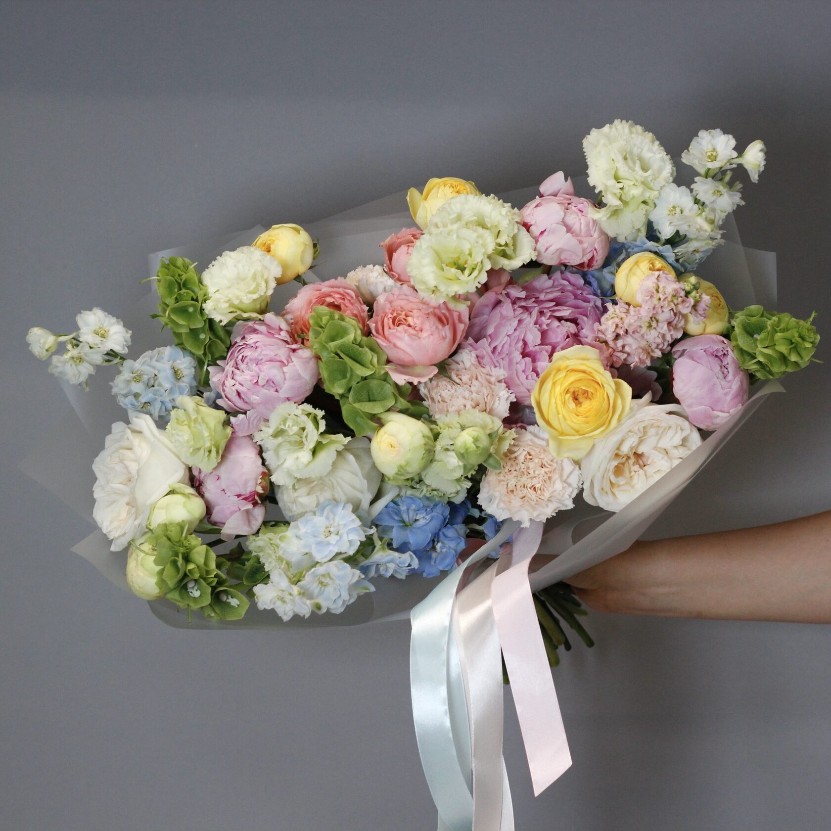 В составе: пионы, эустома, пионовидные розы, дельфиниум, диантусы, молюцелла
