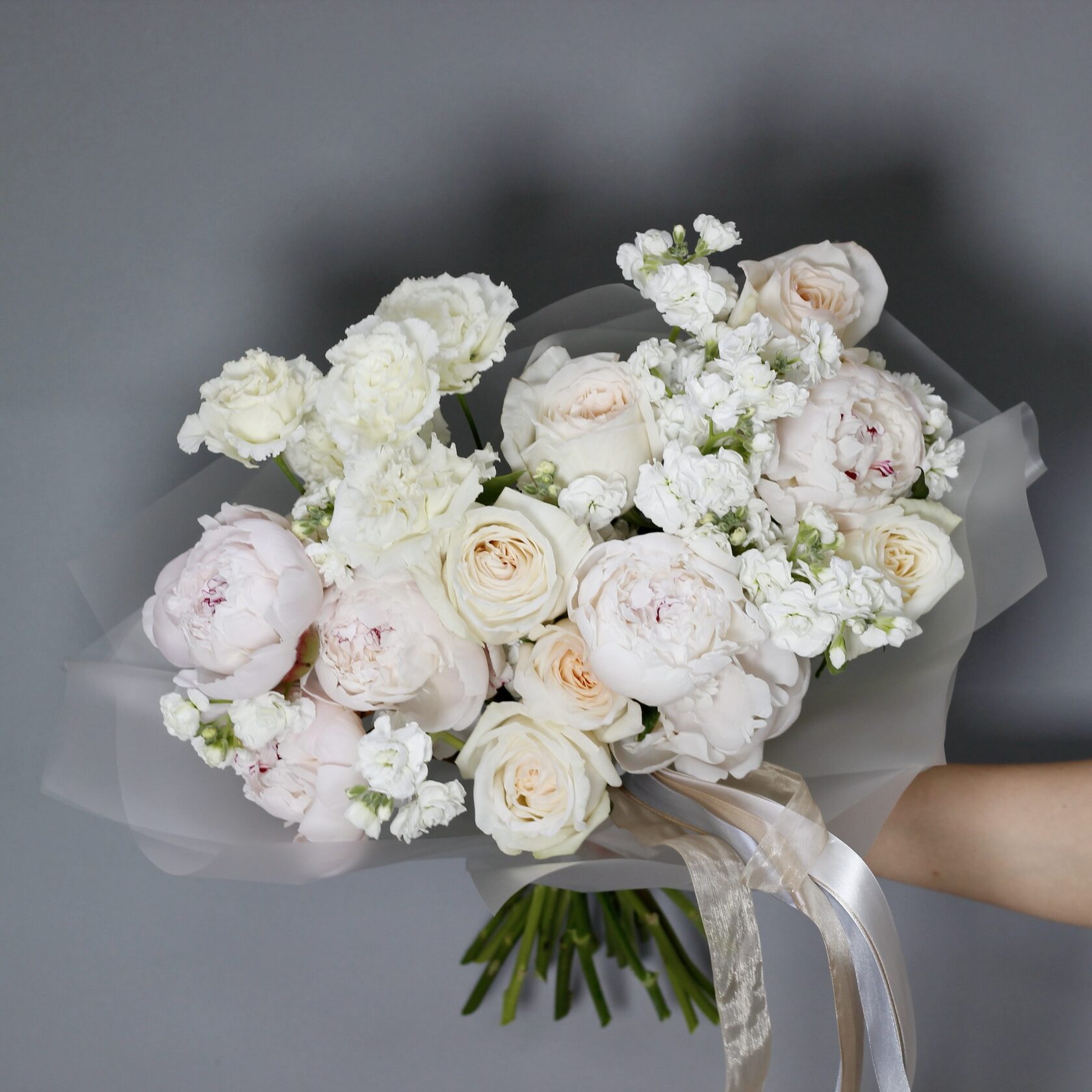 В составе: пионы, розы Вайт Охара, маттиола