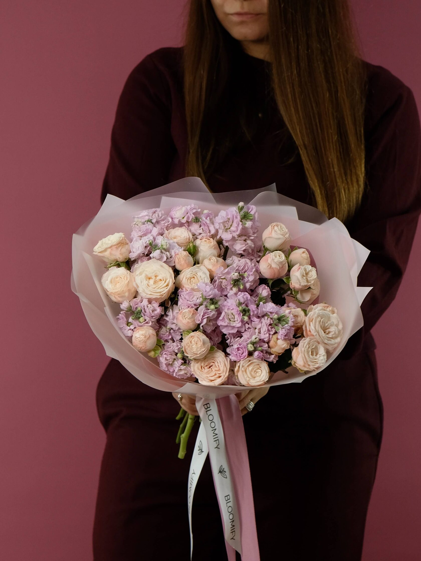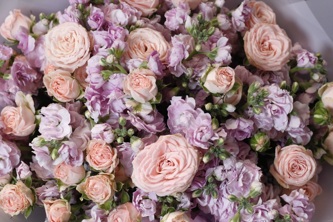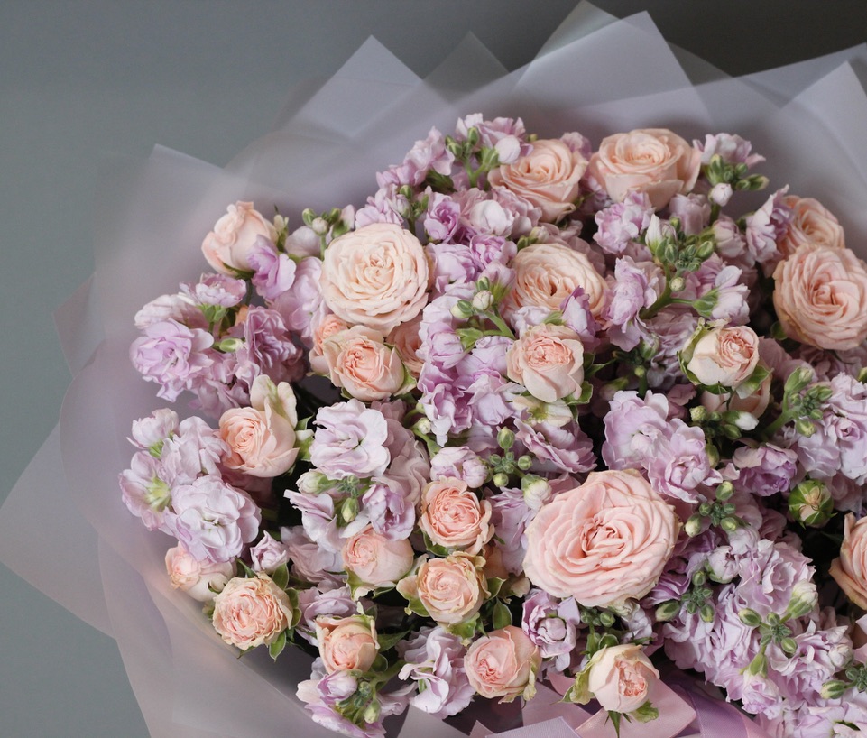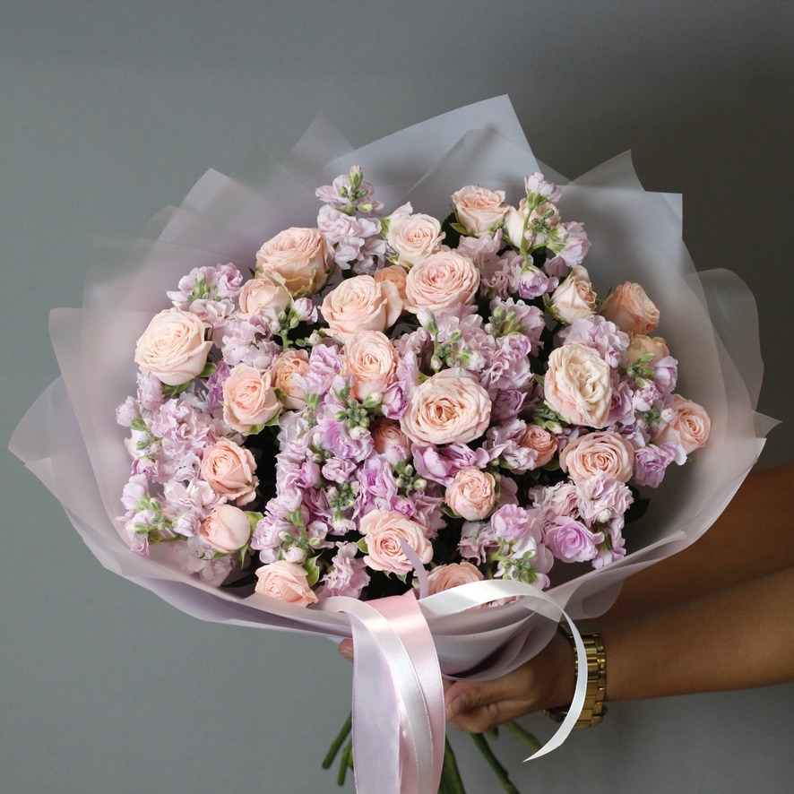 Дуобукет из нежных пионовидных кустовых роз и ароматной маттиолы.