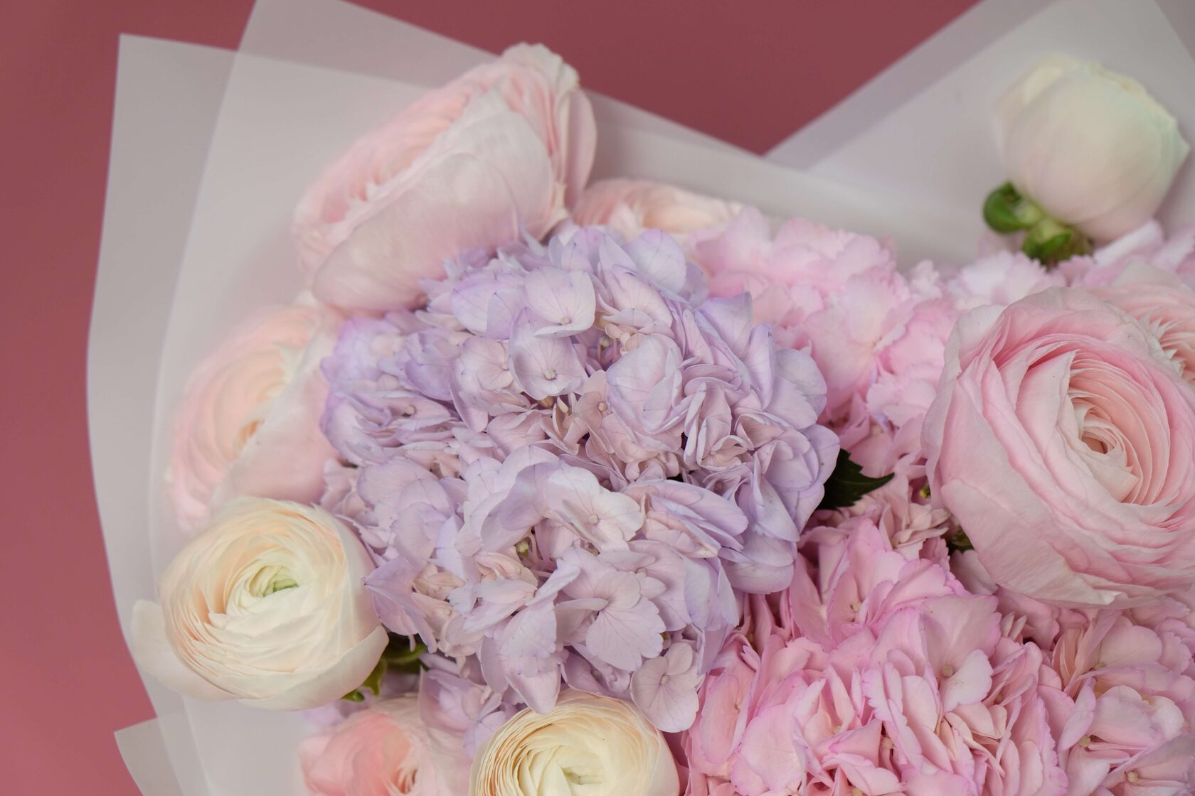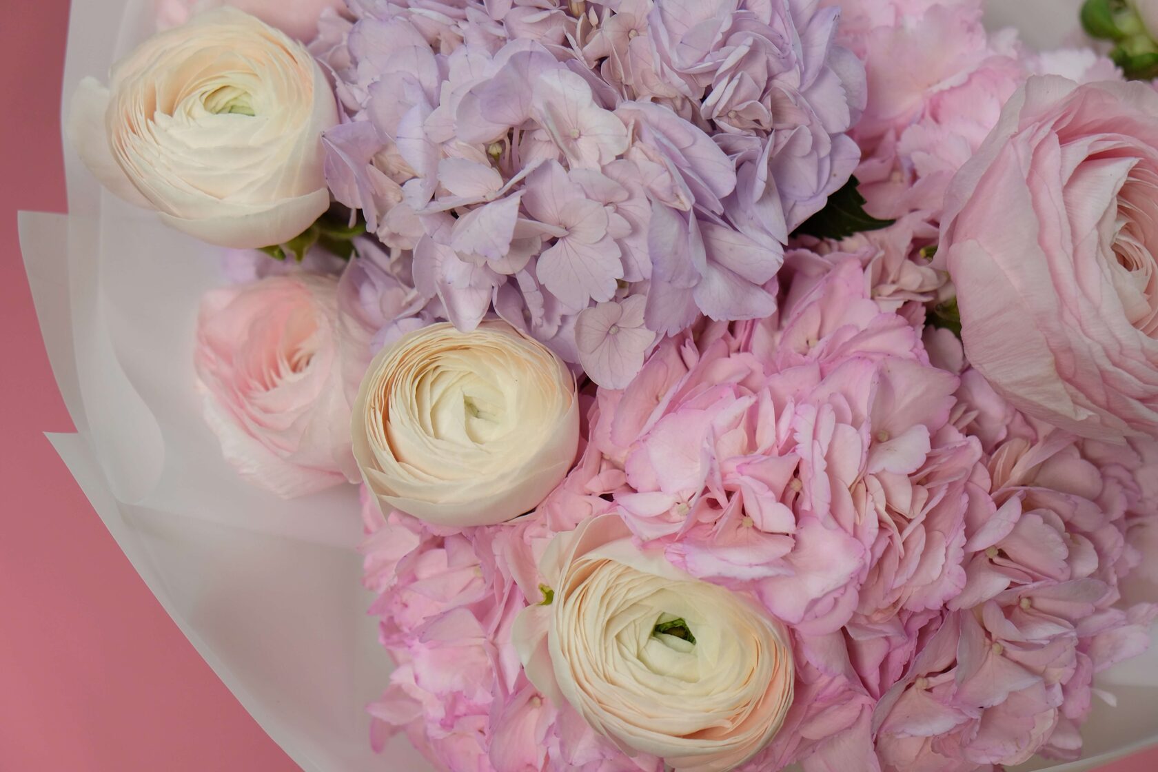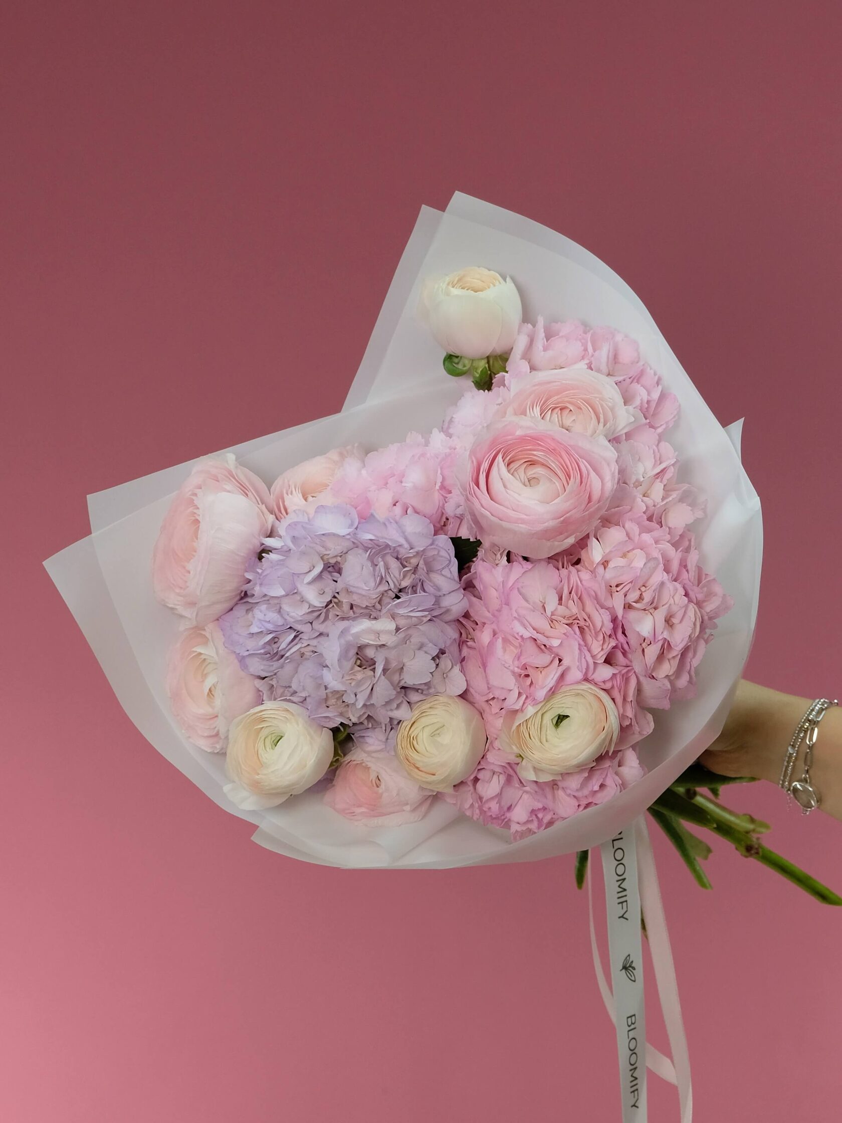 Нежный романтичный букет с воздушными гортензиями и любимчиками всех девушек - ранункулюсами.