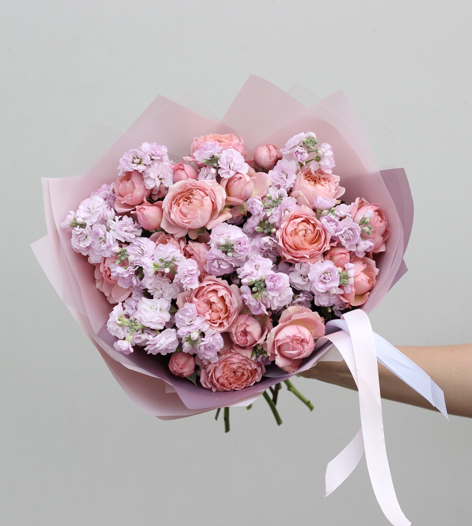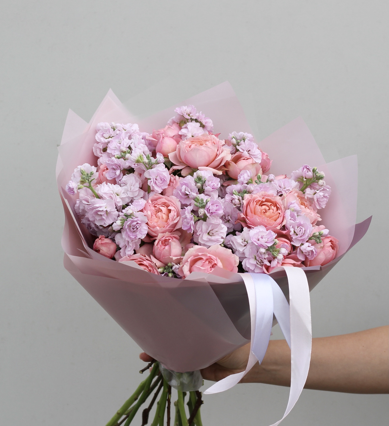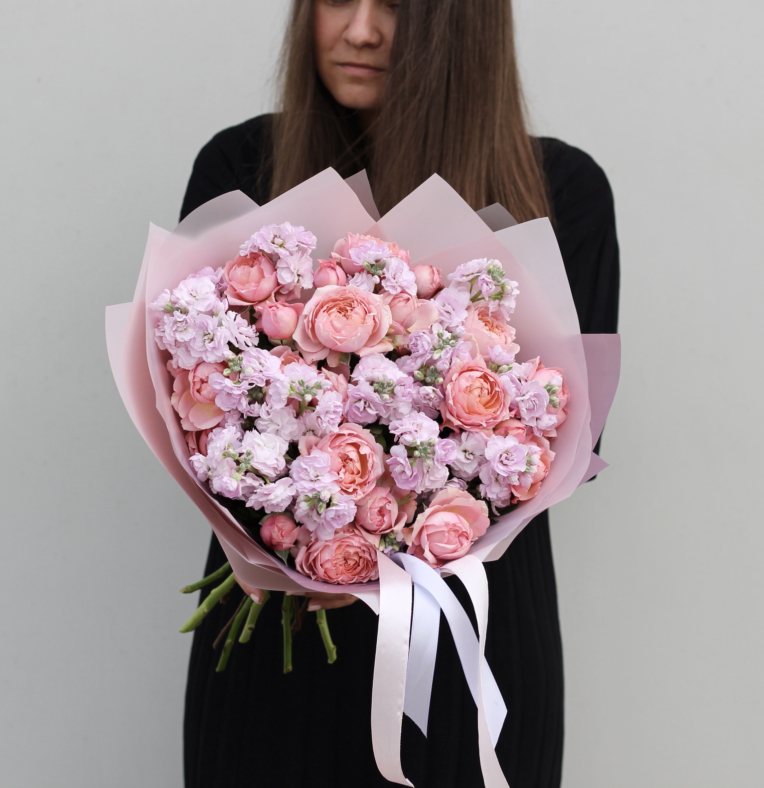 Дуобукет из восхитительных персиково-розовых пионовидных роз Джульетта и ароматной маттиолы.