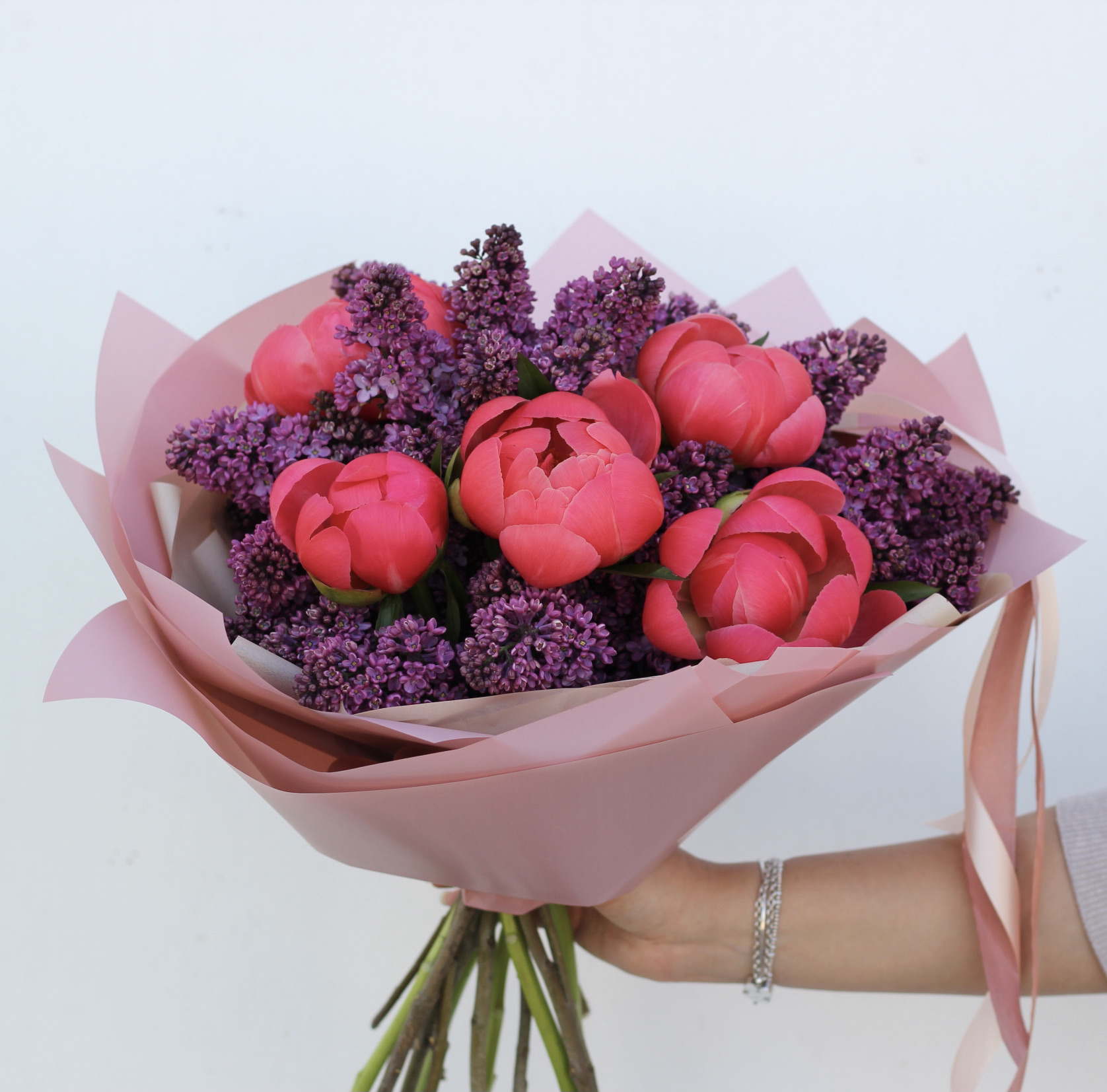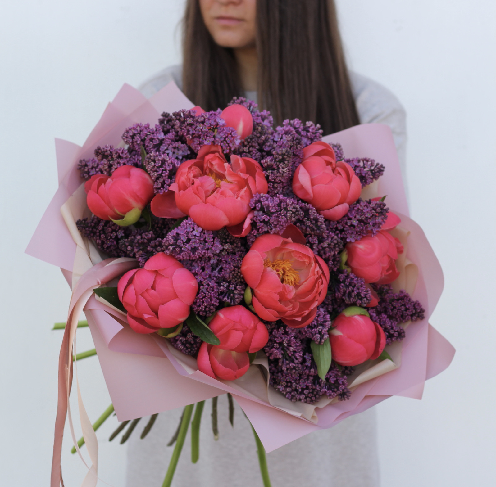 Дуо букет из ароматной сирени и невероятных коралловых пионов.