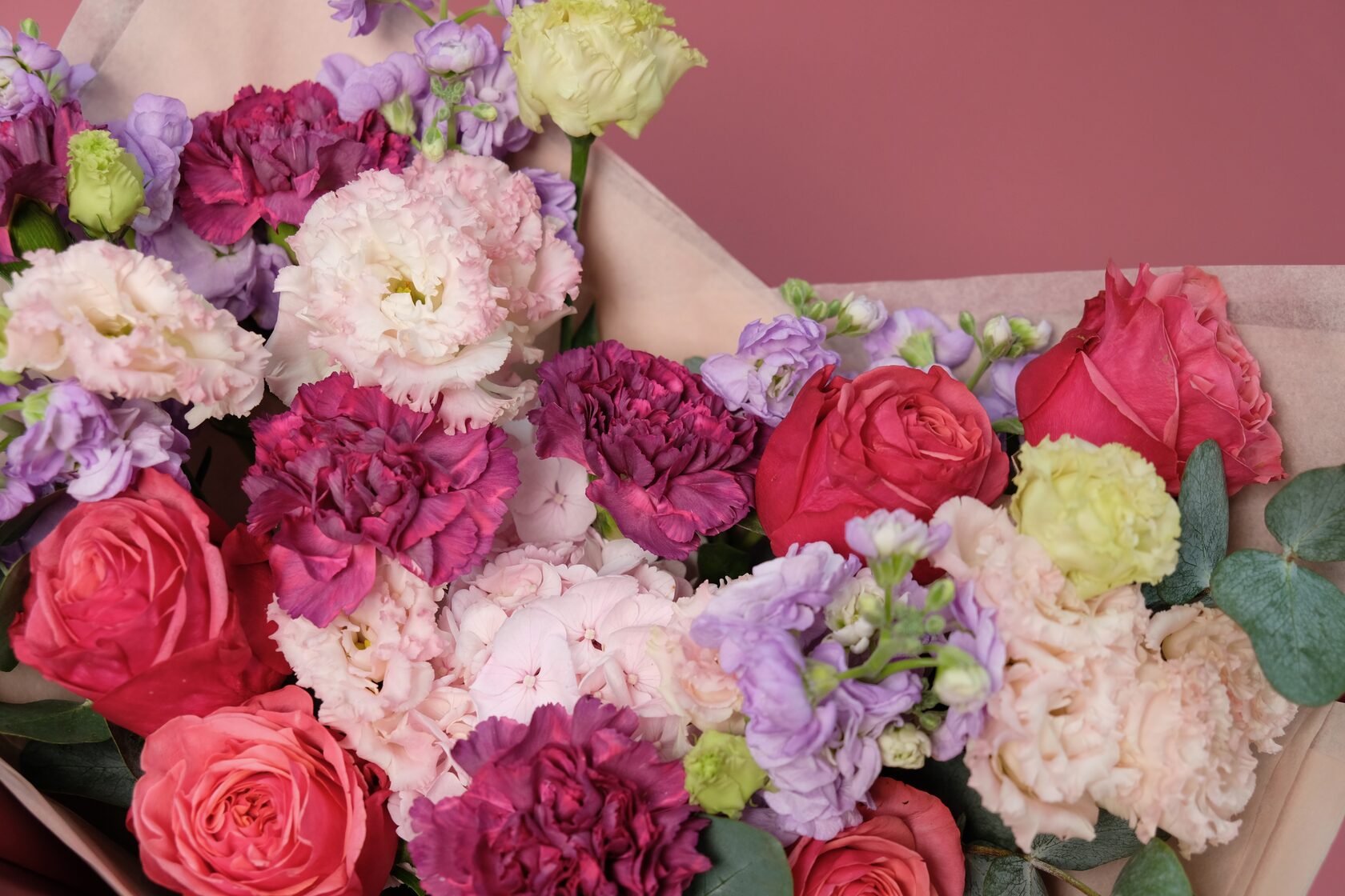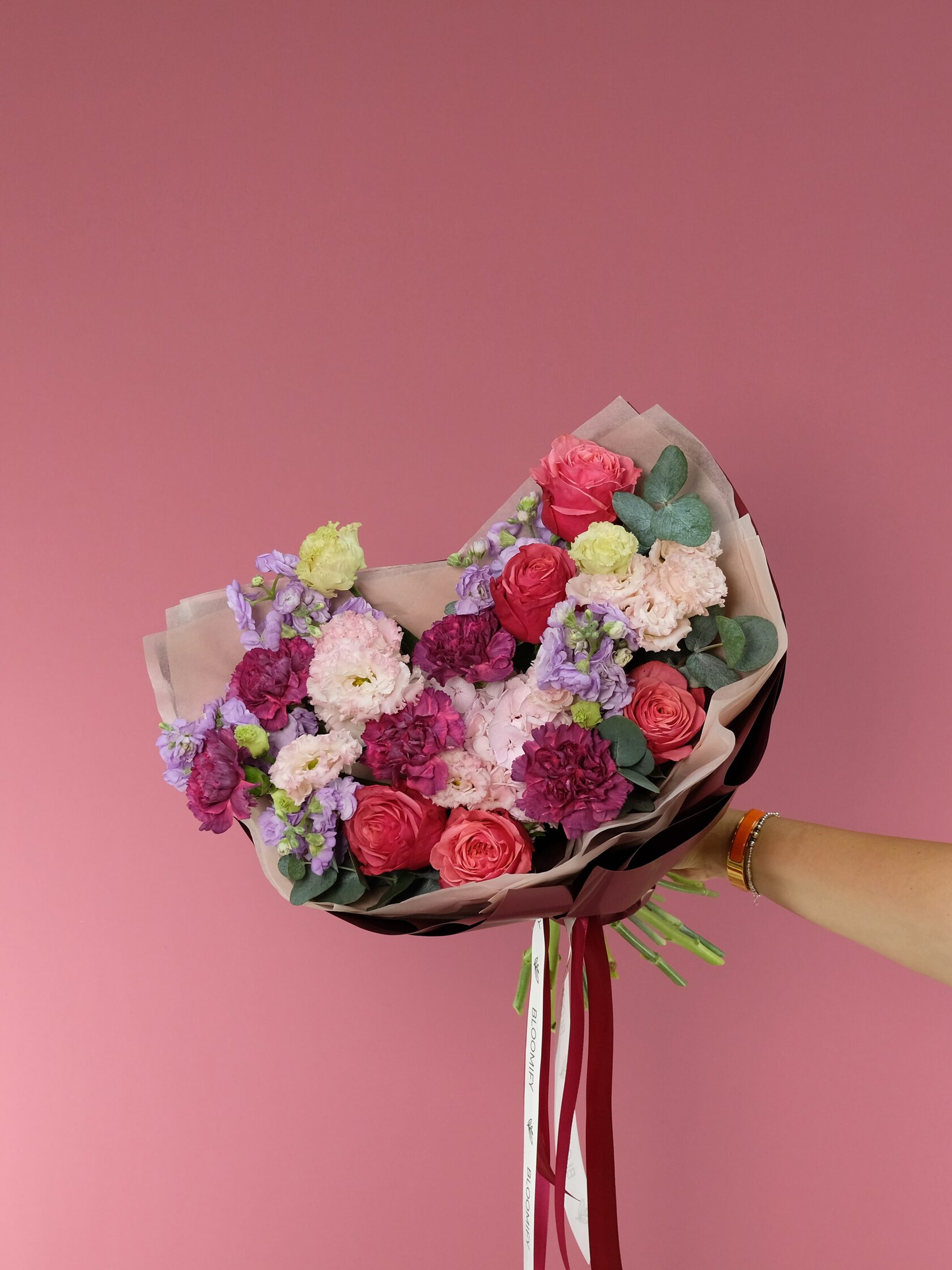 В составе: пионовидные розы, гортензия, маттиола, махровая эустома, диантусы, зелень эвкалипта.