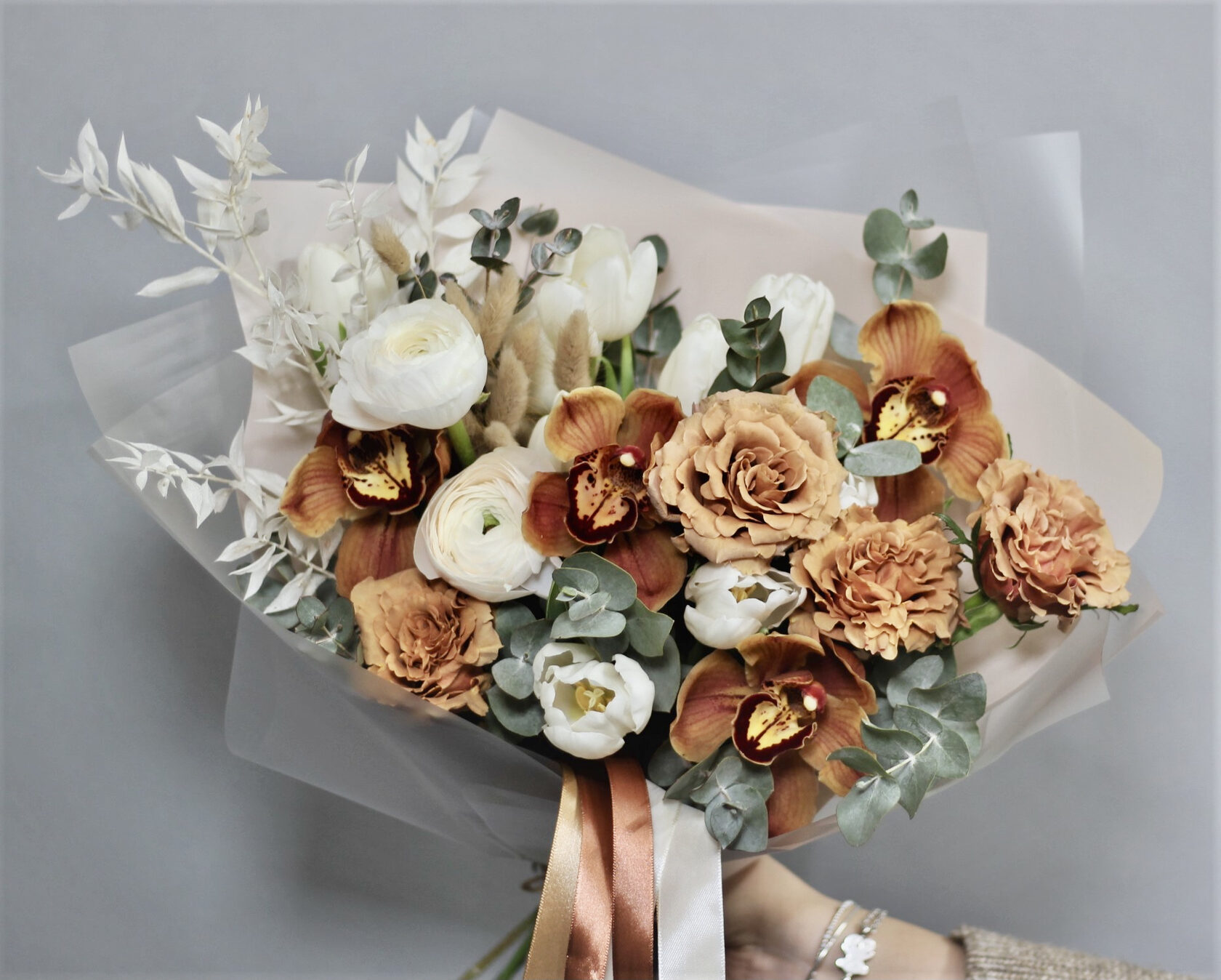 В составе: кофейные розы, горчичные орхидеи, ранункулюсы, тюльпаны, зелень эвкалипта, лагурус, веточки стабилизированного рускуса.