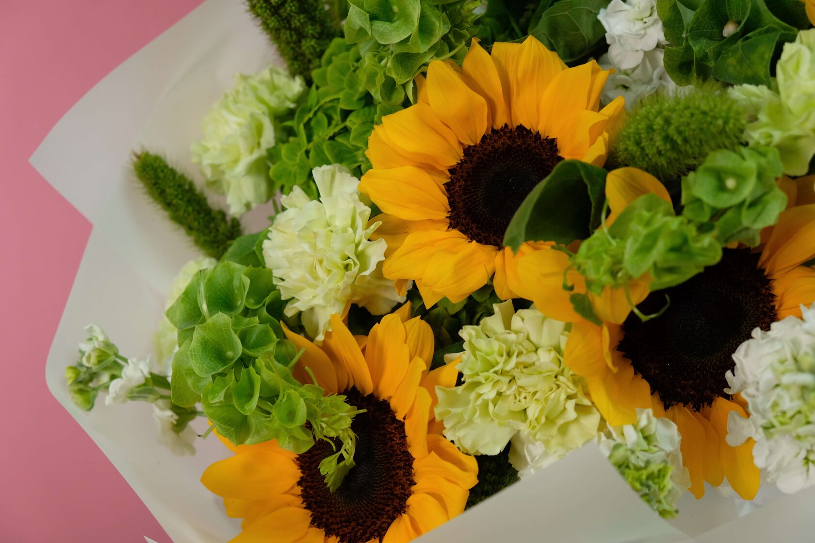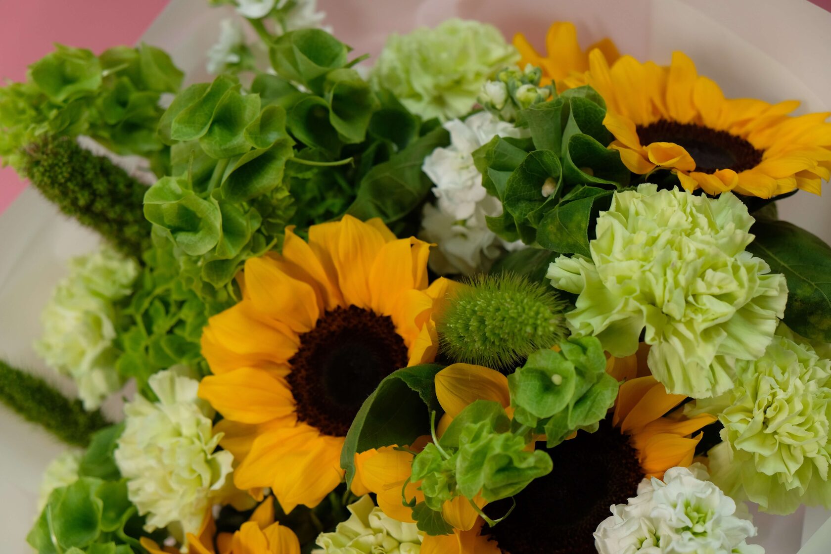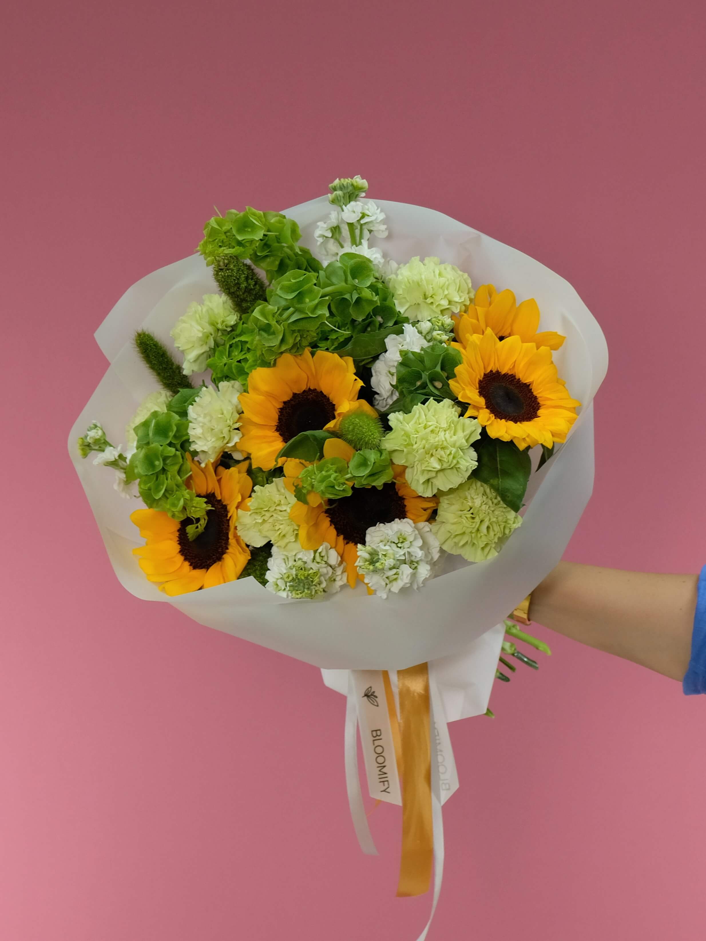 В составе: подсолнухи, гортензии, ароматная маттиола, диантусы, молюцелла, сетария.