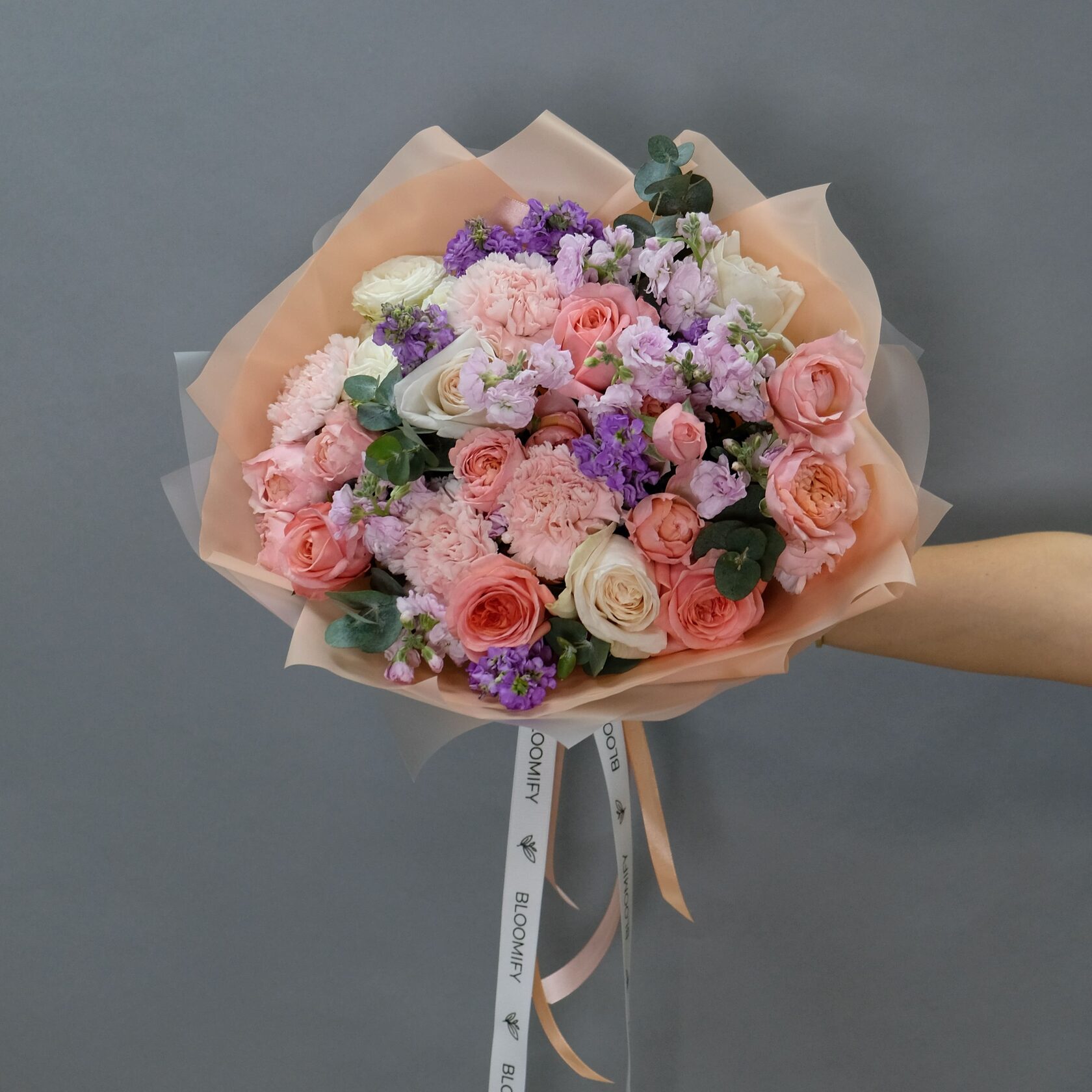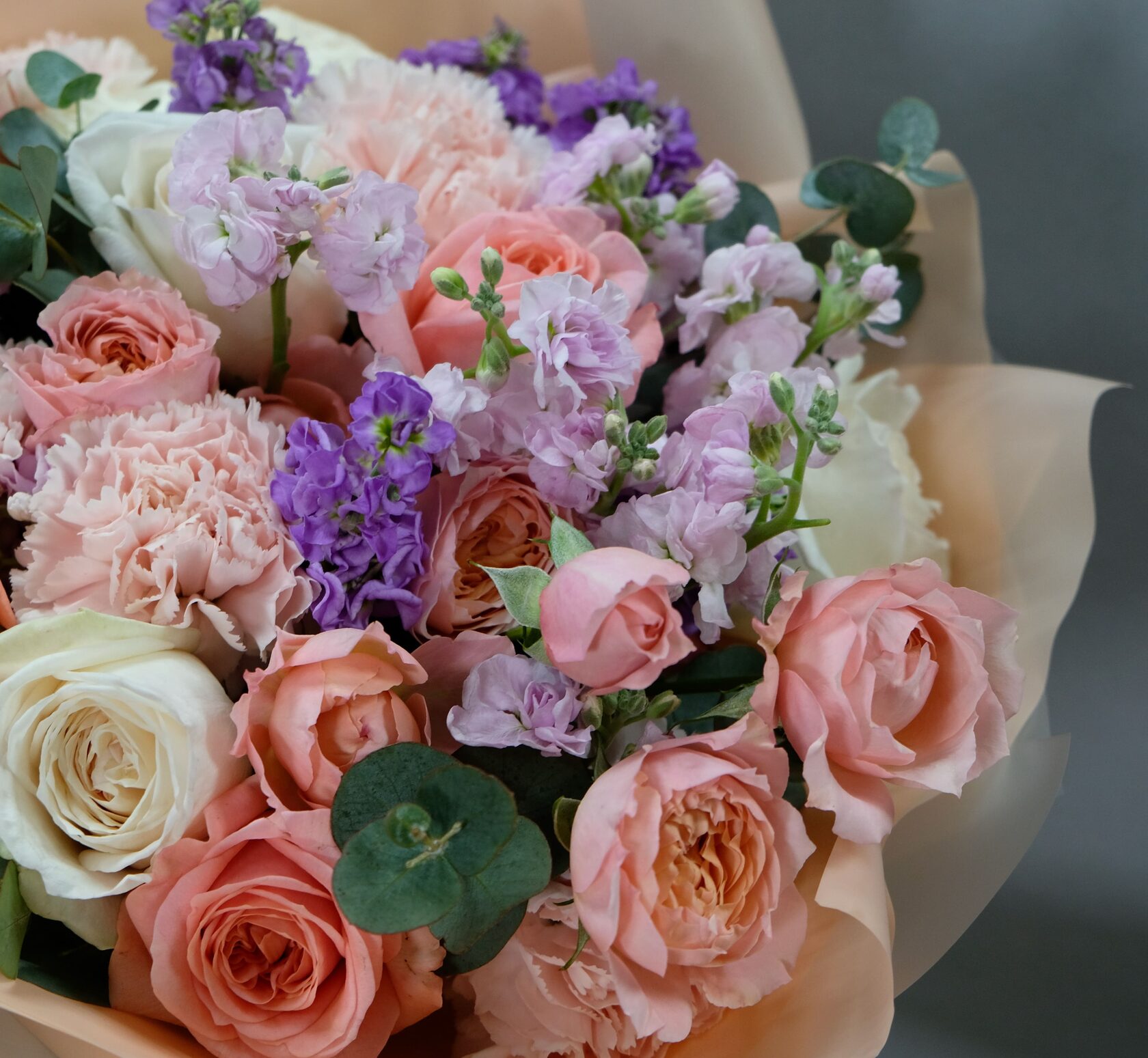 В составе: пионовидные розы Джульетта, Шиммер, розы Мента, ароматная маттиола, диантус, кустовые розы Бомбастик, зелень эвкалипта.