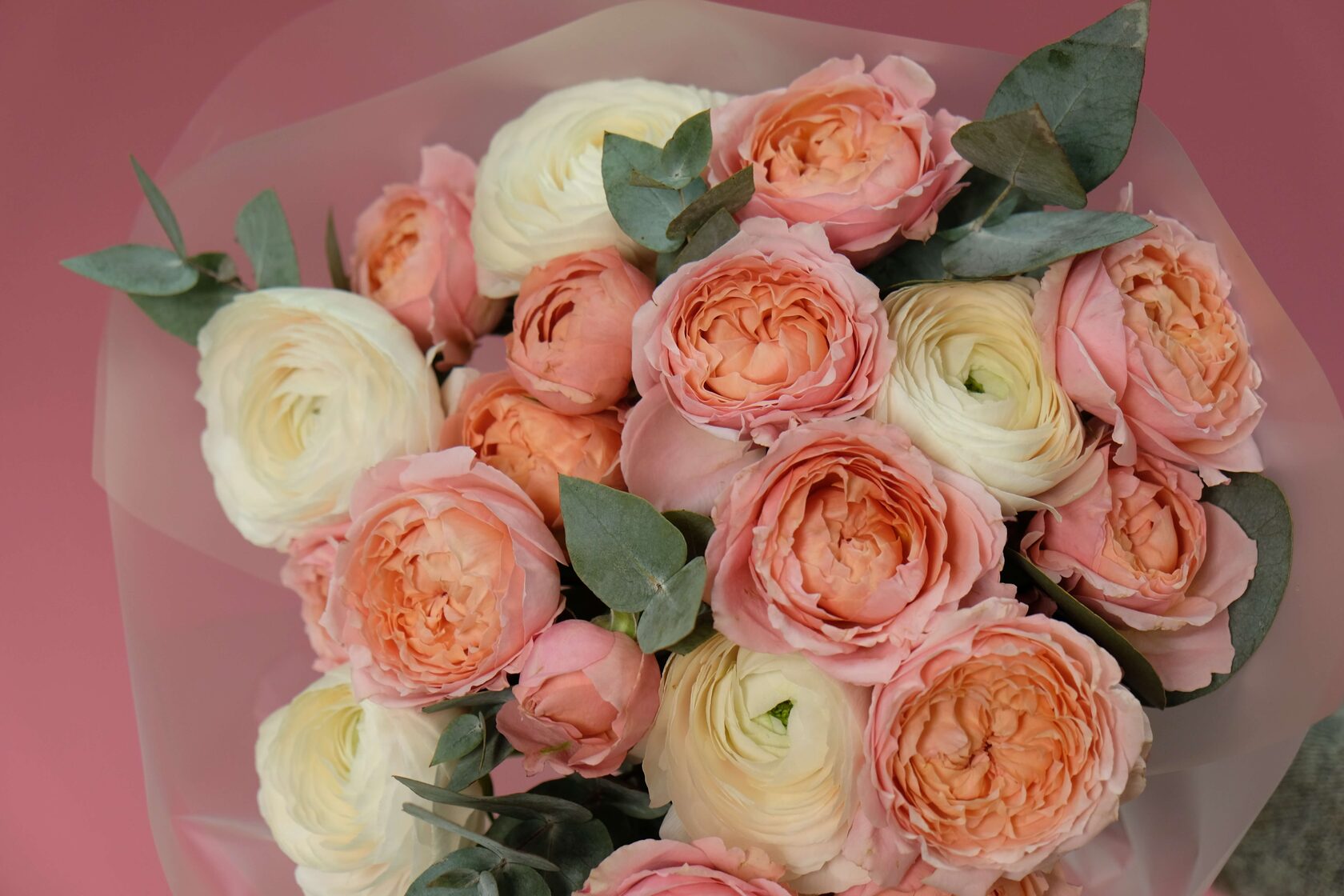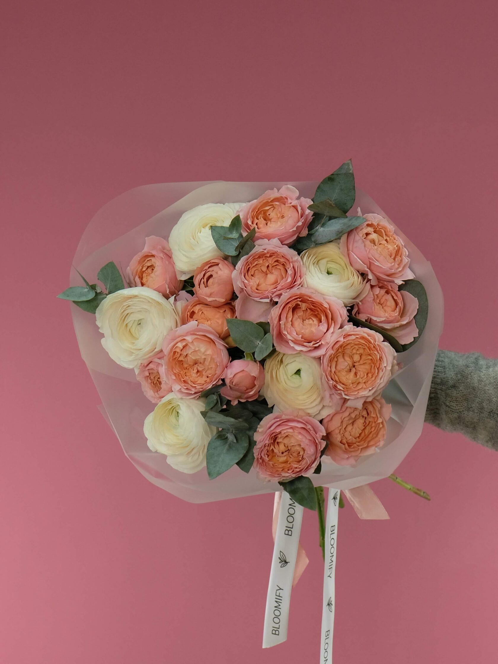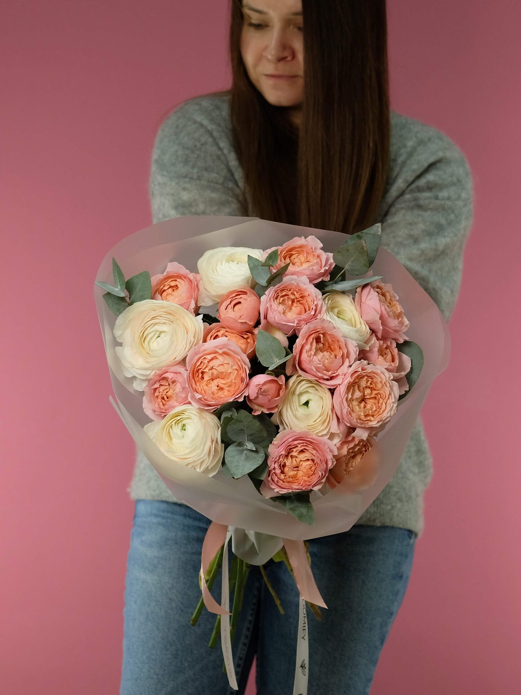 В составе: пионовидные розы Джульетта, ранункулюсы, зелень эвкалипта.