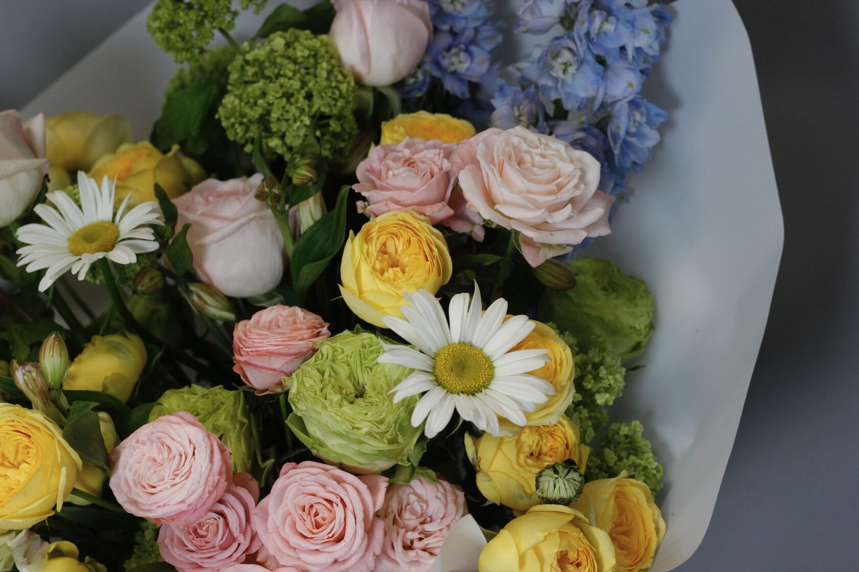 Раскидистая охапка сезонных цветов и разнообразной зелени в яркой солнечной гамме. Отличный вариант для создания весеннего настроения и уюта в доме.