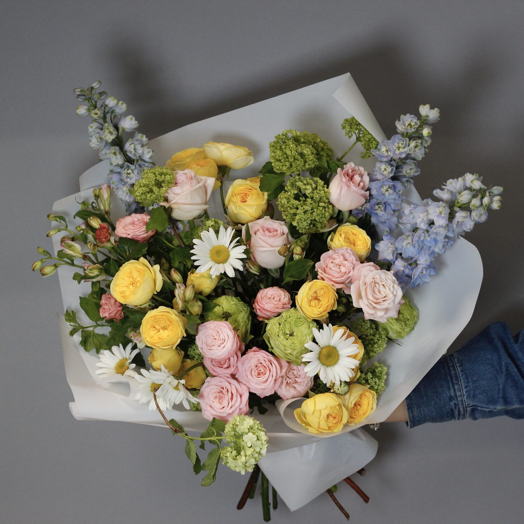 В составе: лимонные пионовидные розы, кустовые пионовидные розы Бомбастик, дельфиниум, вибурнум, ромашки, альстромерия
