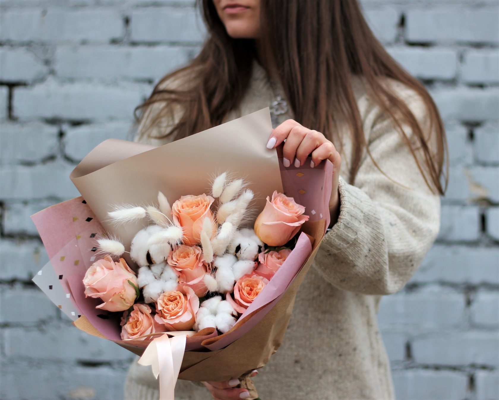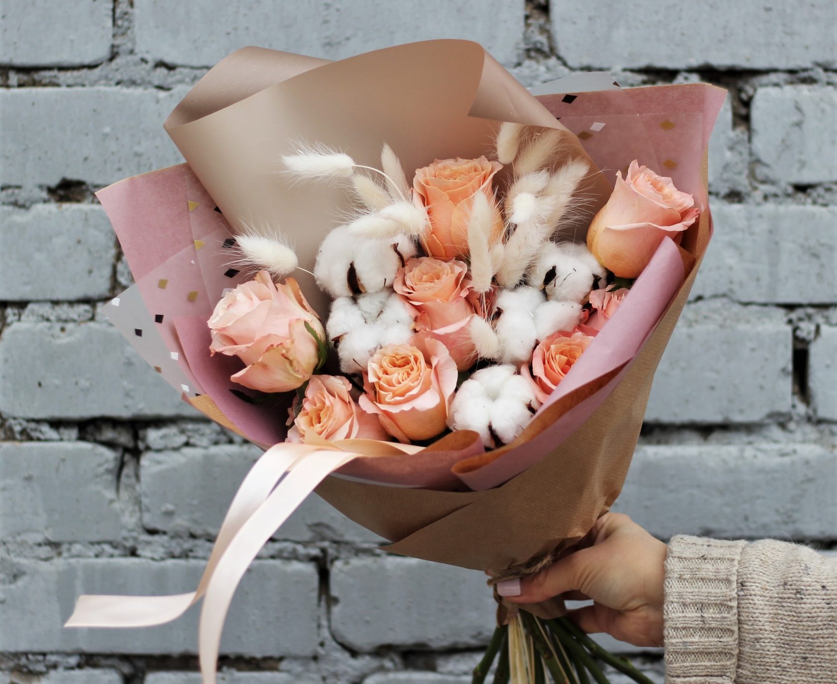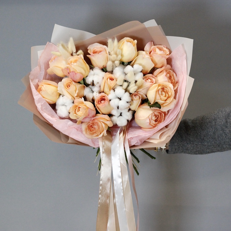 В составе: пионовидные коралловые розы, хлопок, лагурус