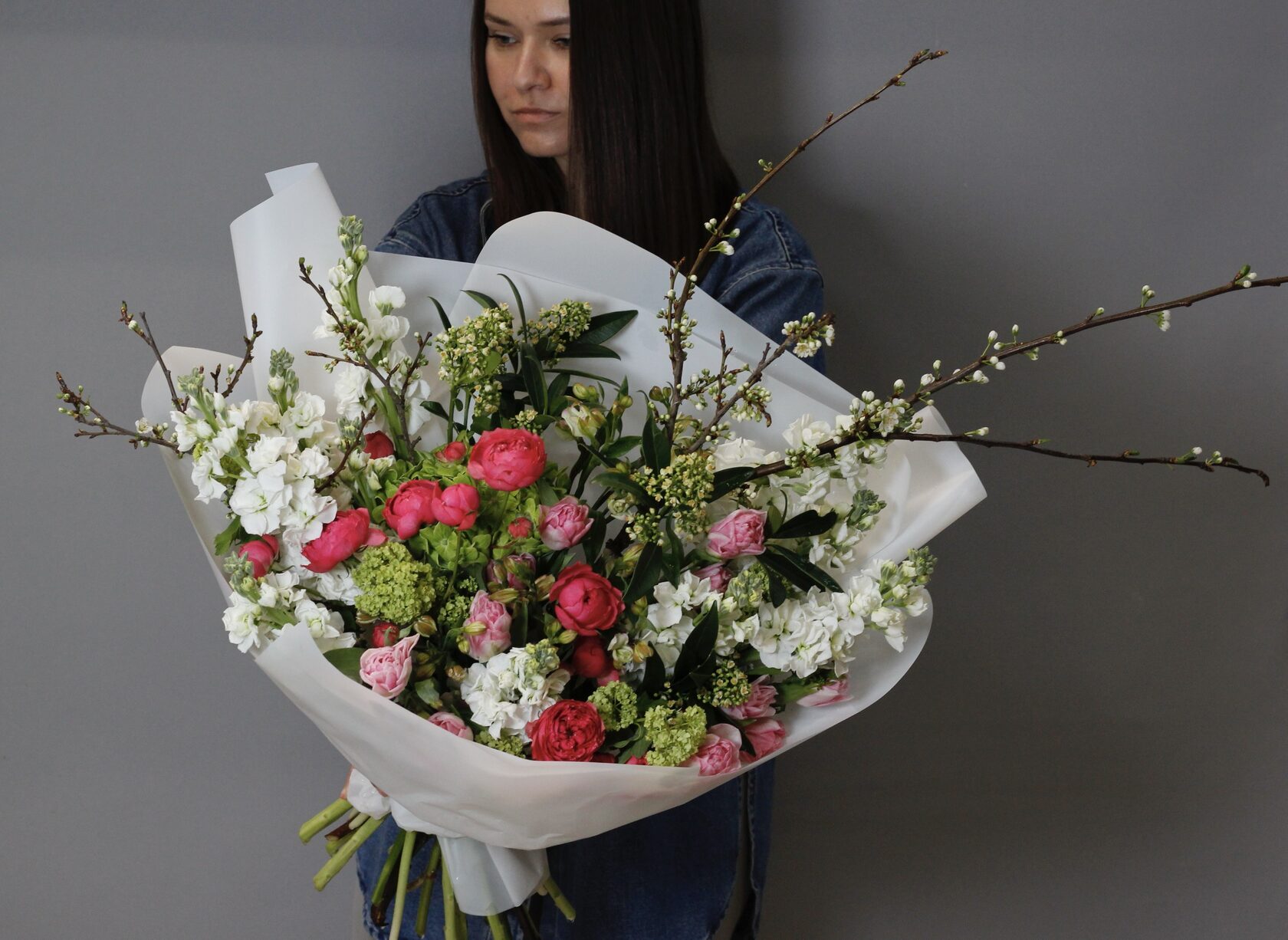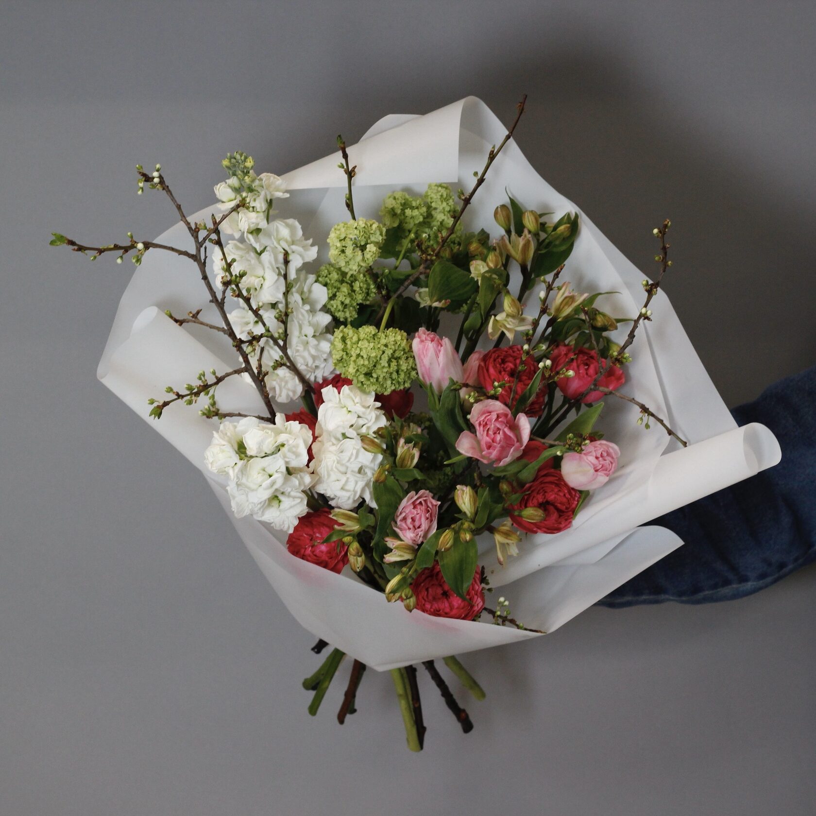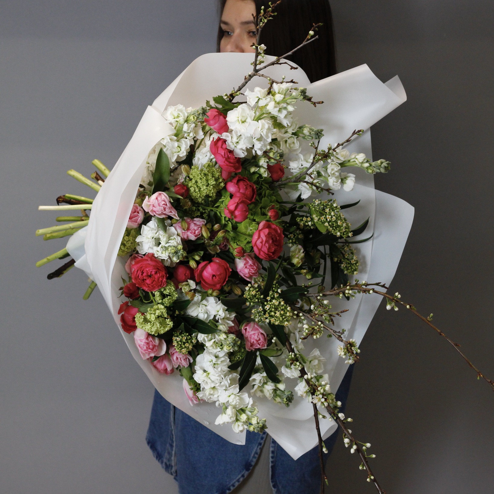 В составе: маттиола, пионовидные розы, вибурнум, тюльпаны, цветущие ветки, альстромерия