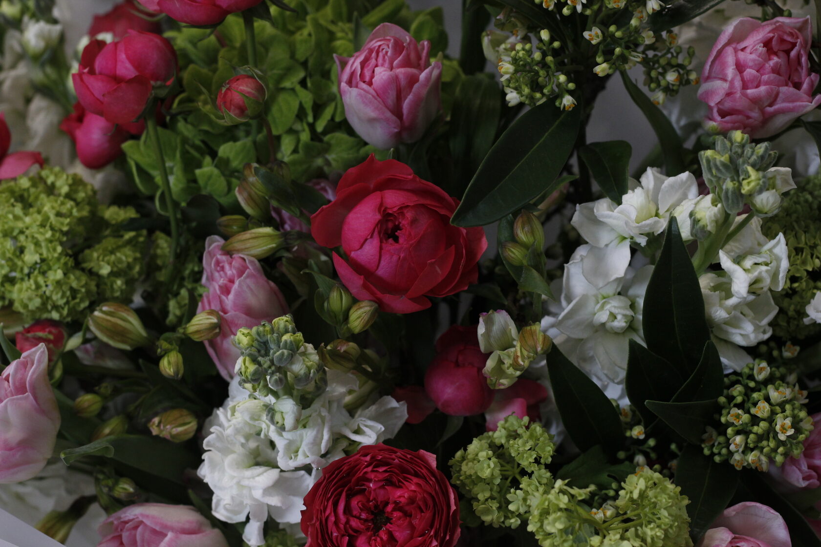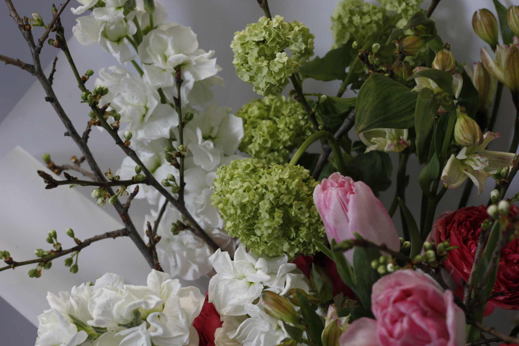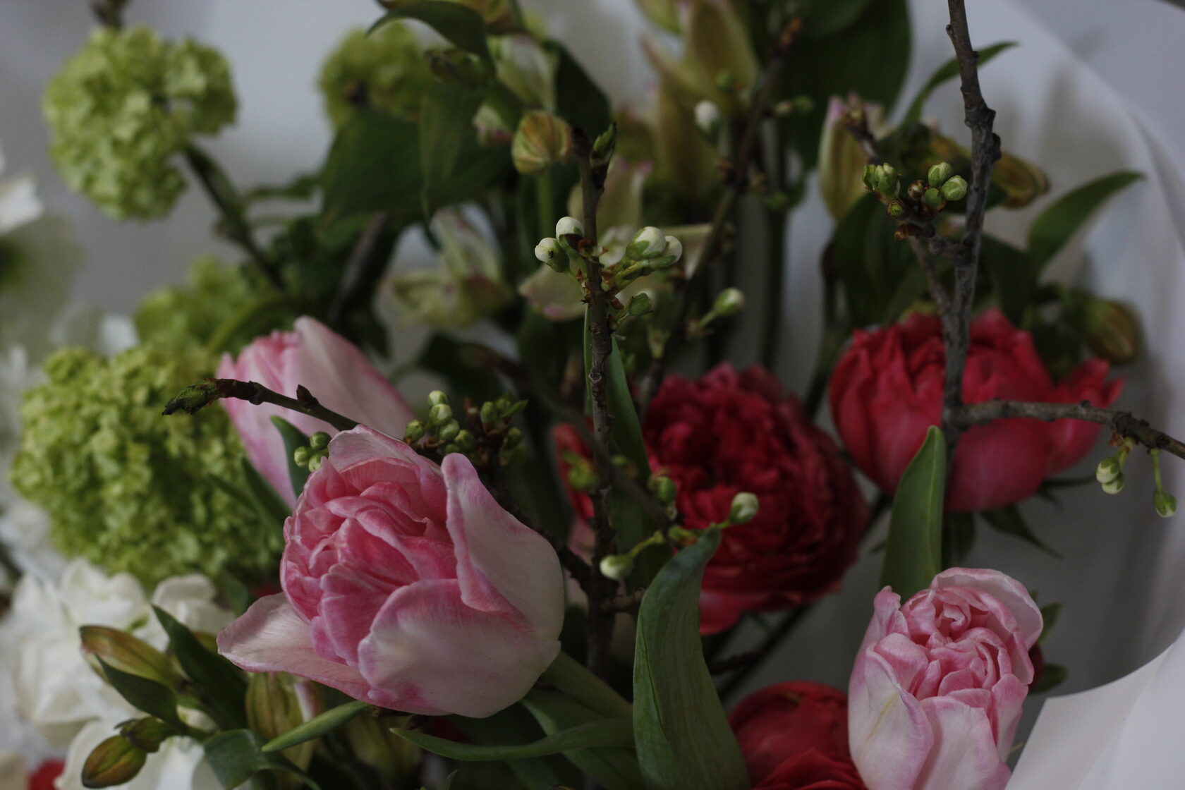 В составе: маттиола, пионовидные розы, вибурнум, тюльпаны, цветущие ветки, альстромерия