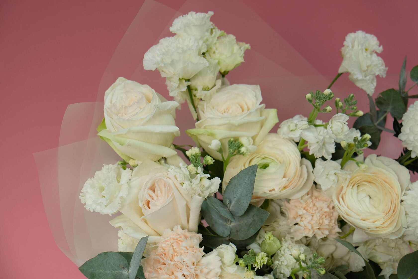 В составе: ранункулюсы, пионовидные розы, сортовая хризантема, маттиола, эустома, гортензия, диантусы, зелень эвкалипта.