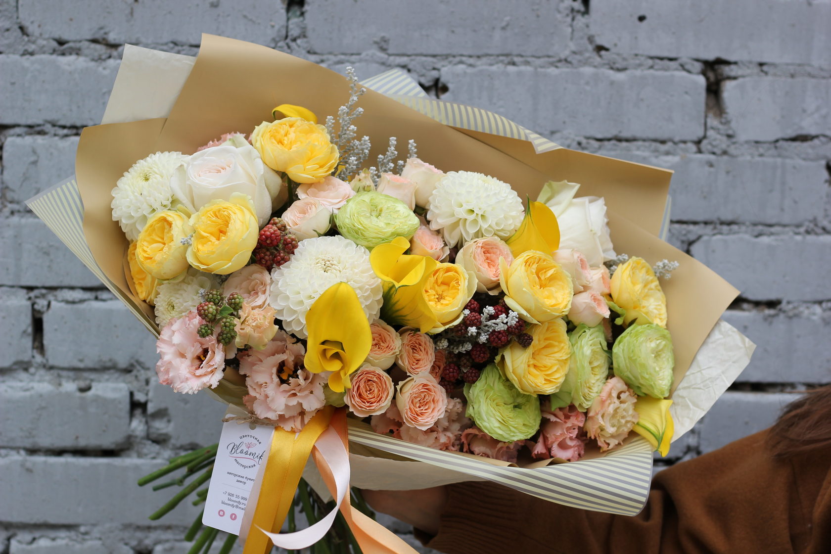 В составе: пионовидные розы Вайт Охара, Каталина, кустовые пионовидные розы Павлова, каллы, георгины, кохия, махровая эустома