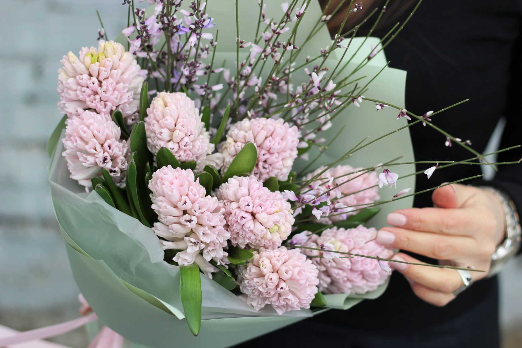 Комбо из нежно-розовых гиацинтов и ароматной генисты лавандового оттенка.