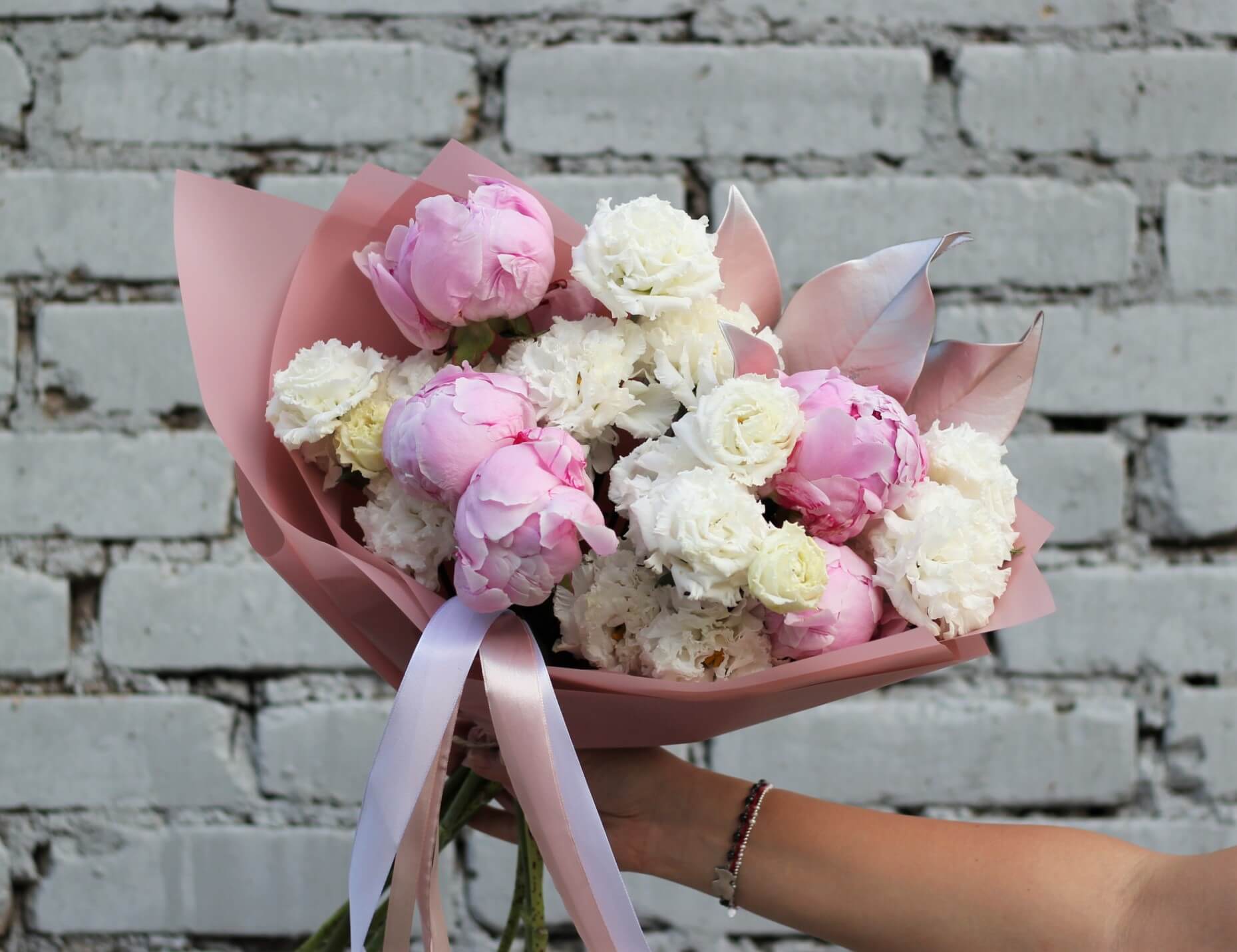 В составе: пионы, эустома Алиса Вайт, крашеные веточки магнолии