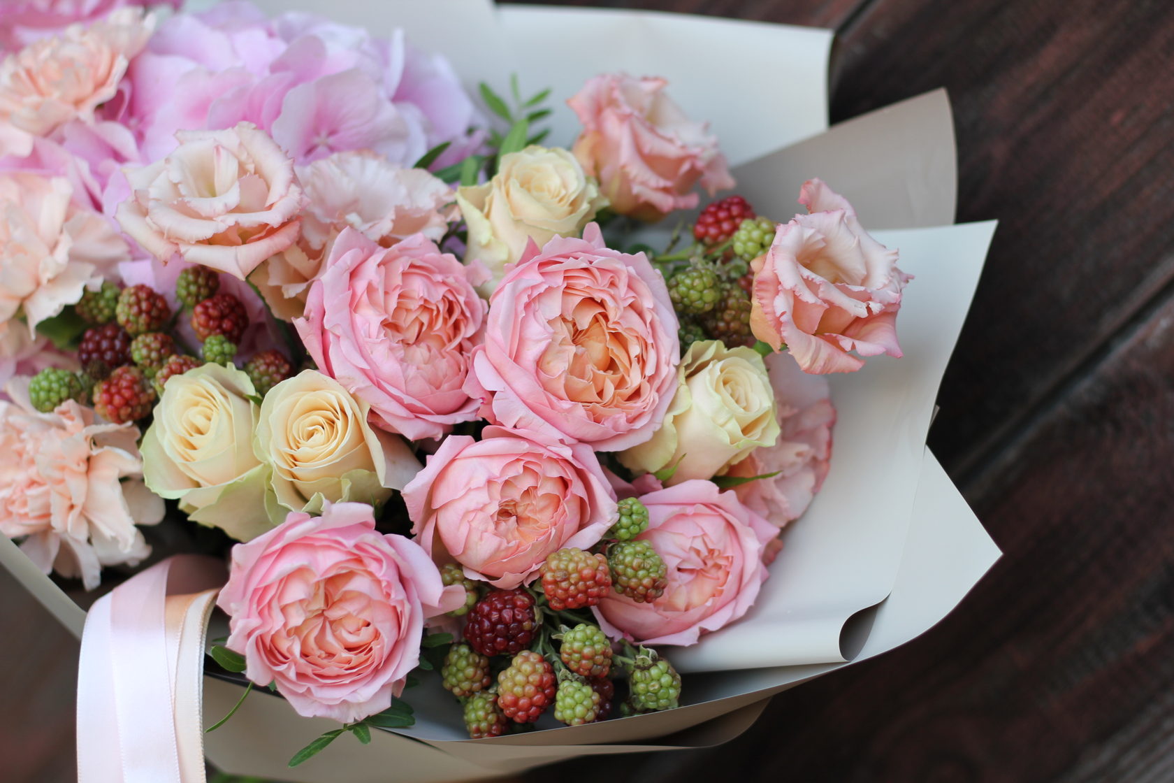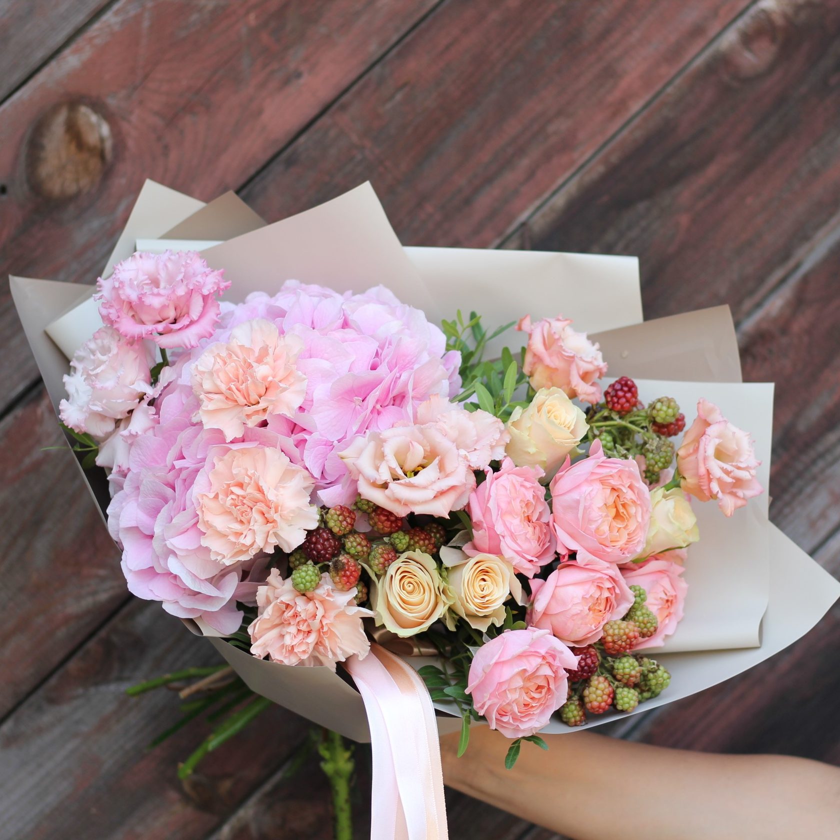 Букет с пионовидными розами Джульетта, гортензией и ягодами еживики