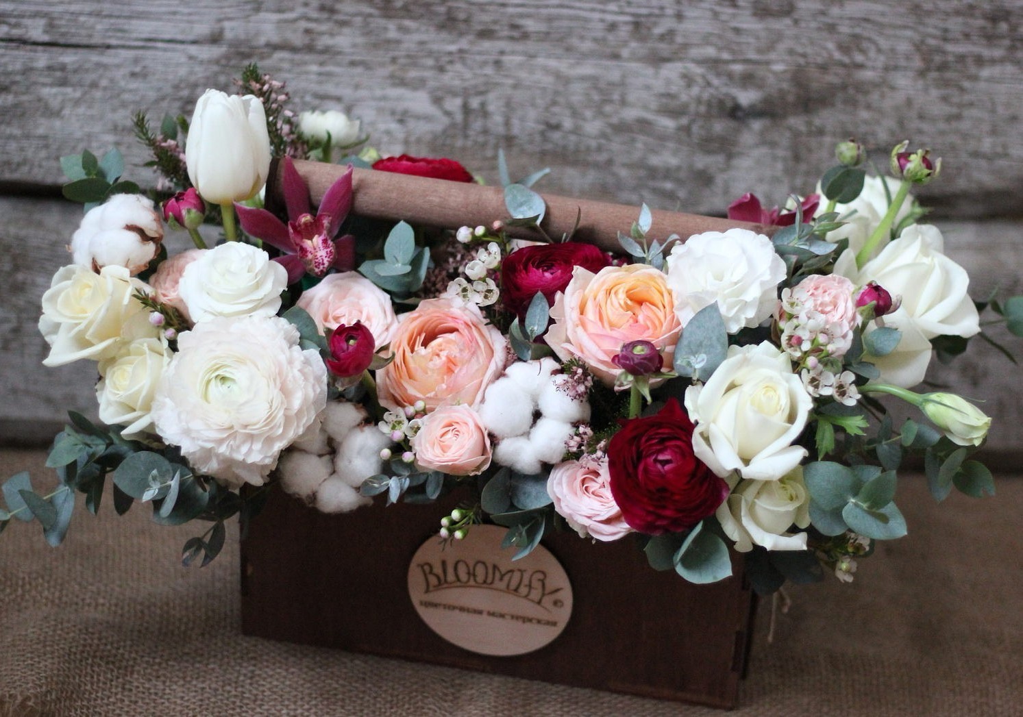 В составе: персиковые пионовидные розы, хлопок, молочные розы, эустома, кустовые пионовидные розы Бомбастик, Ред Лейс, маттиола, шамилациум, орхидея, зелень эвкалипта