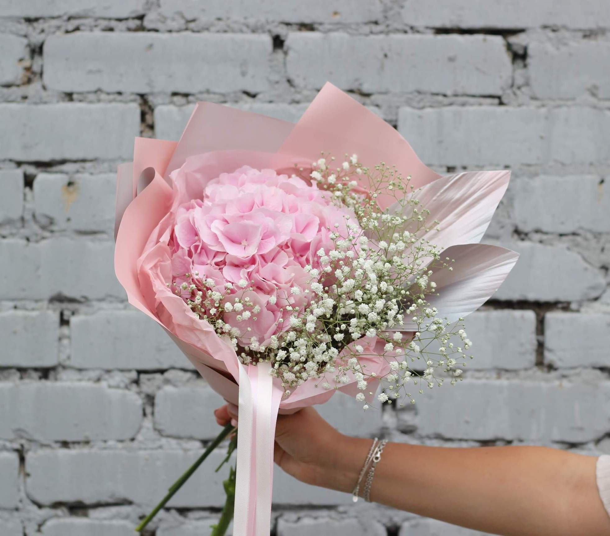 В составе: гортензия, гипсофила, крашеная зелень.