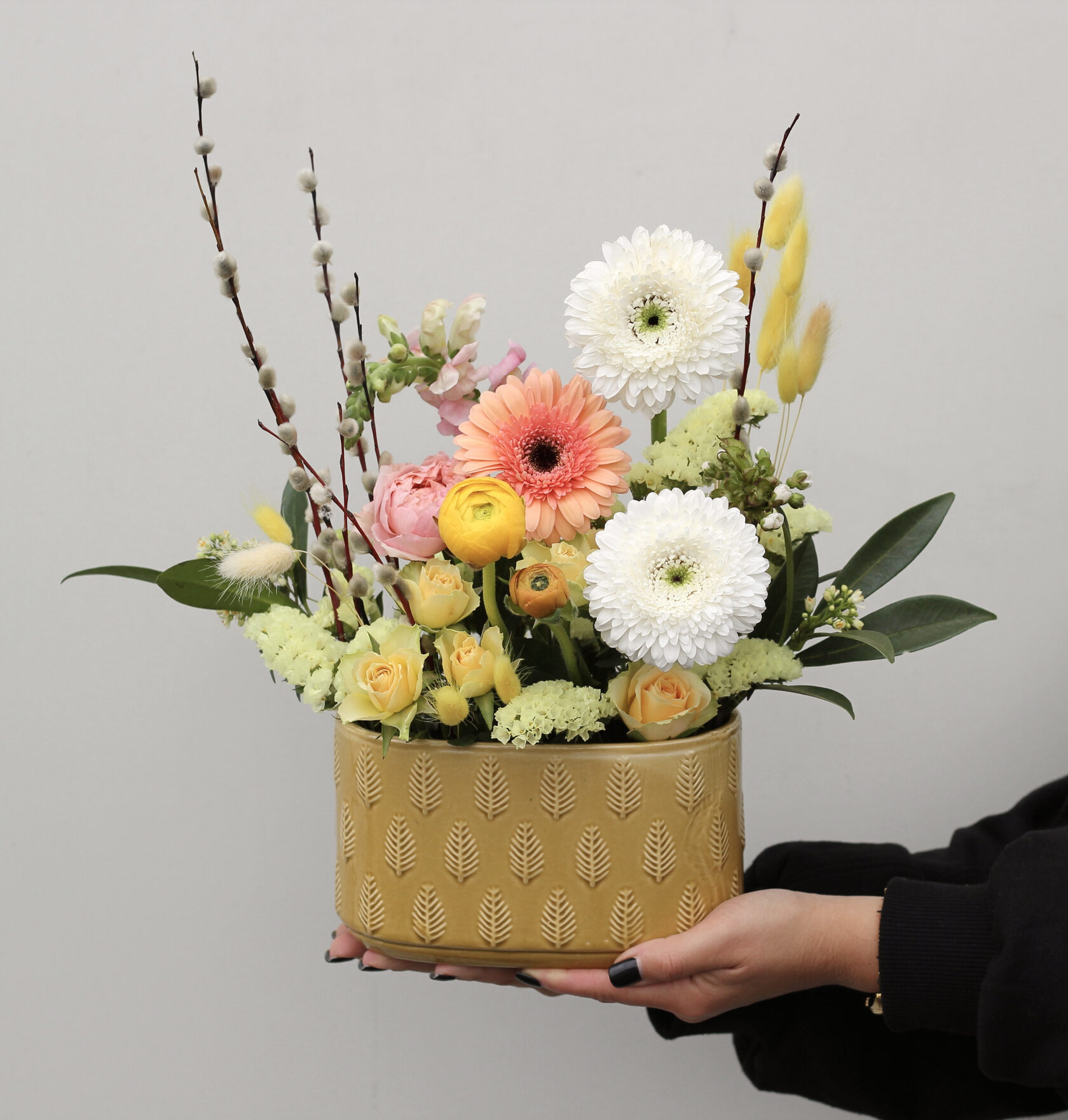 Композиция с веточками вербы и весенними цветами в керамическом кашпо.