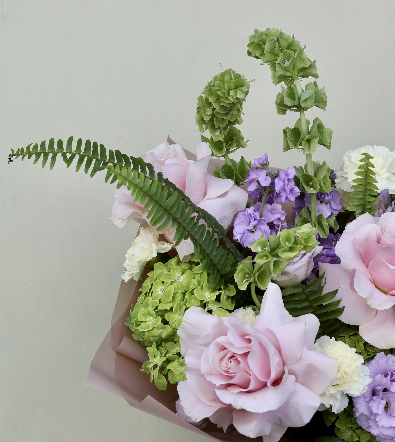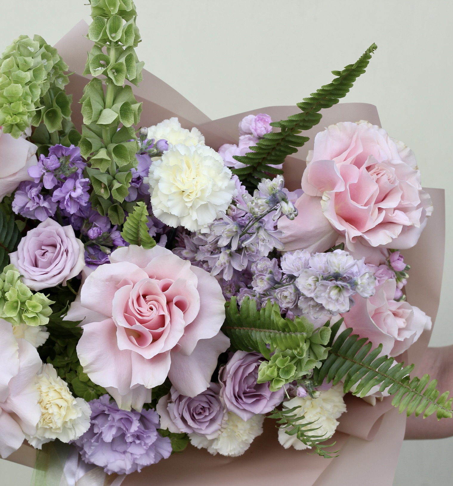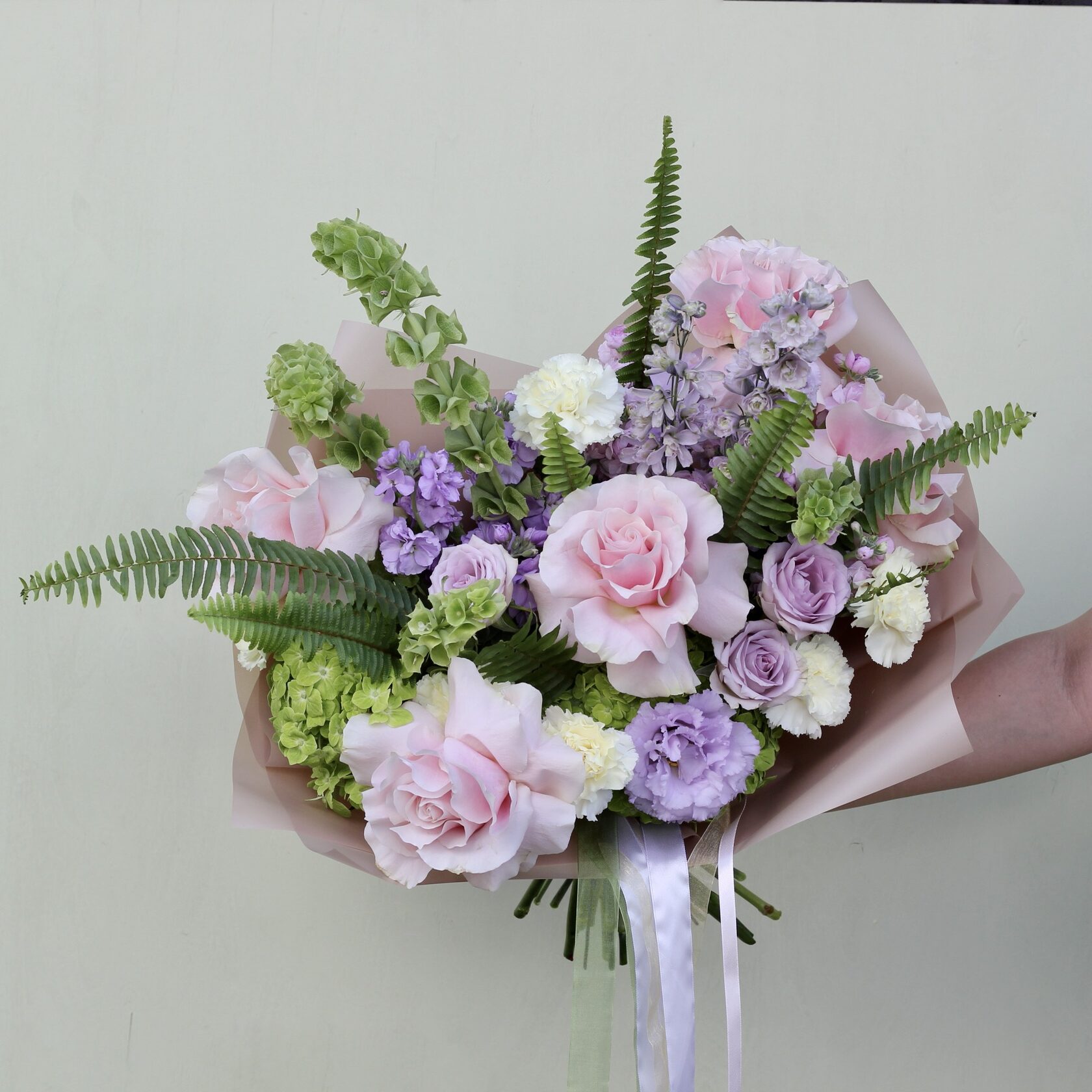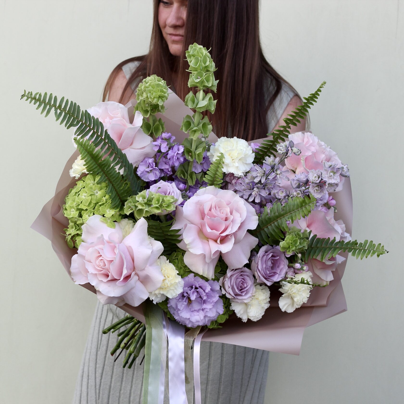 В составе: гортензии, розы Пинк Мондиаль, маттиола, диантус, эустома, дельфиниум, лавандовые розочки, зелень папоротника.