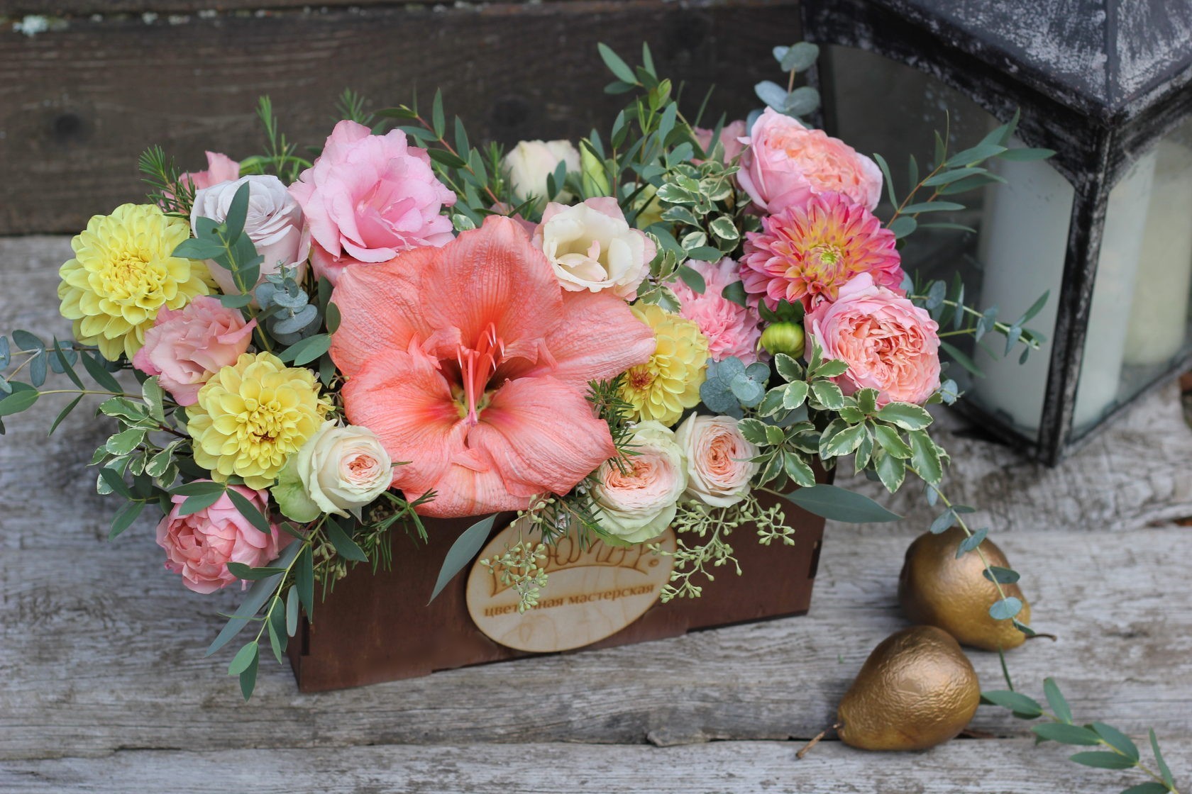 В составе: кустовые пионовидные розы Павлова, Джульетта, георгины, эустома, розы Мента, диантус, амариллис, зелень эвкалипта, зелень питоспорума