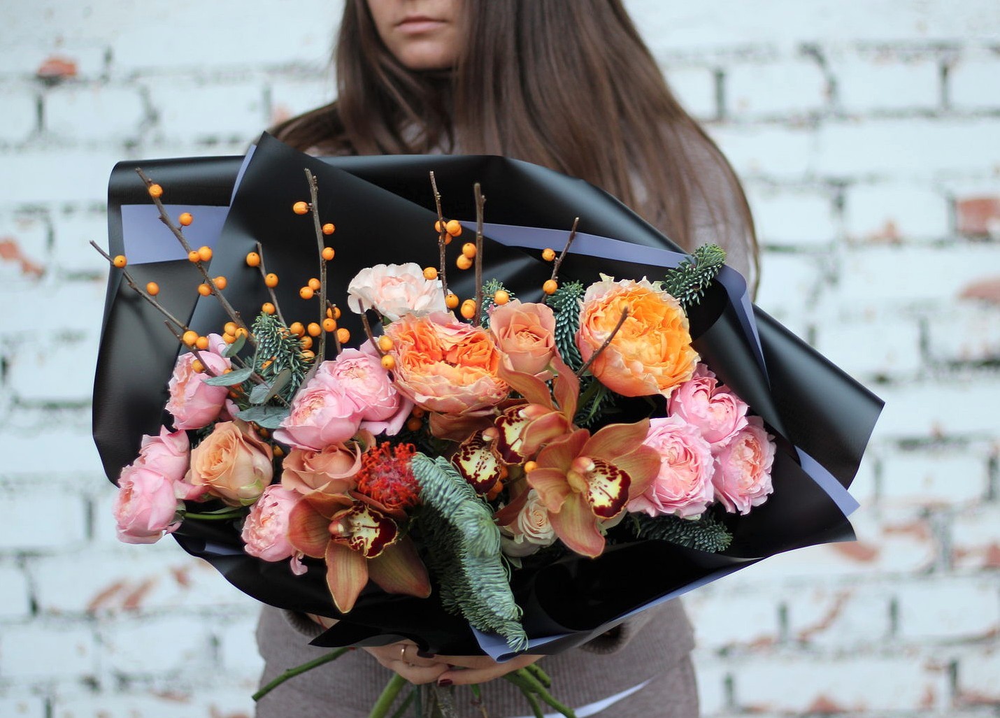 Раскидистый букет с нобилисом (голубой елью), орхидеями и пионовидными розами.