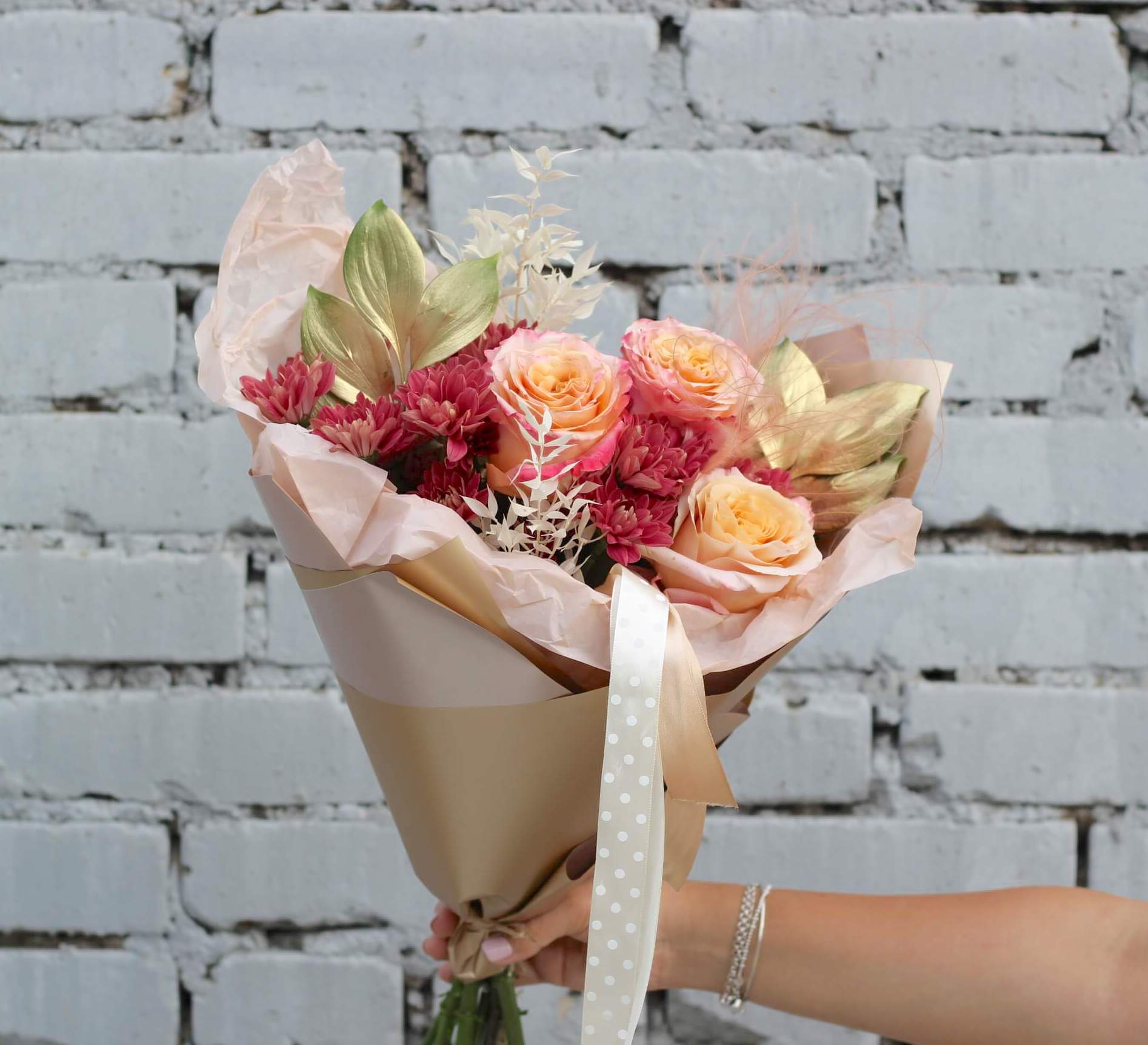 В составе: персиковые пионовидные розы, терракотовя кустовая хризантема, крашеные веточки рускуса, сухоцвет иглица, стифа