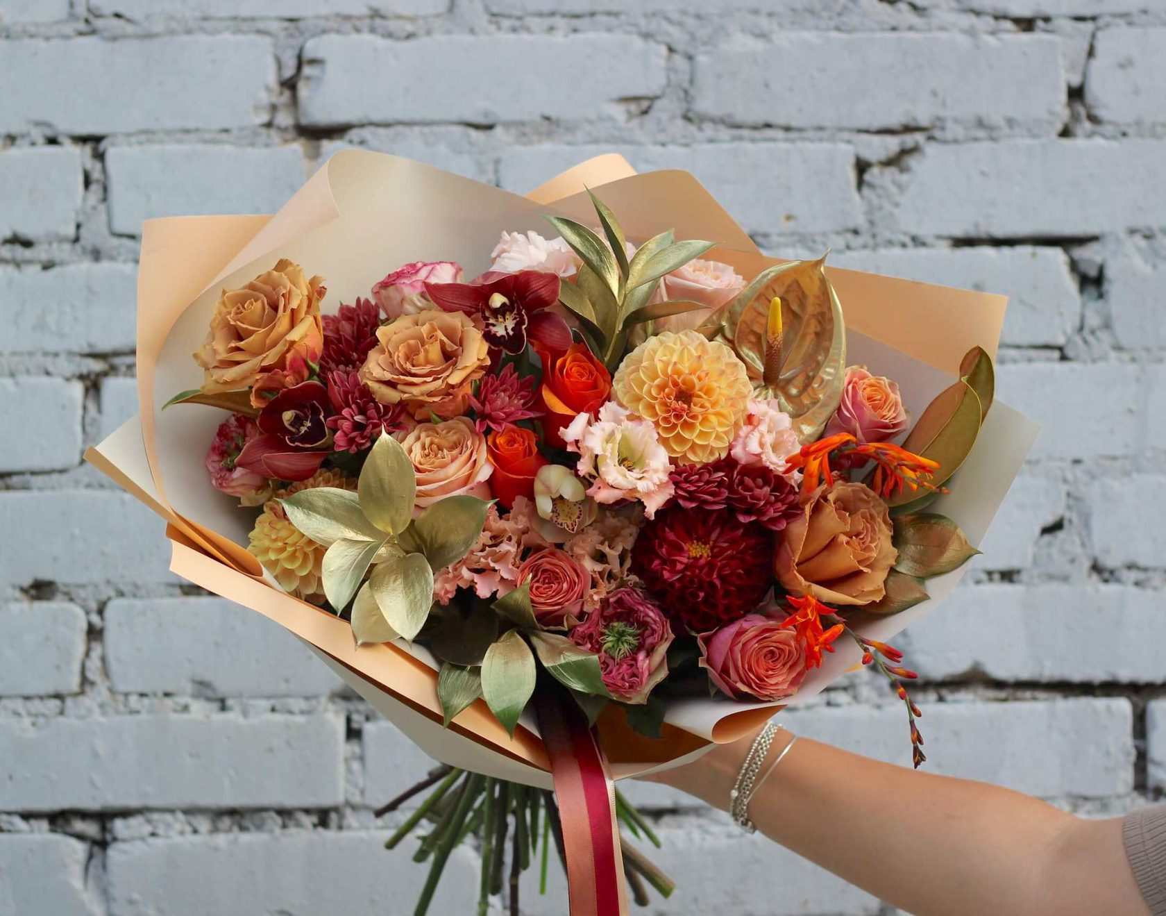 Раскидистый букет в благородных оттенках теплой осени с добавлением золотых элементов.