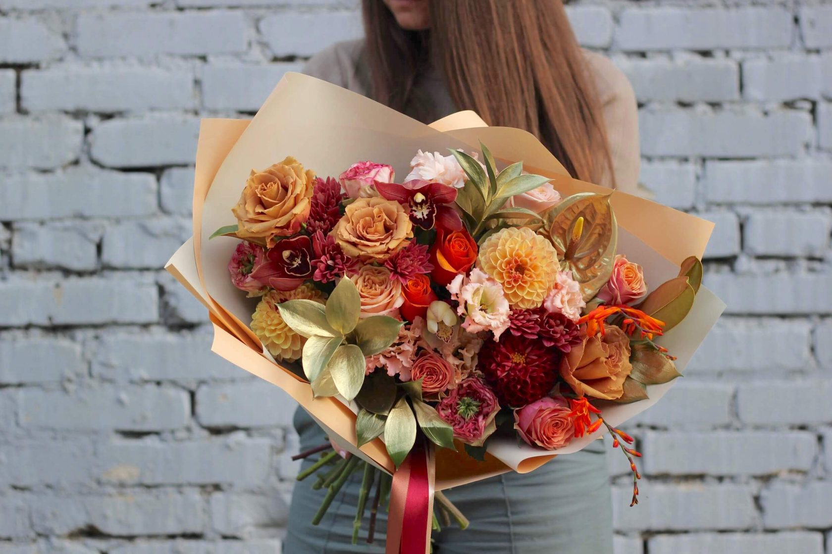 В составе: георгины, терракотовая хризантема, пионовидные розы, антуриум, орхидея цимбидиум, крашеные веточки рускуса.
