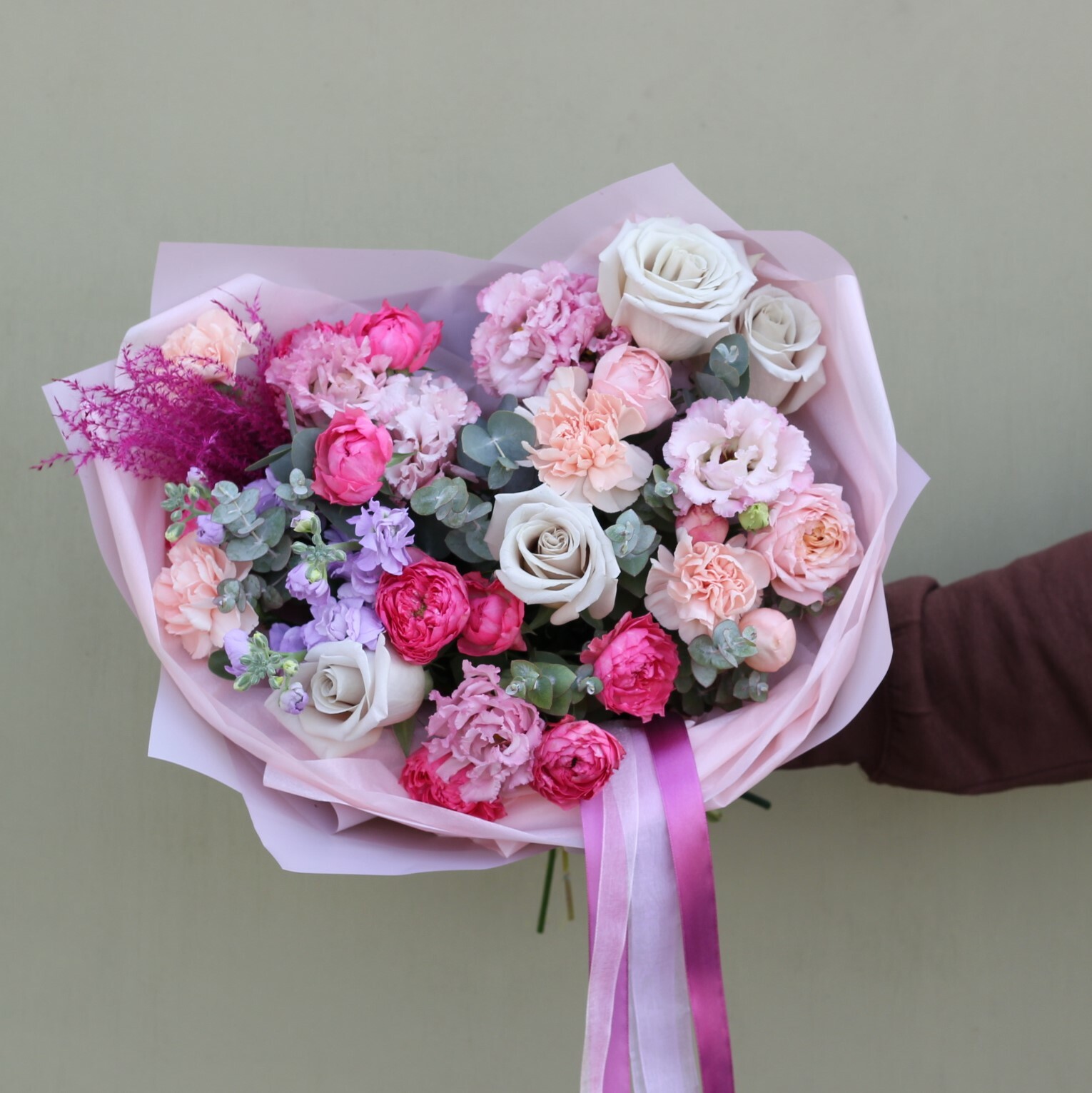 В составе: пионовидная роза Джульетта, маттиола, диантус, эустома, пудровые розы, пионовидные коралловые розы, зелень эвкалипта.