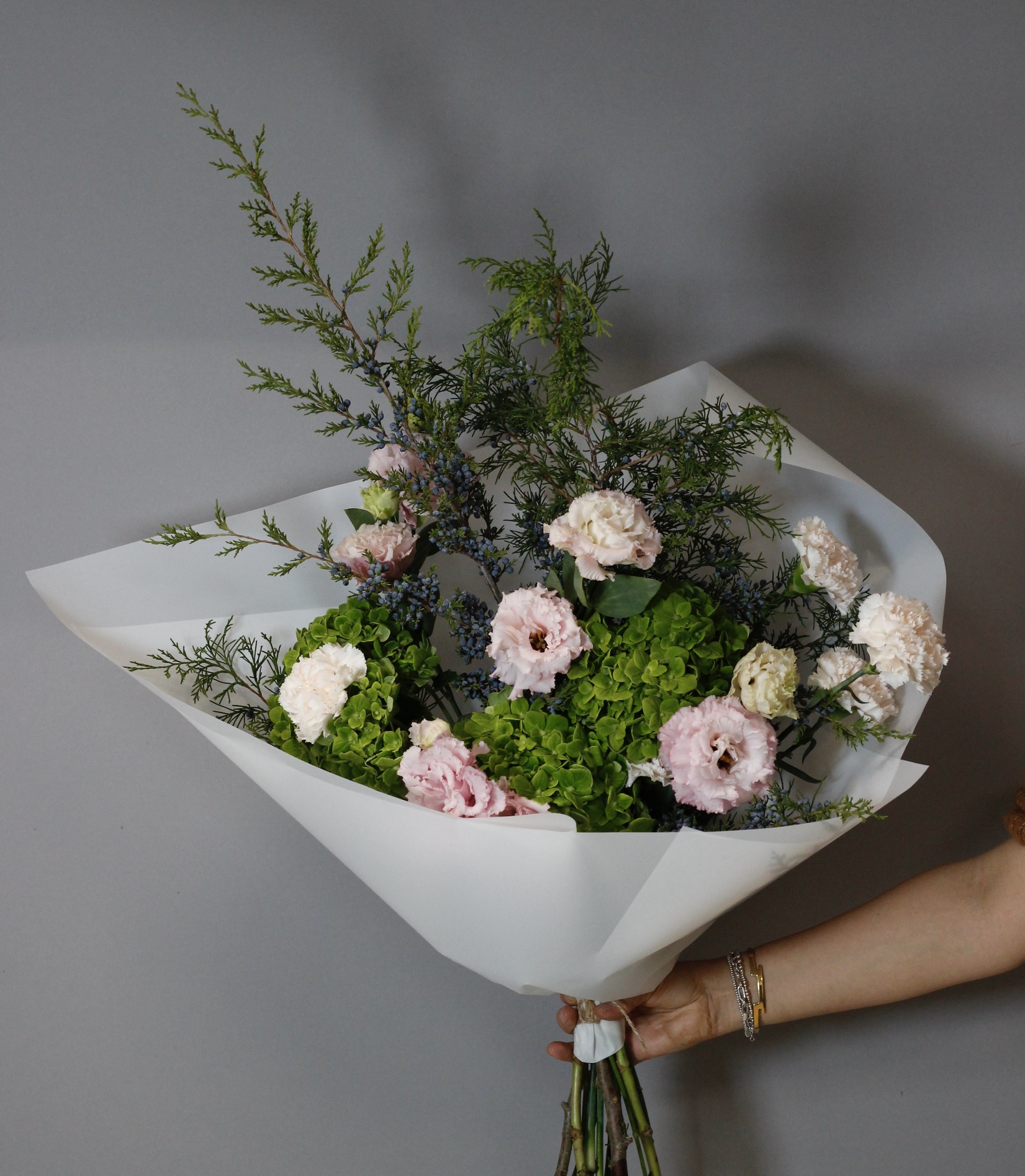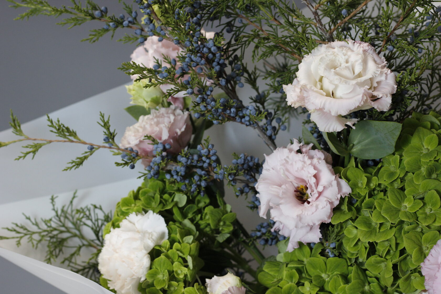 В составе: гортензии, махровая эустома, диантус, хвойные ветки.