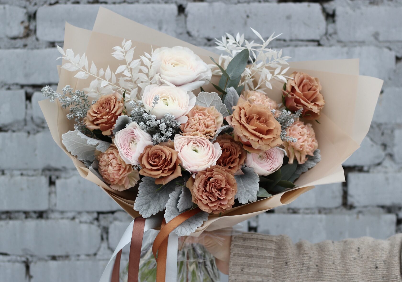 В составе: кофейные розы Тоффи, ранункулюсы, диантусы, кохия, сенецио, зенель эвкалипта, рускус.