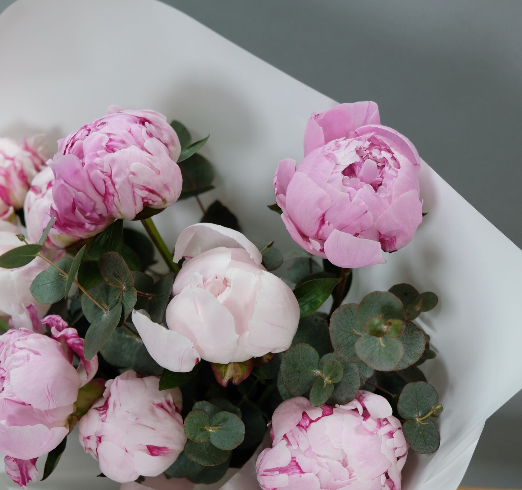 Сезонные пионы в раскидистой садовой сборке с добавлением эвкалипта. Неплотное расположение стеблей друг к другу делает букет дышащим, свободным, будто только что сорванным из вашего летнего сада.