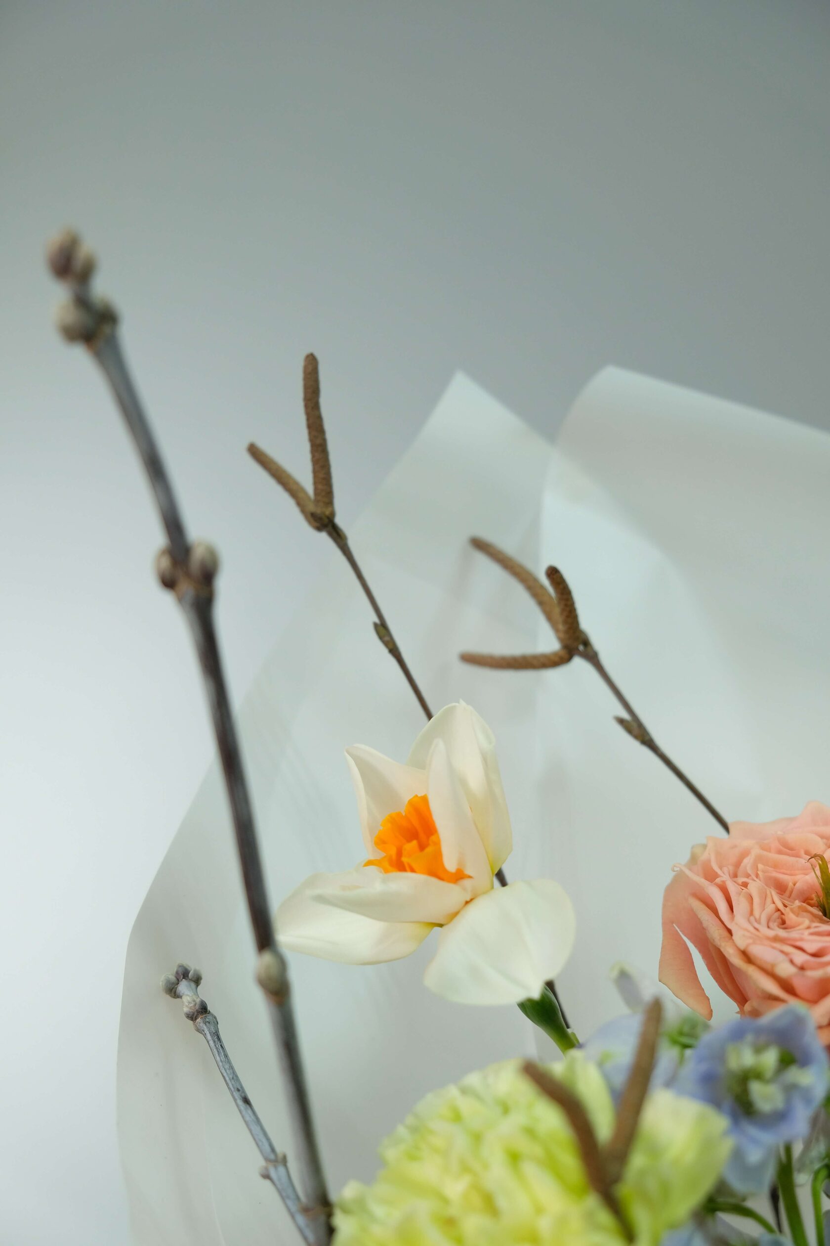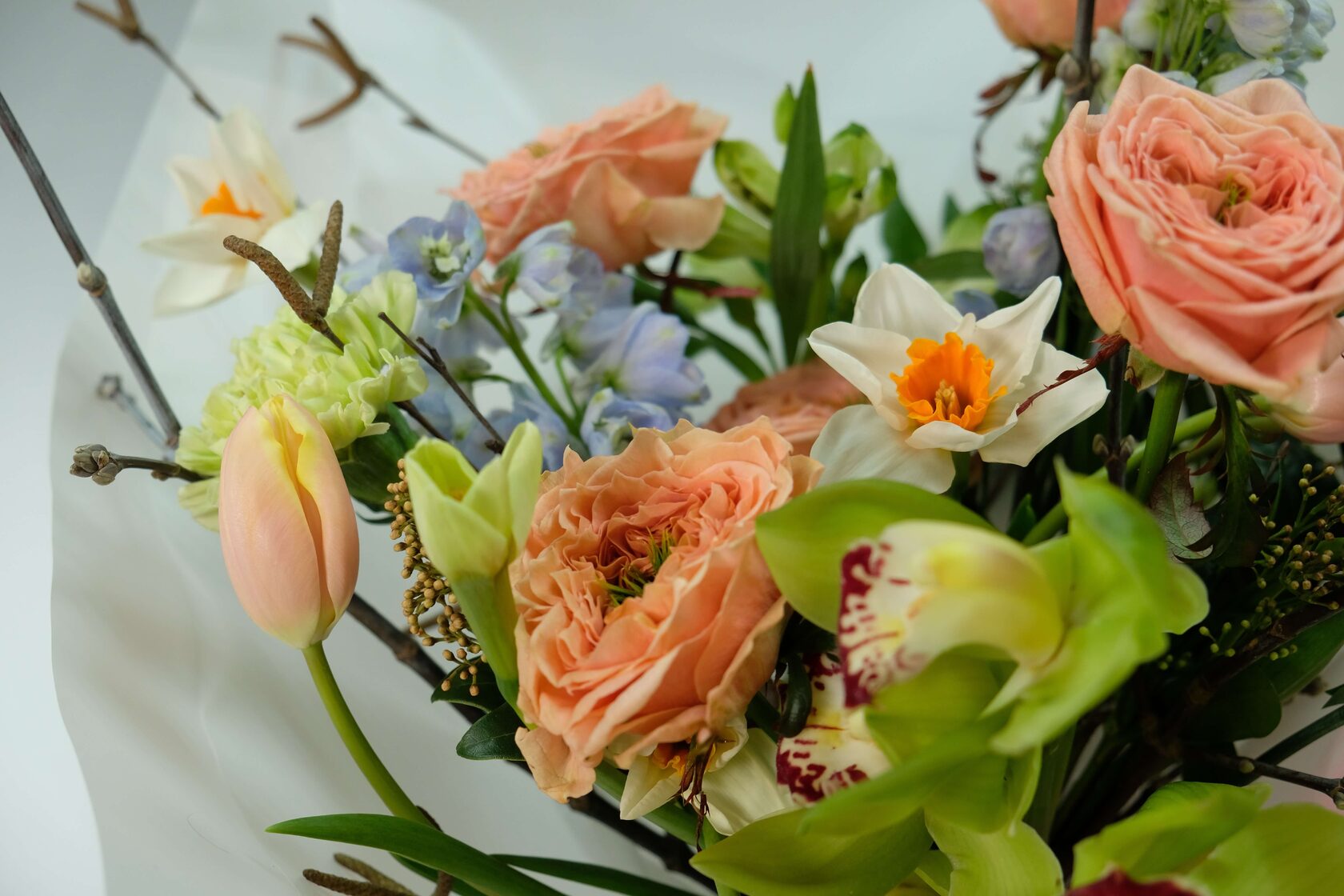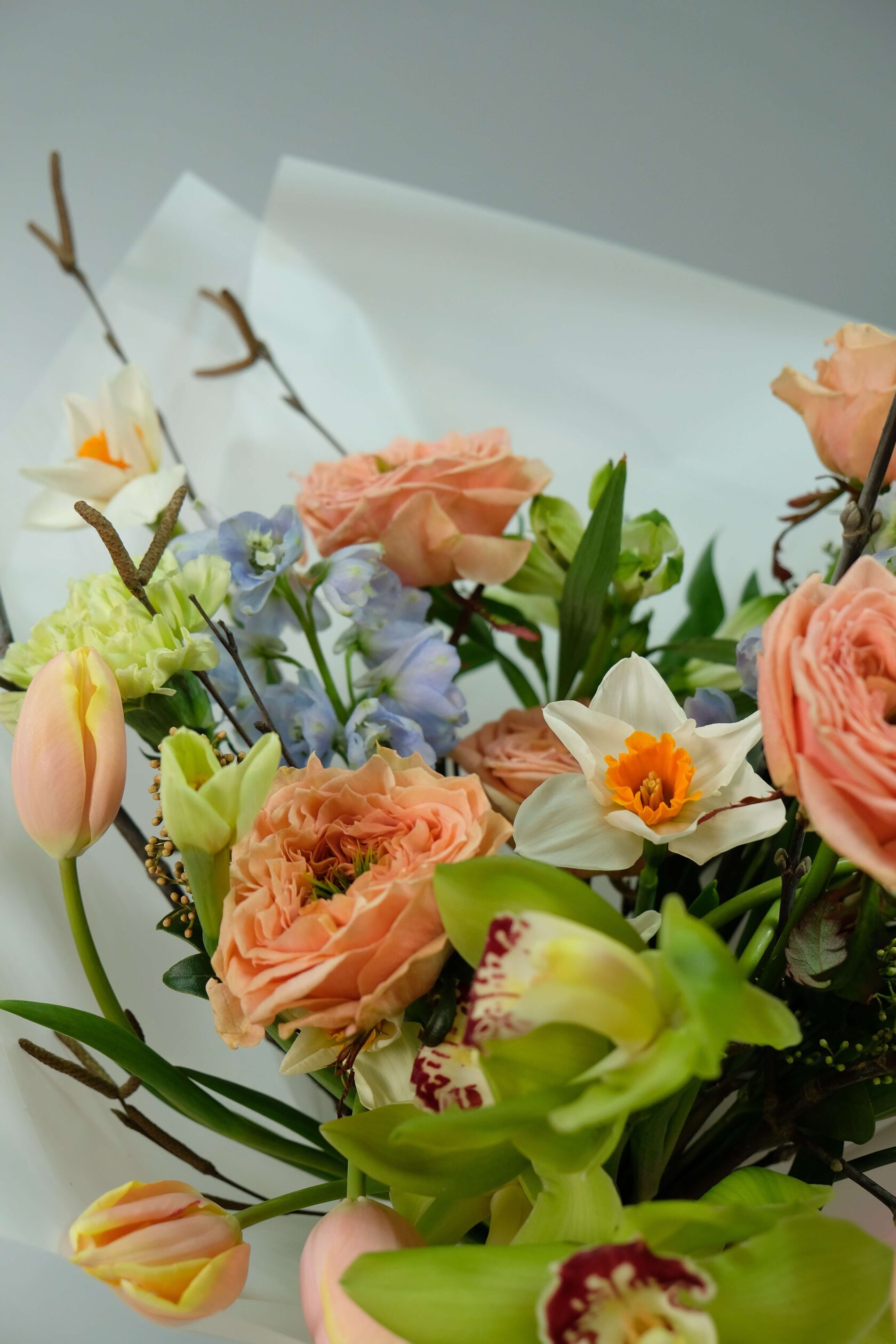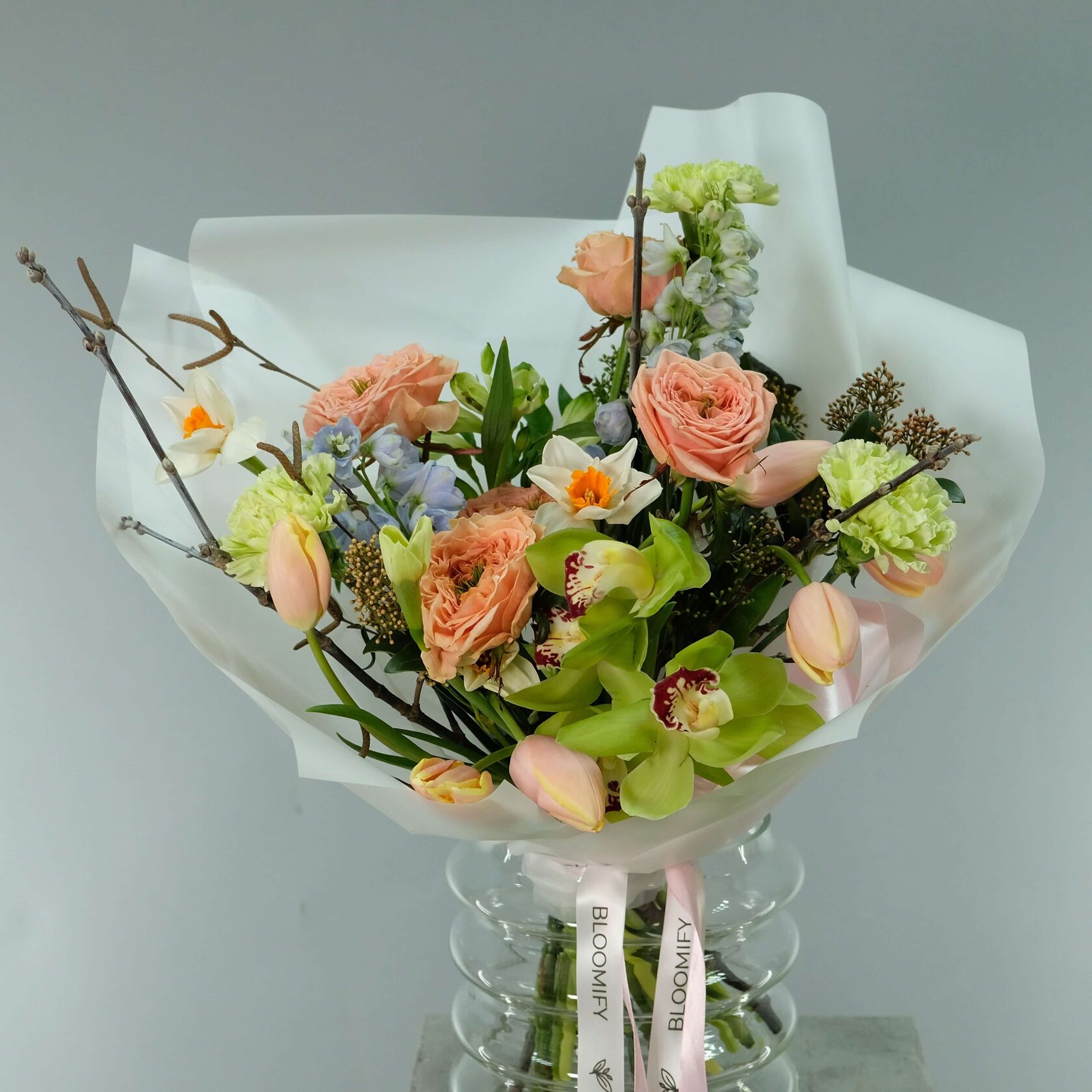 В составе: пионовидные розы Питер Парк, тюльпаны, нарциссы, альстромерия, дельфиниум, скимия, диантус, орхидея, ветки.