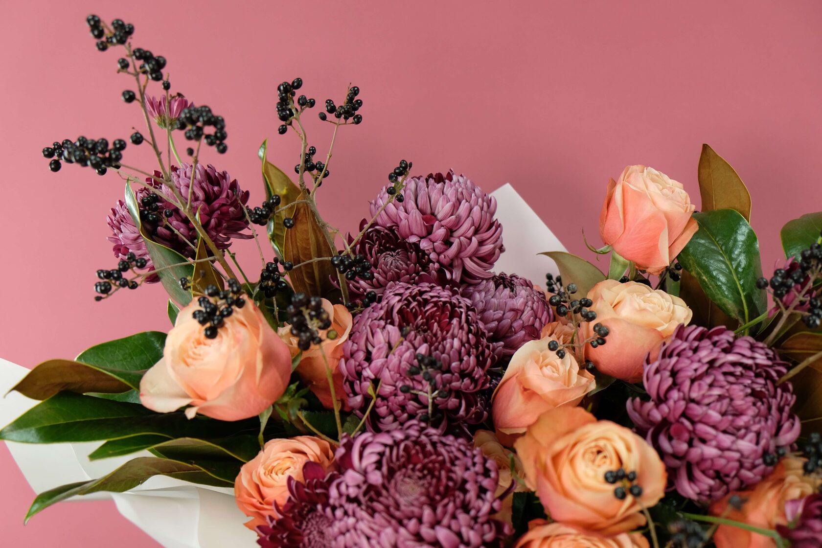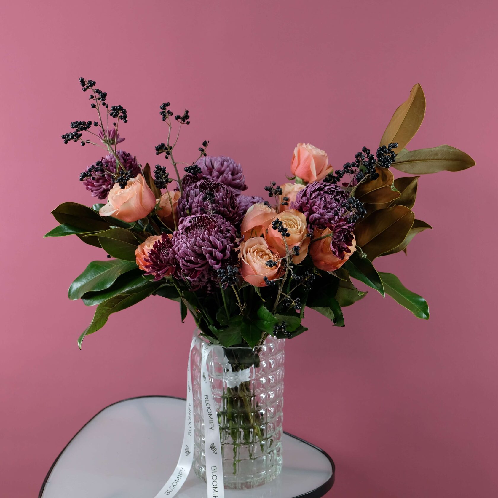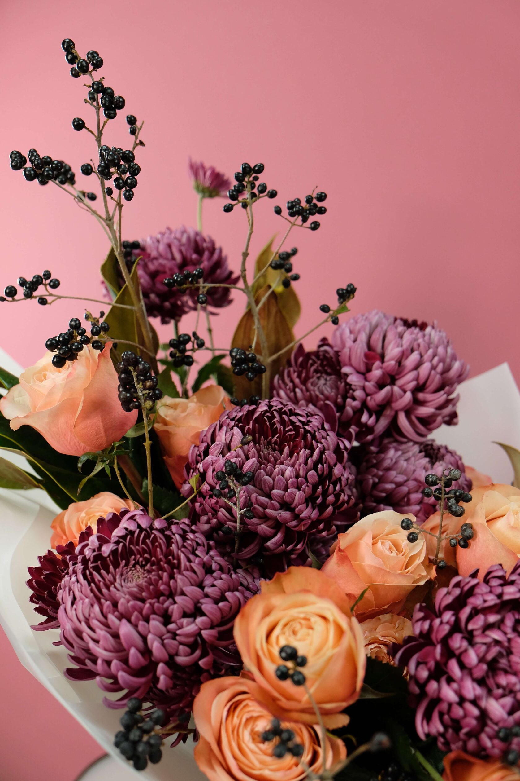 В составе: винные хризантемы, пионовидные розы, листья магнолии, ягоды