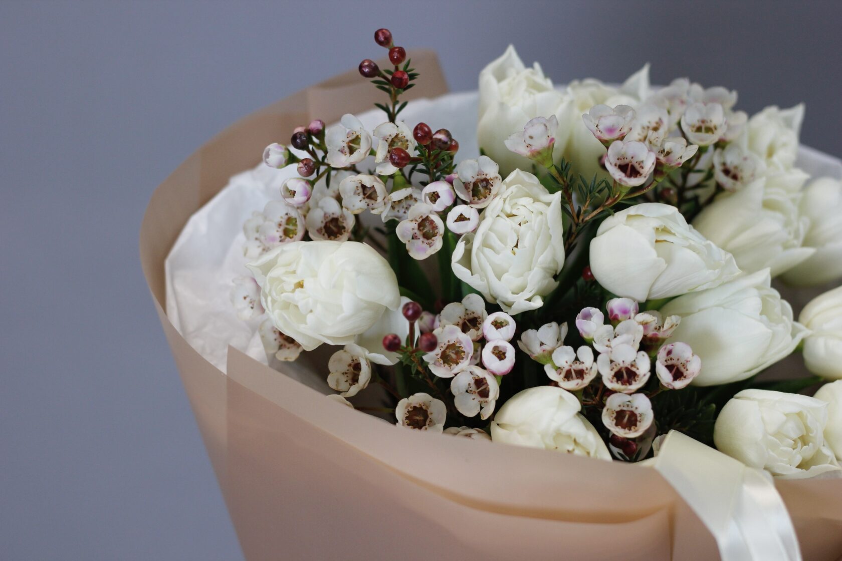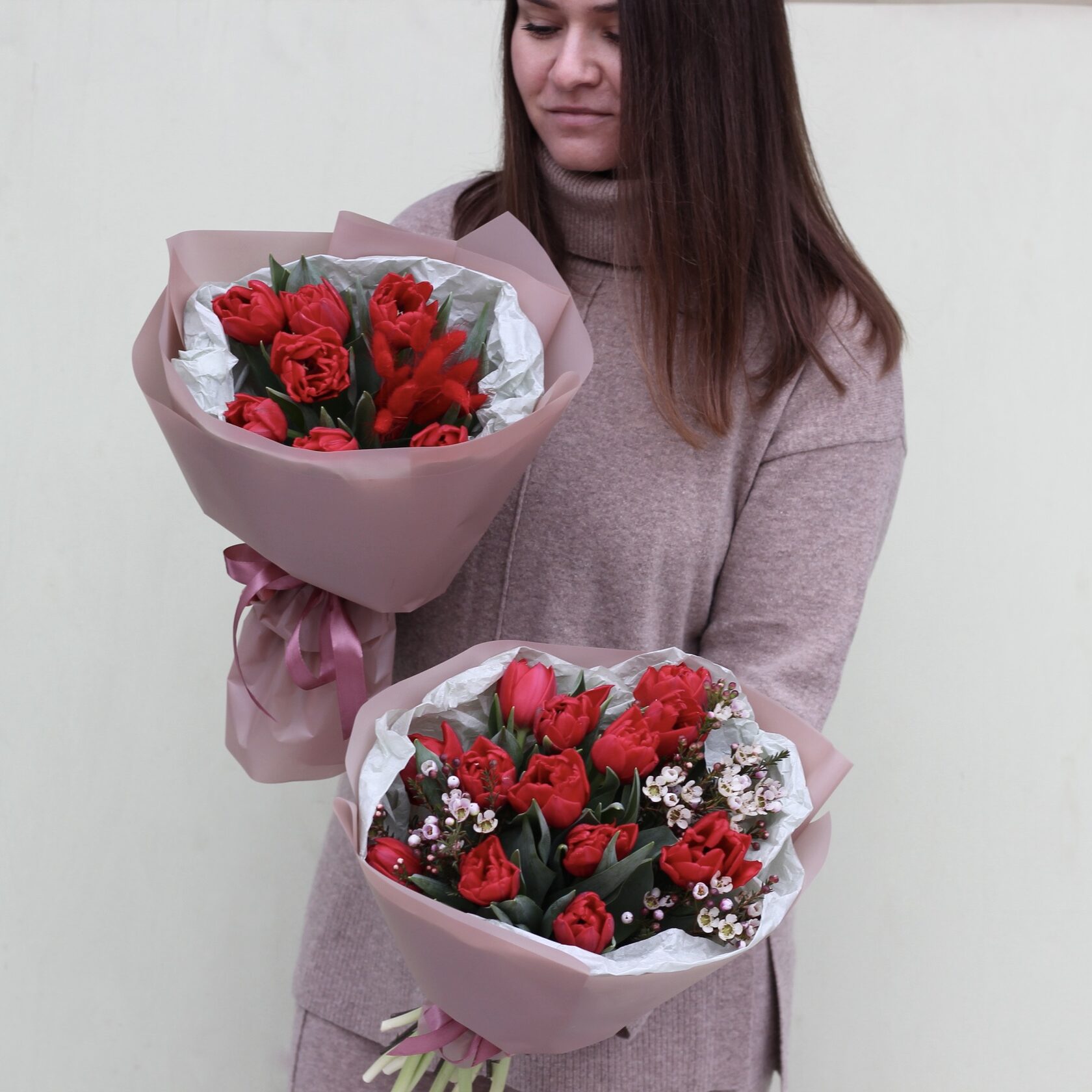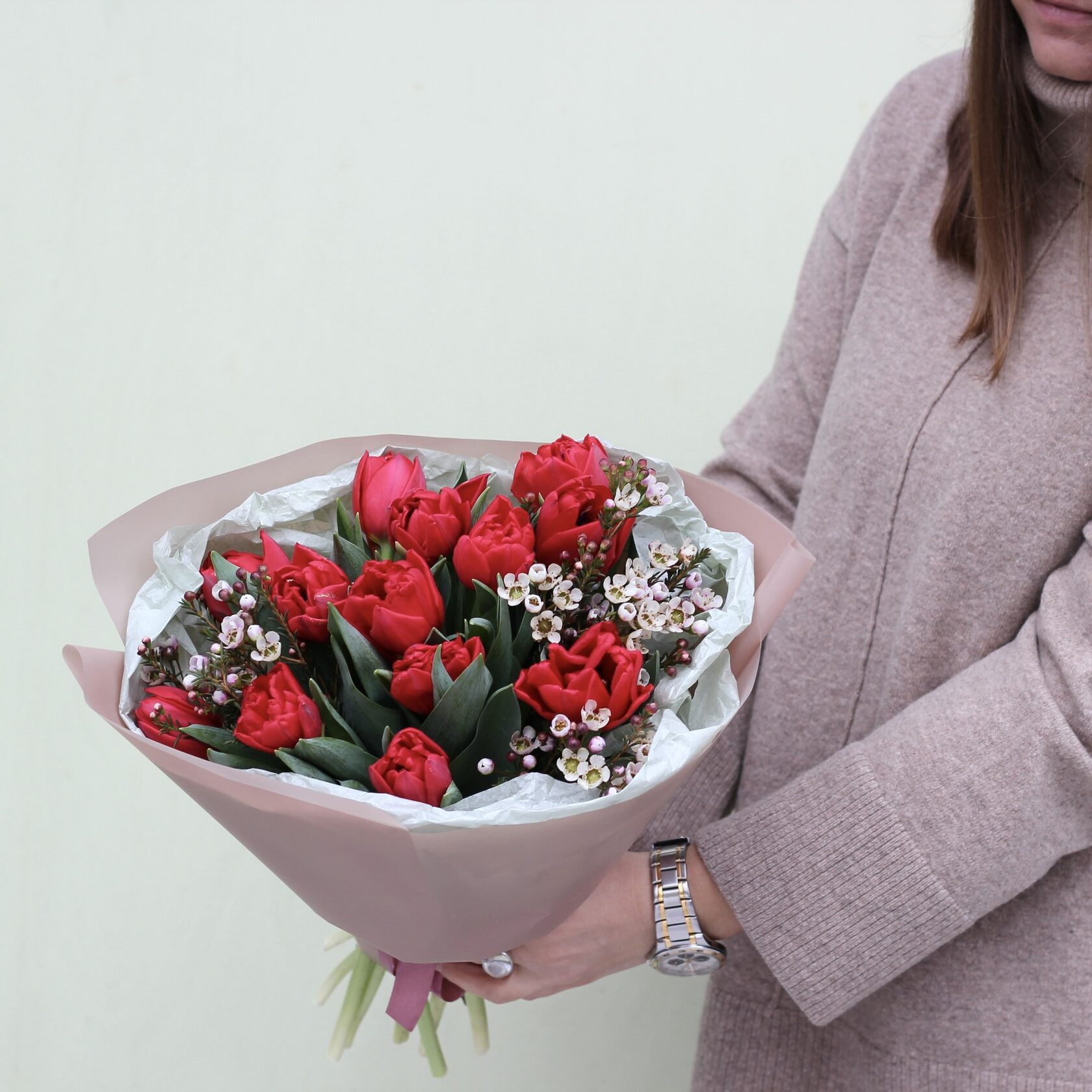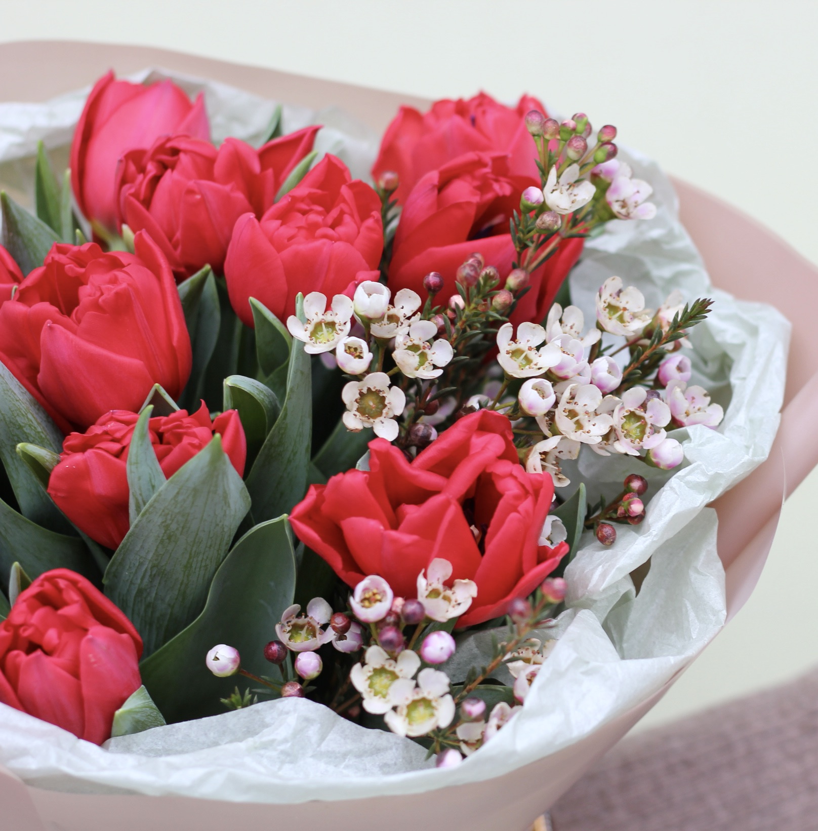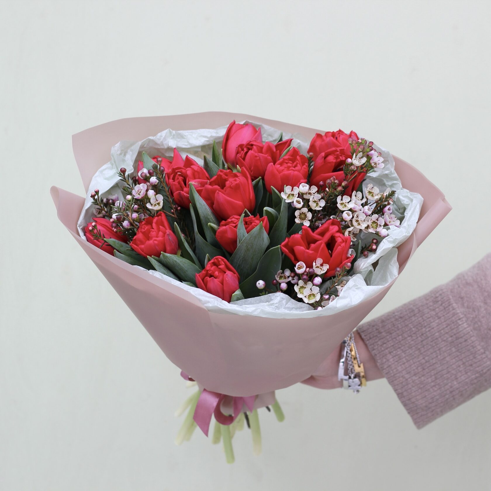 Букет-комплимент из пионовидных тюльпанов и веточек шамилациума.