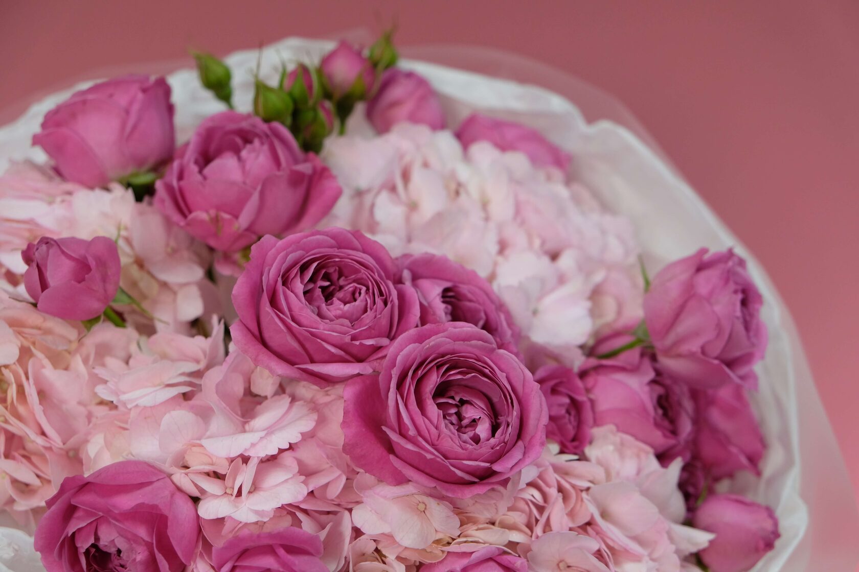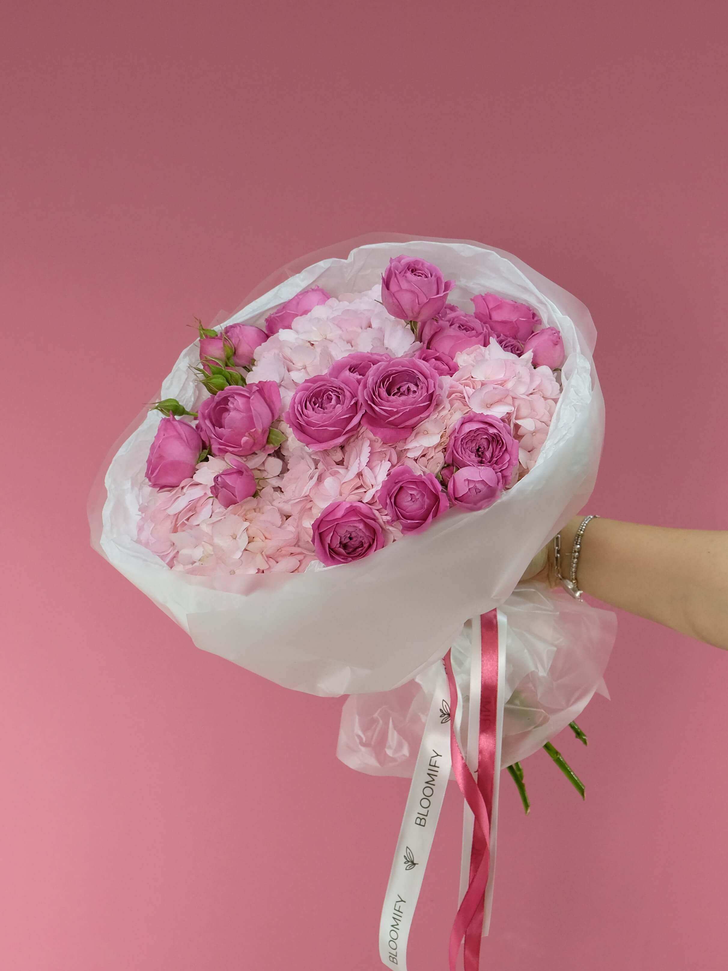 Комбо из ароматных пионовидных роз Мисти Баблс и воздушных облаков гортензий. Она точно оценит!