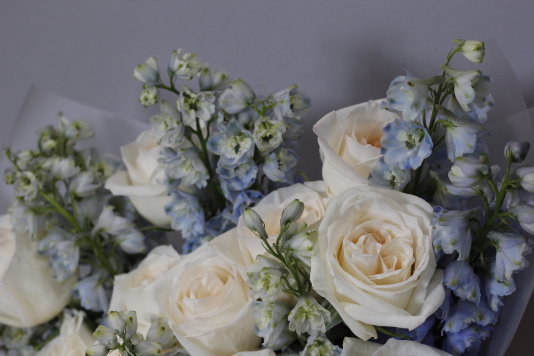 В составе: пионовидные розы Вайт Охара, дельфиниум.