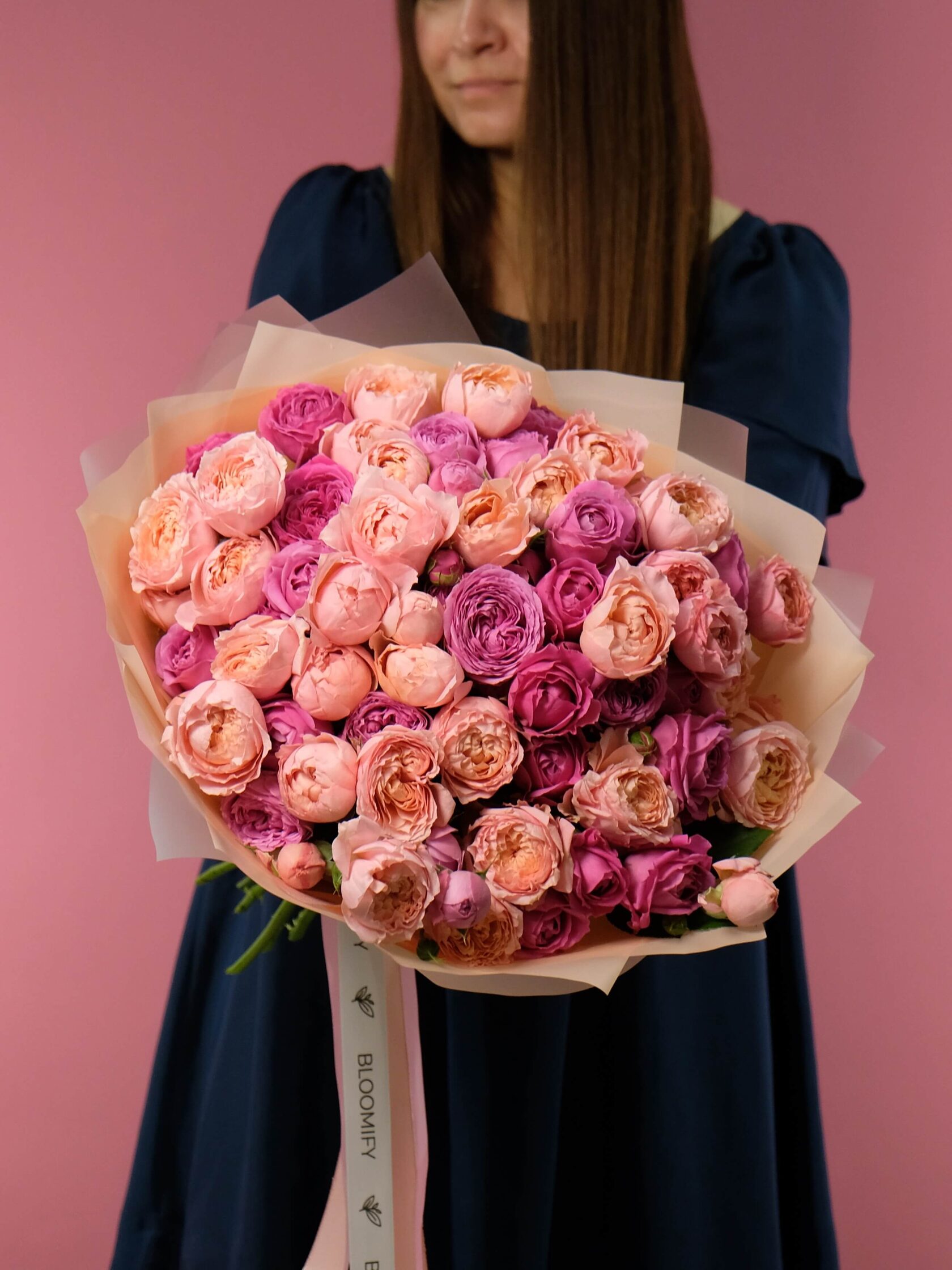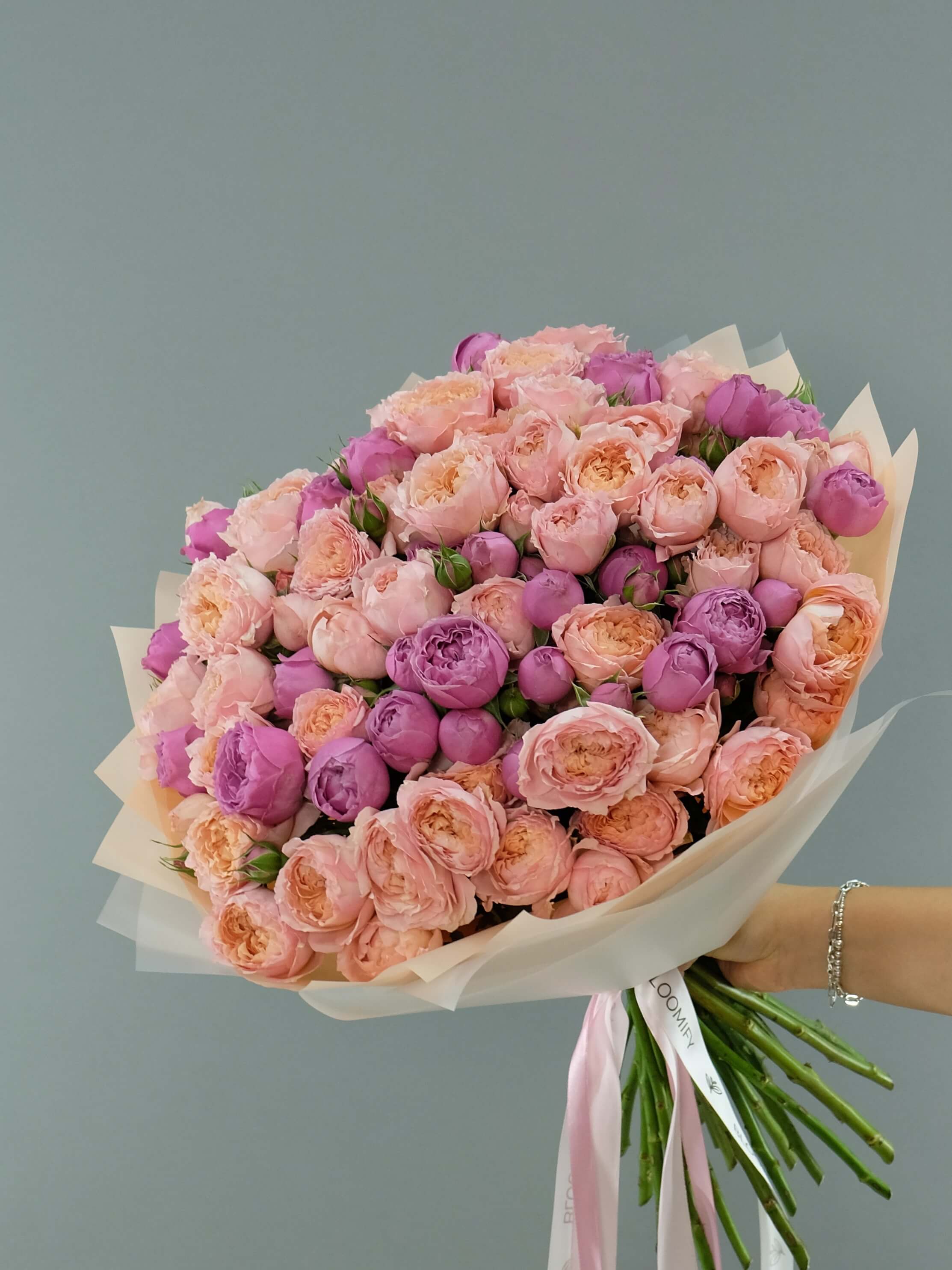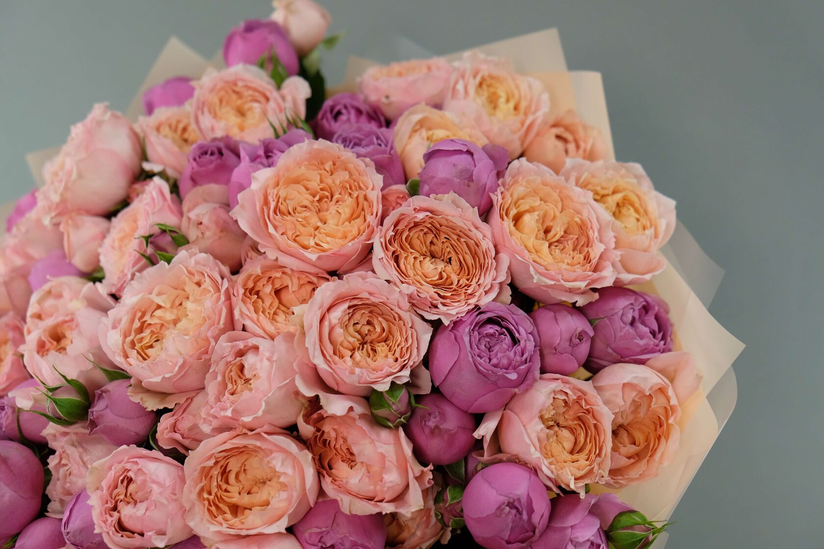 Дуобукет из кустовых пионовидных роз Джульетта и ароматных пионовидных роз Мисти Бабблз.