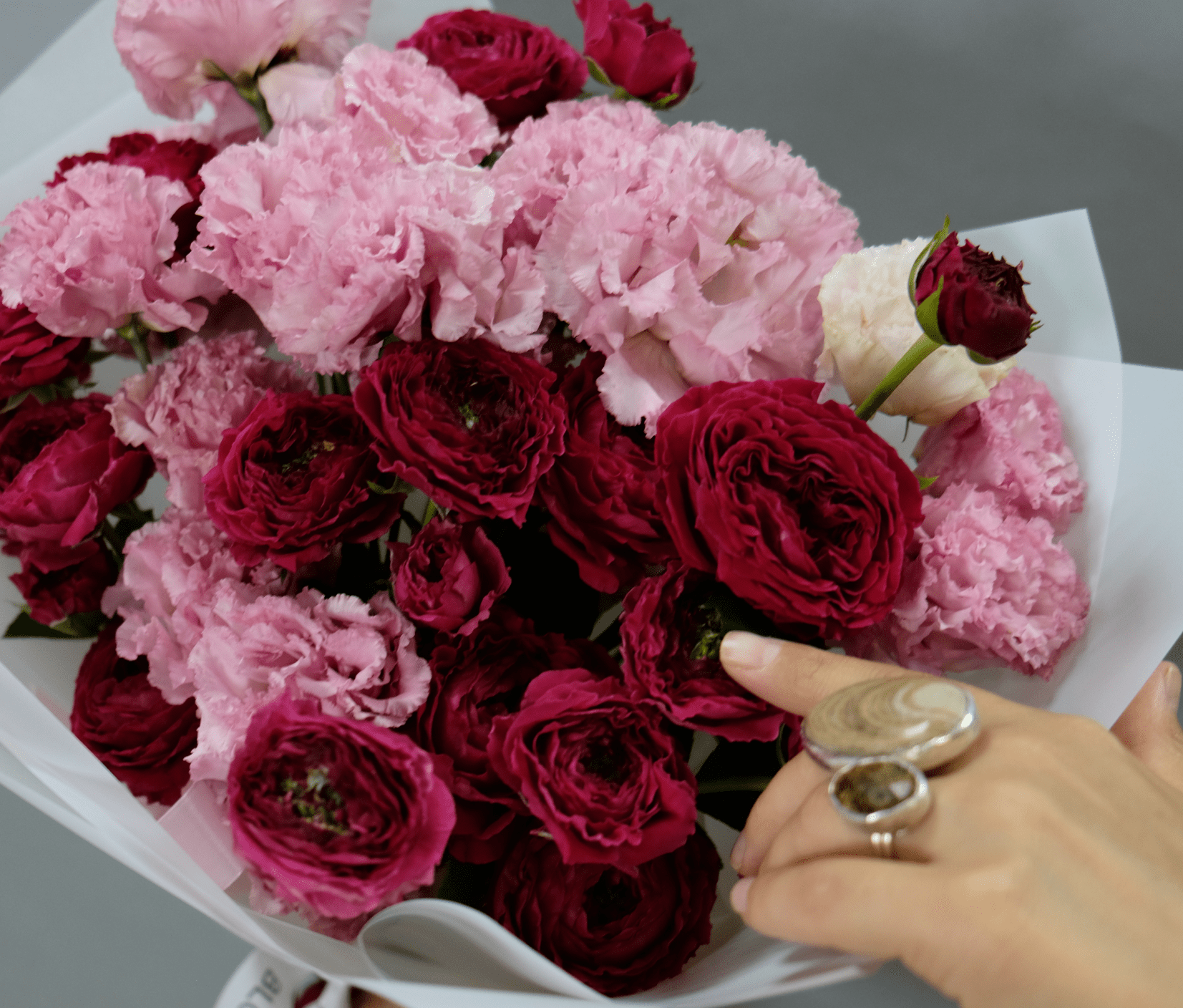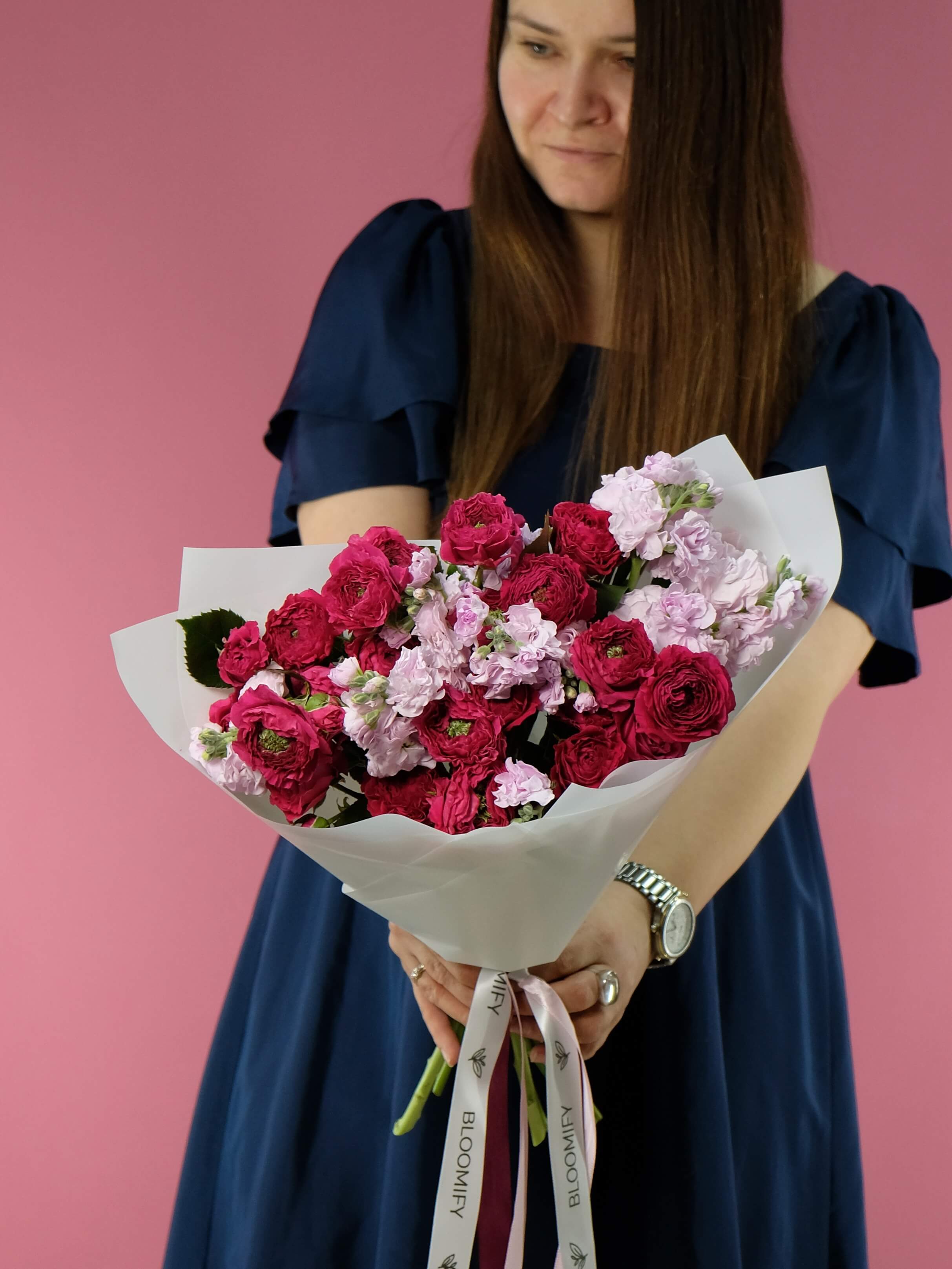 Раскидистый авторский букет со стойким составом, сочетающий в себе глубокие винные и нежные розовые оттенки.