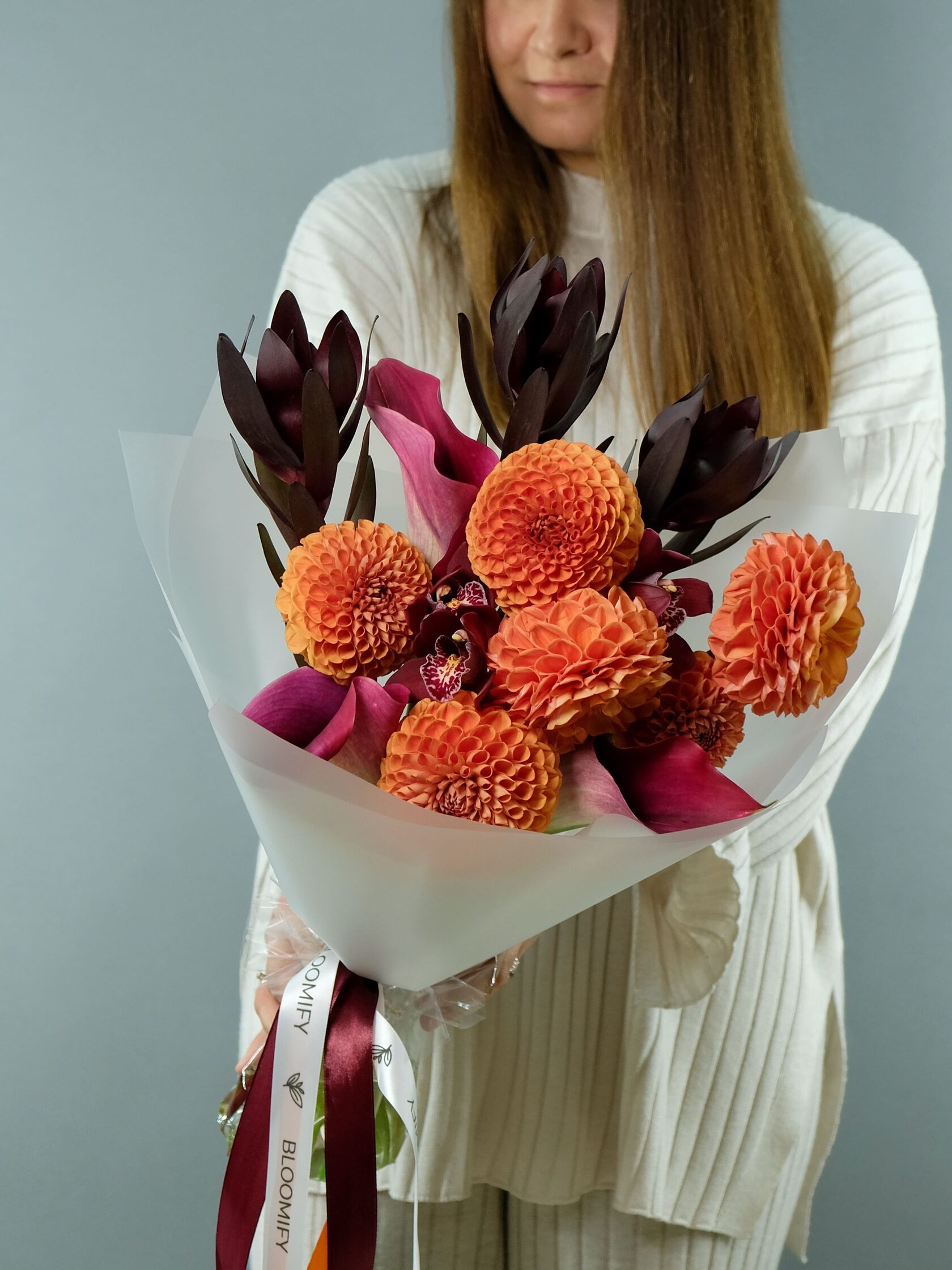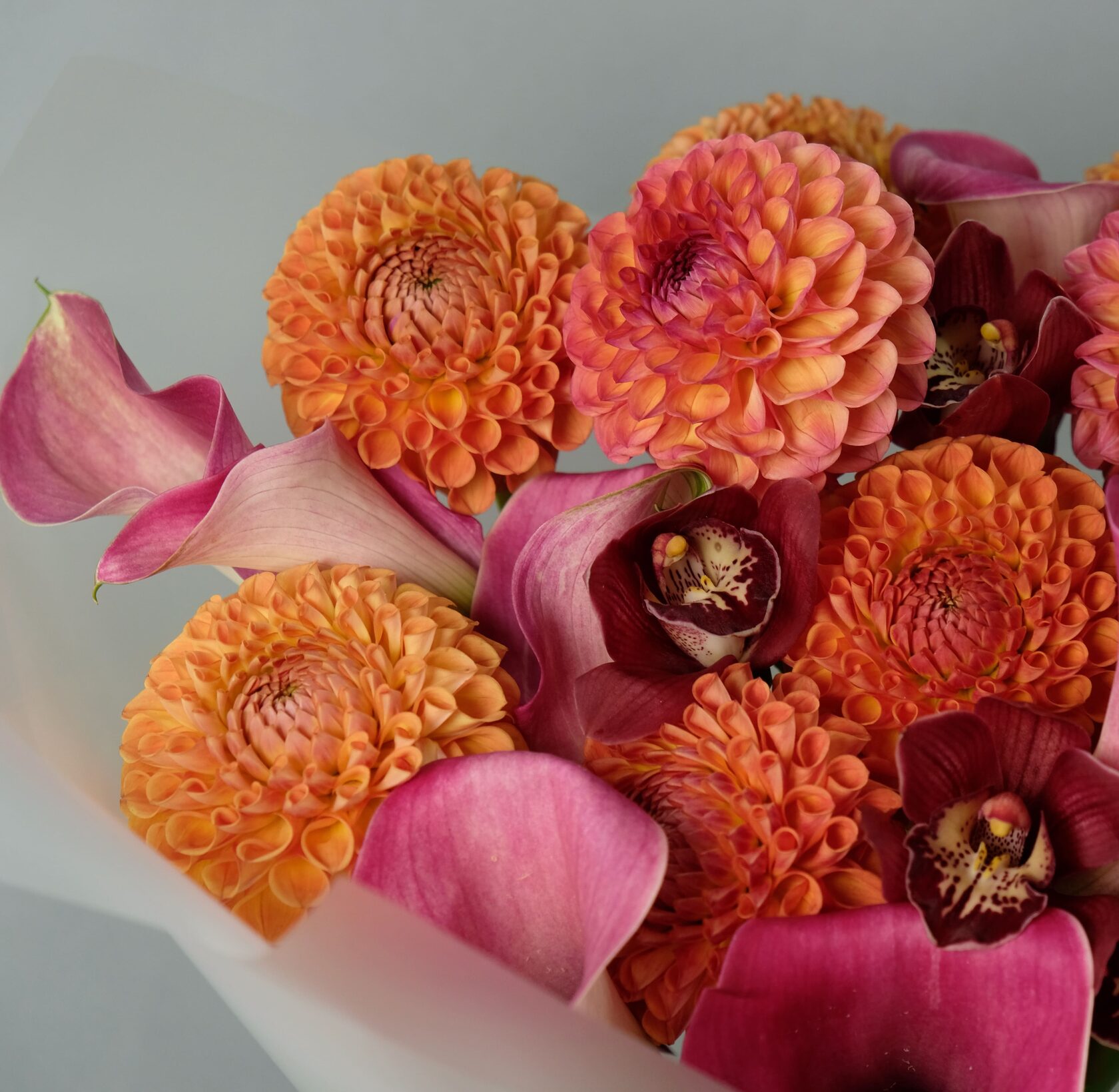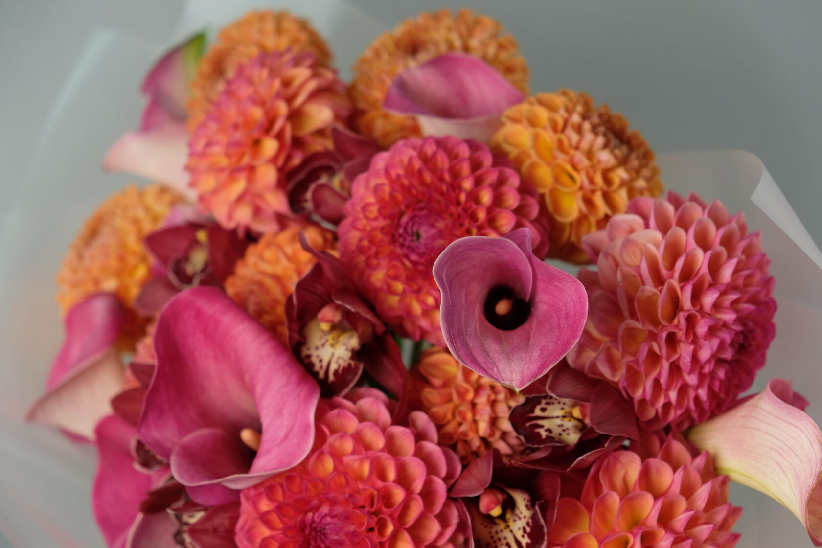 Букет из сезонных георгинов, калл и орхидей. Осенняя насыщенная гамма и красивое сочетание оттенков.