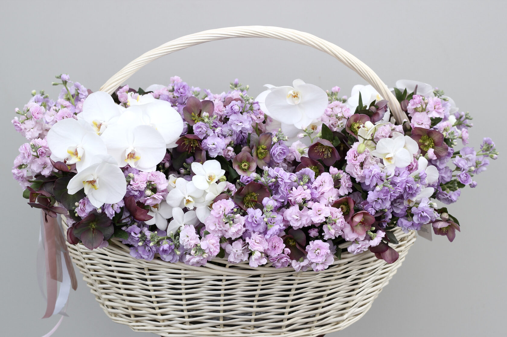 В составе: кустовая маттиола, хелеборус, фаленопсисы.