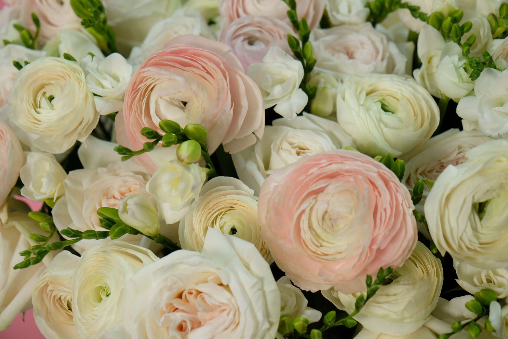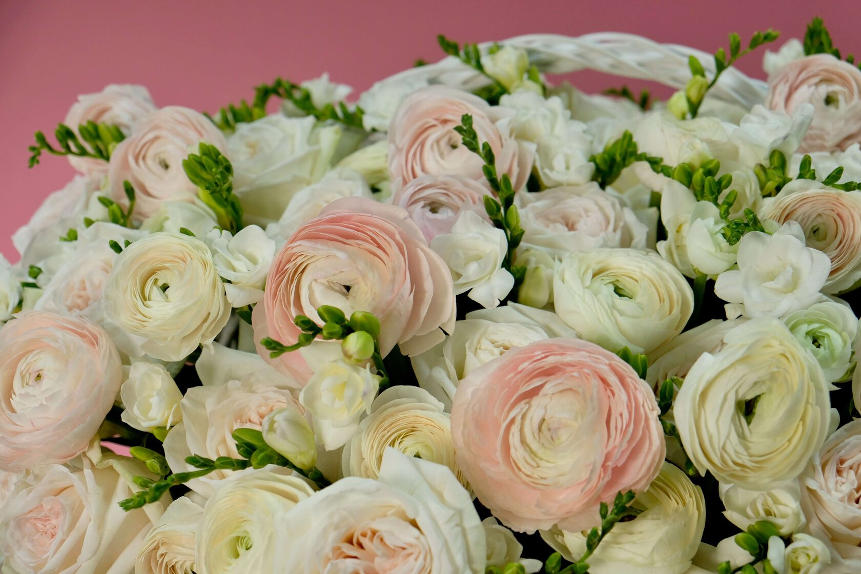 В составе: ранункулюсы, пионовидные садовые розы Вайт Охара, фрезии.